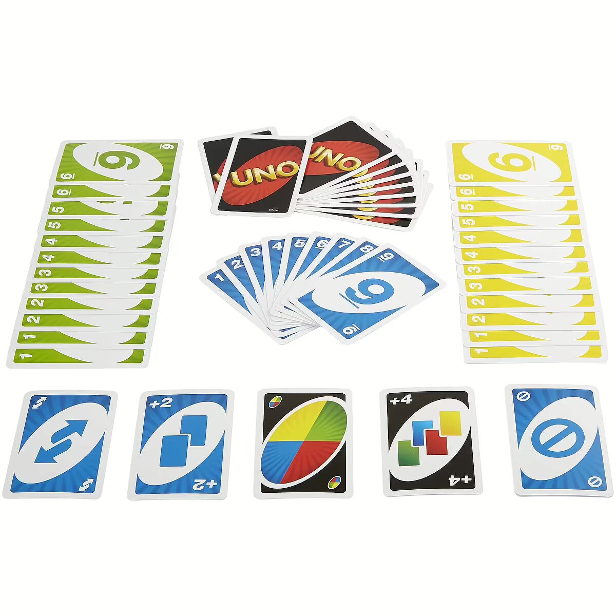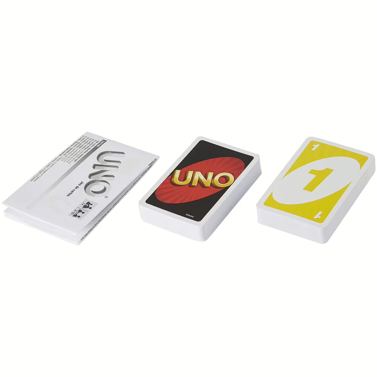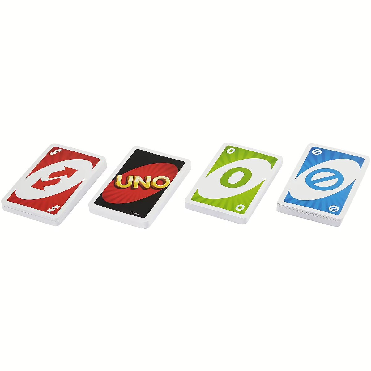 LongDesc - UNO, the classic card game of matching colours and numbers that is easy to pick up…impossible to put down, now comes with customizable Wild Cards for added excitement! Players take turns racing to get rid of all their cards by matching a card in their hand with the current card shown on top of the deck. Special Action cards deliver game-changing moments and help defeat opponents! Use the Swap Hands card to change hands with any other opponent and use the 3 customizable (and erasable) Wild Cards to write your own rules! You’ll find 19 cards of each colour (red, green, blue, and yellow), plus 8 Draw Two, Reverse and Skip cards in every colour, along with 4 Wild Cards, 4 Wild Draw Four cards, 1 Wild Swap Hands Card and 3 Wild Customizable cards. If you can’t make a match, you must draw from the central pile! Don’t forget to shout “UNO” when you only have one card remaining! The player to get rid of all the cards in their hand scores points for any cards their opponents are left holding. The first player to reach 500 points wins. Get Wild 4 UNO! includes 112 cards and instructions.. Colours and decorations may vary.