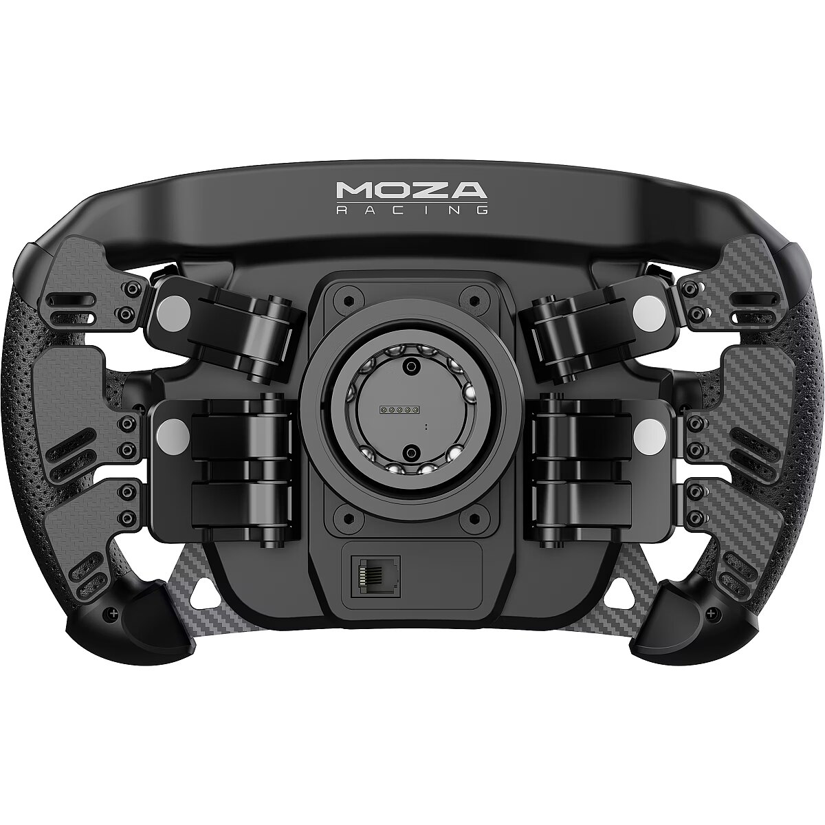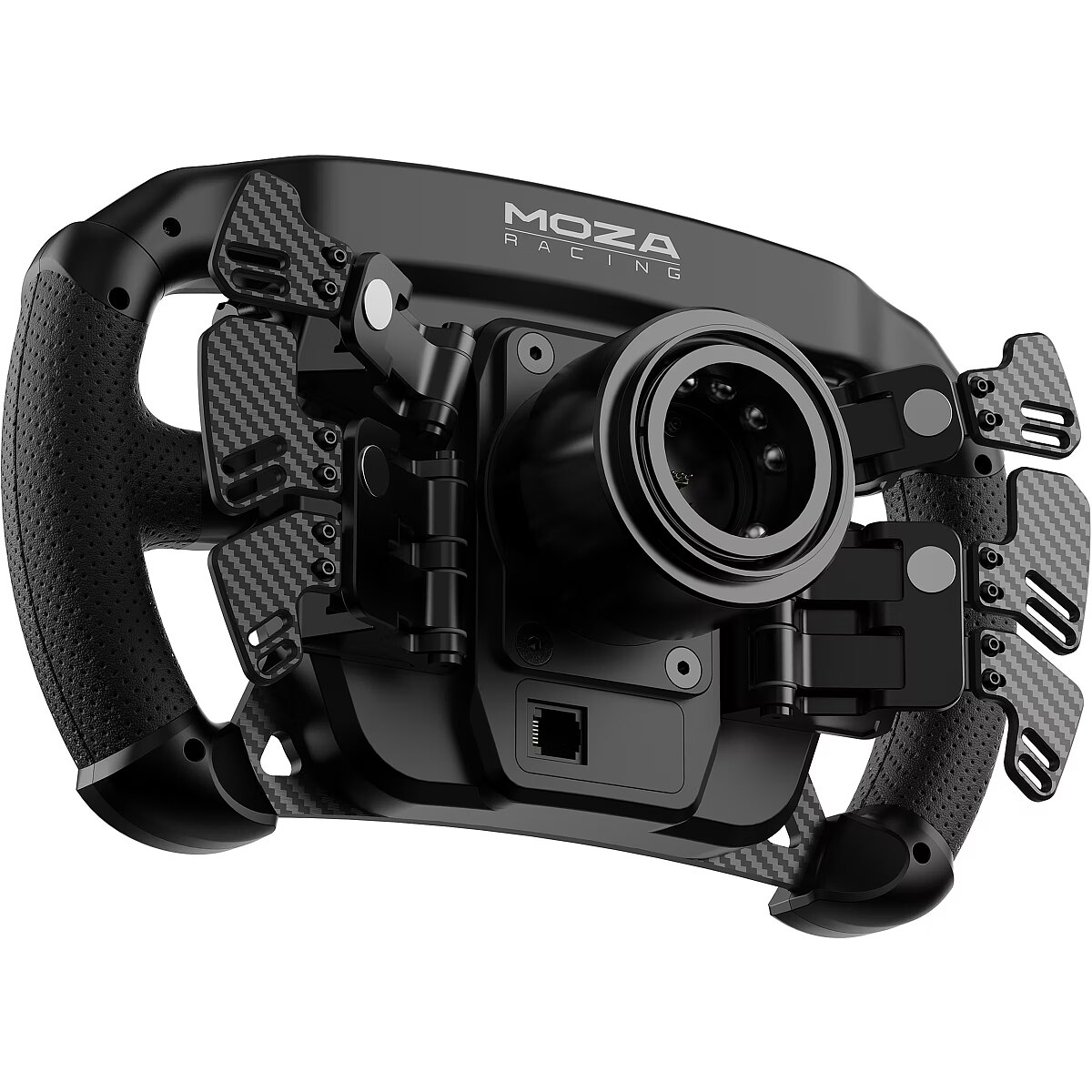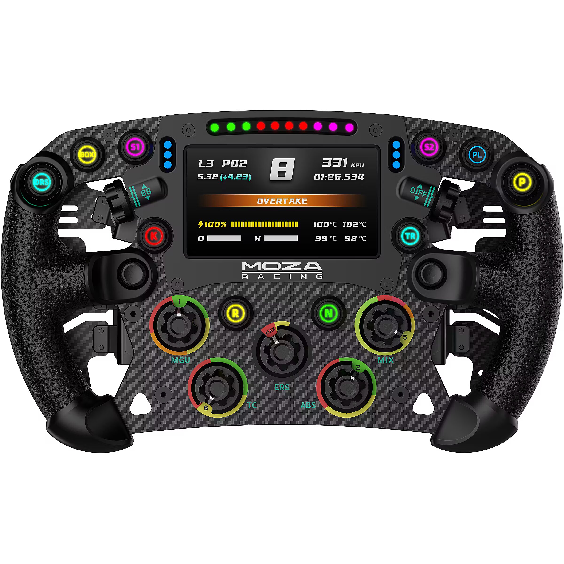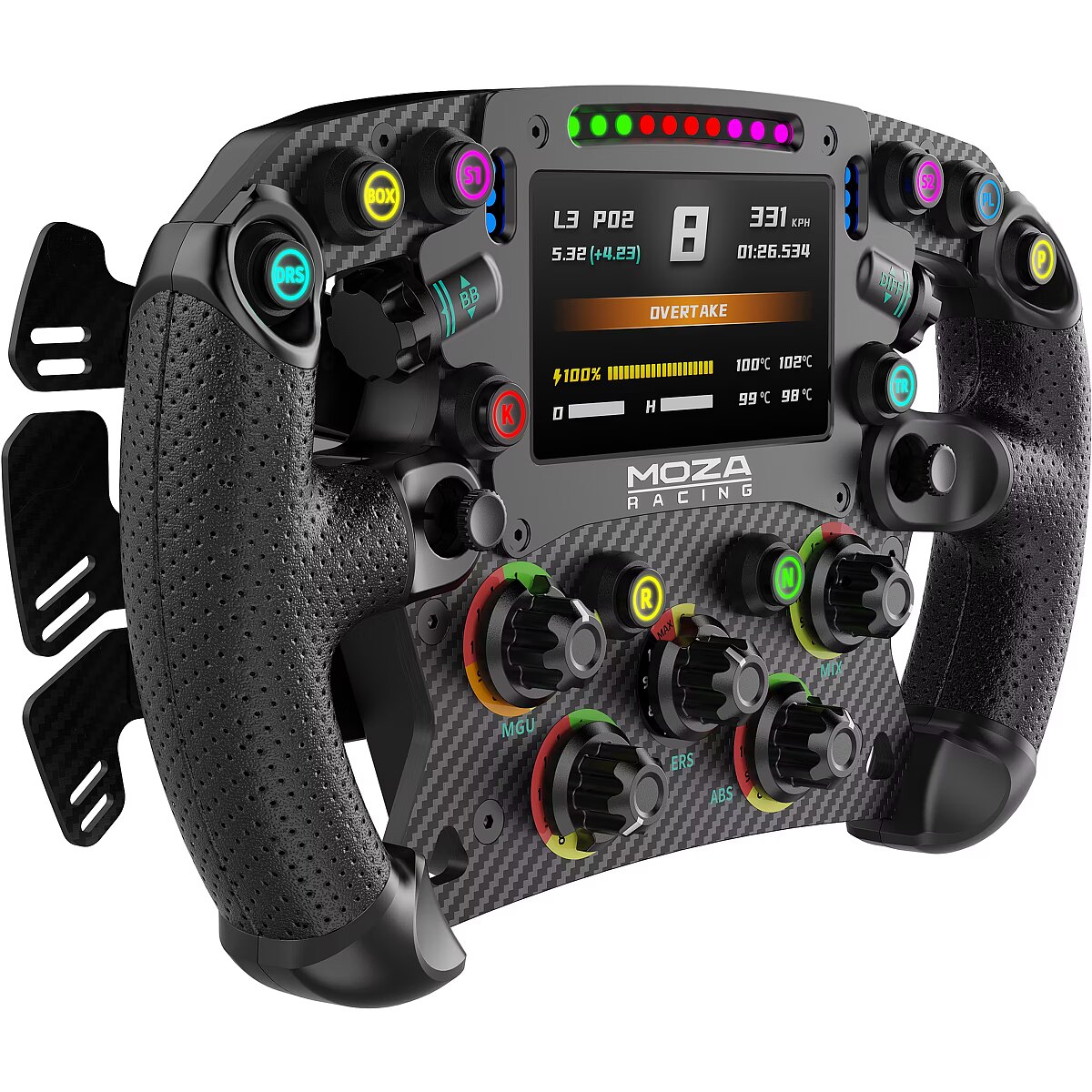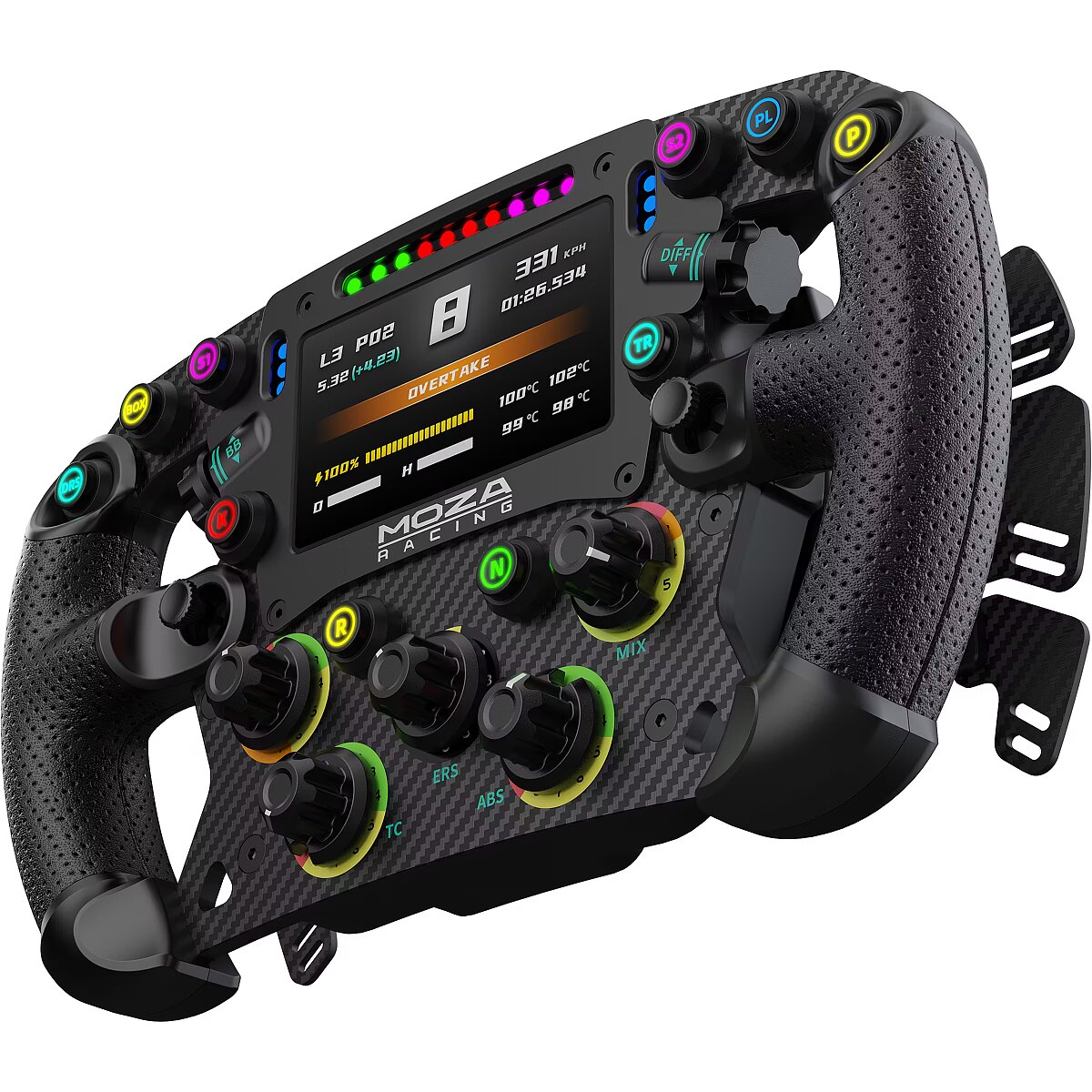 LongDesc - •Size: 280mm formula-style steering wheel•Back Plate Material: Aluminum alloy•Face Plate Material: 5mm-thick 3K twill carbon fiber•Grip Material: Perforated microfiber leather•Display: 4.3-inch touchscreen display•Display UI: Fully customizable •Short-Travel Backlit Buttons: 10•Backlit Color Options for Buttons: 16.7 million colors•Rotary Encoders: 5•Thumb Encoders: 2•7-Way Switches: 2•Signal Lights: 6 LED side-mounted signal lights•Shift Indicator Lights: 10 LED top-mounted shift indicator lights•Adjustable Colors for Shift Lights, Signal Lights, and Button Lights: 16.7 million colors•Shift Paddles: Hall sensor magnetic carbon fiber paddles •Dual Clutch Paddles: Hall sensor magnetic carbon fiber paddles•Smart Telemetry: Supported•Fully Adjustable RPM LEDs through MOZA Pit House: Supported•Release Method: aluminum quick release•Communication Method: Wireless and via conductive slip ring•Compatibility: compatible with all MOZA wheelbases and works with 3rd party wheelbases via MOZA hub.