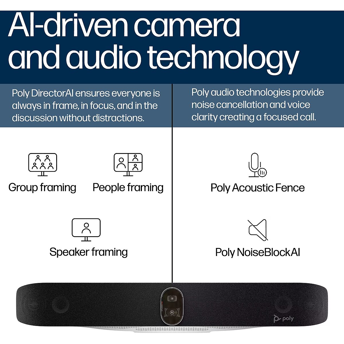 Wyraź swoją obecność dzięki Poly DirectorAI. Dzięki sztucznej inteligencji i uczeniu maszynowemu szereg trybów kadrowania wzbogaca spotkania, lepiej oddając ludzką ekspresję. Możesz całkowicie usunąć niechciane elementy rozpraszające uwagę oraz zamieszanie związane z tym, kto co mówi. Wyraźny, naturalny obraz
