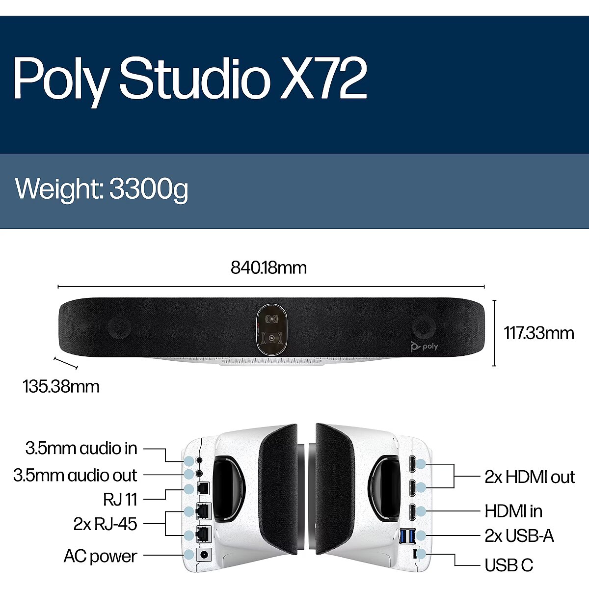 LongDesc - Made for big rooms and even bigger ideasDon’t let the size of the room slow your team down during hybrid meetings. Easily set up the Poly Studio X72 all-in-one video bar with AI-enhanced video and audio technology, seamless scalability and flexibility to join nearly any cloud video call.