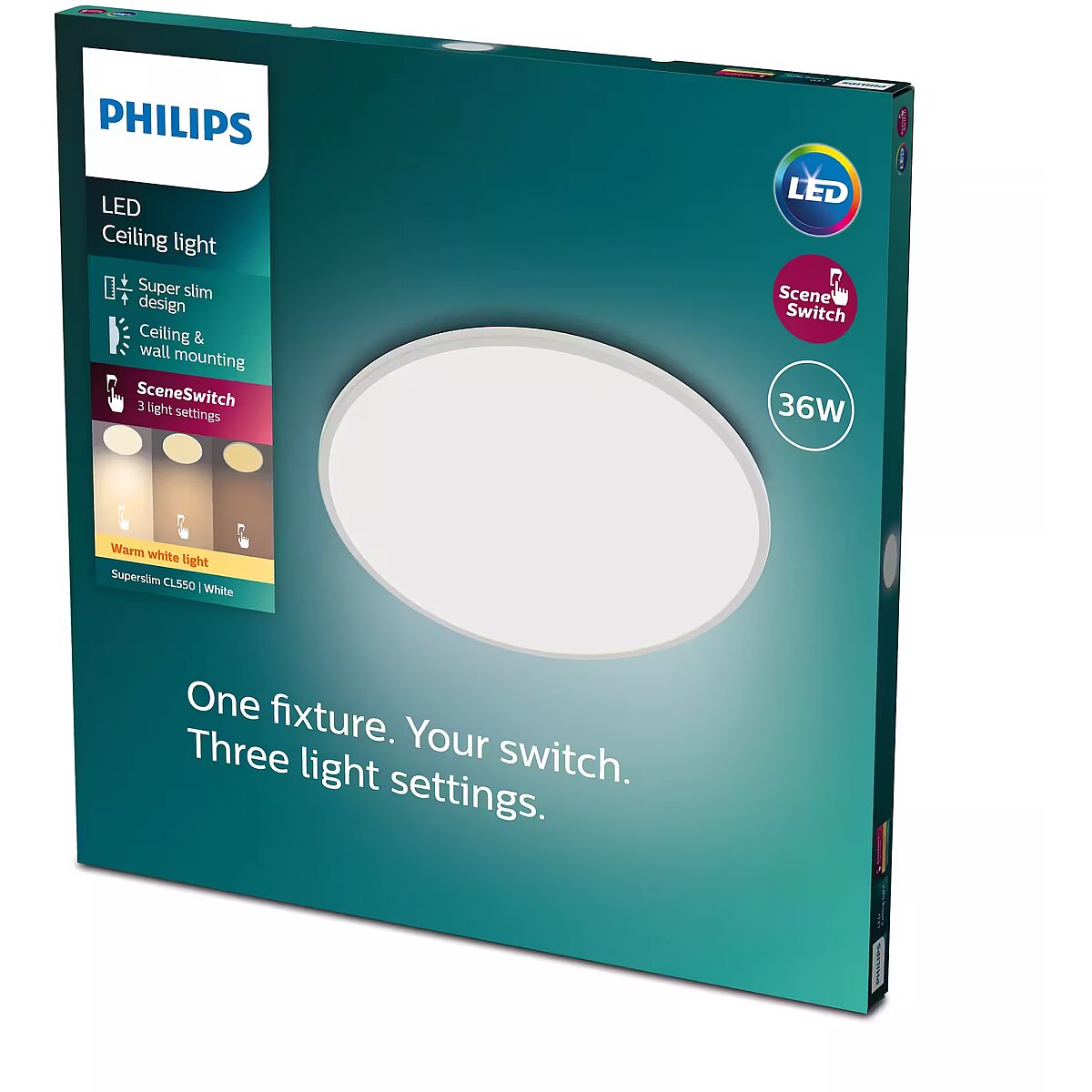 LongSummaryDescription - Philips Functional Super Slim Ceiling Light 36 W. Product colour: White, Suitable location: Bedroom, Shape: Round. Bulb type: LED, Bulb power: 36 W, Colour temperature (min): 2700 K. Power source type: AC, Input voltage: AC 220–240, AC input frequency: 50 - 60 Hz. Width: 550 mm, Depth: 550 mm, Height: 28 mm. Package width: 54.5 mm, Package depth: 3.2 mm, Package height: 55 mm