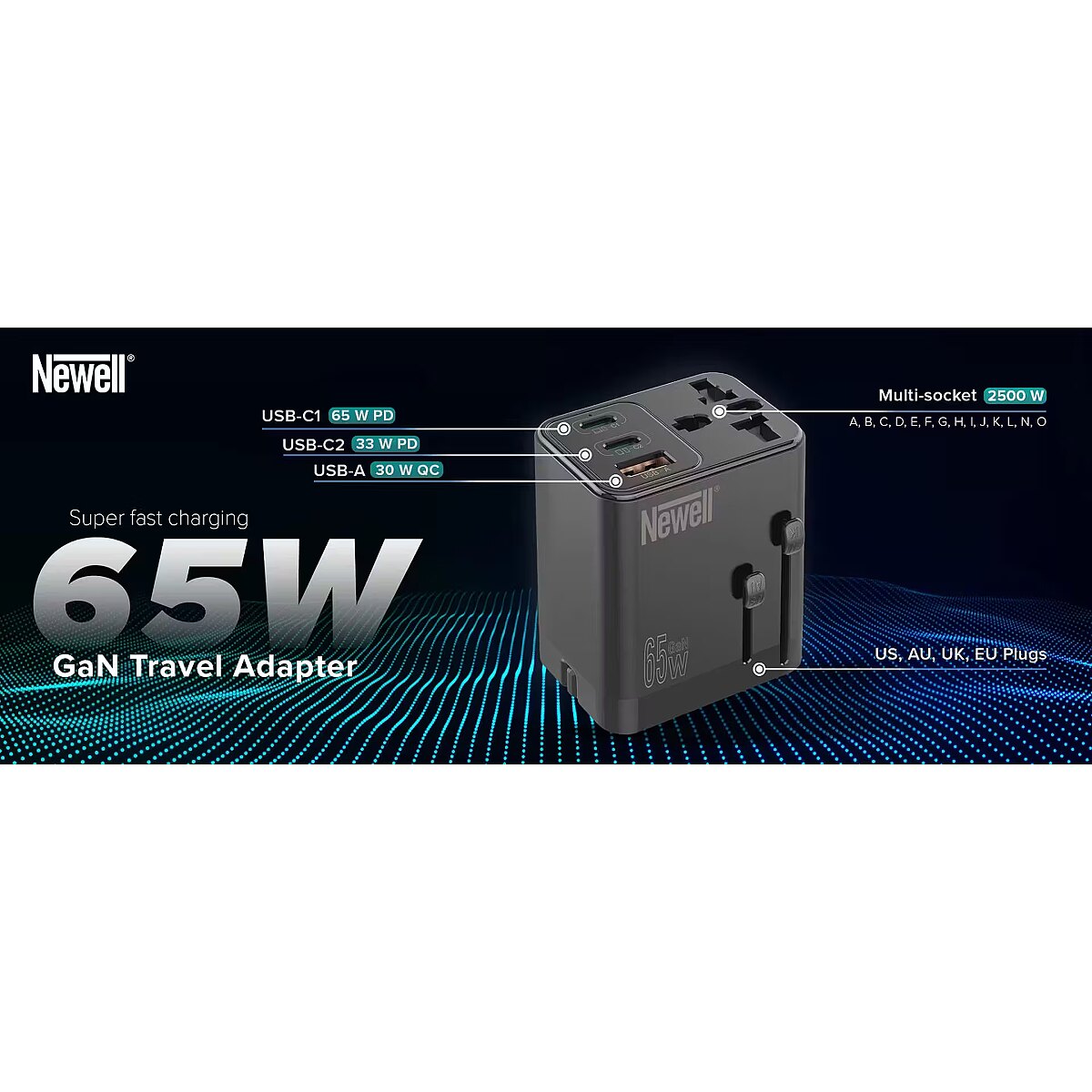 description_en - The Newell GaN 65W Travel Charger is a smart and universal solution for anyone who travels a lot. Whether you're in Australia, the US, the UK or anywhere else in the world, you no longer need to worry about separate adapters. This compact and powerful charger works on multiple continents. Thanks to innovative GaN (gallium nitride) technology, the charger is smaller, faster and more efficient than traditional silicon-based devices. The charger has an AC outlet, one USB-A and two USB-C ports and can charge with a total power of up to 65W - enough to charge multiple devices simultaneously, from smartphones and tablets to laptops. The charger's sliding connectors make it particularly compact and convenient to carry. In addition, it is equipped with a wide range of fast charging standards, such as PD 3.0, QC 4+, PPS and others, ensuring fast and safe charging for almost all devices. One charger that works worldwide GaN technology for speed and energy efficiency Maximum total power: 65W 1 AC outlet, 1 USB-A and 2 USB-C ports Supports over 14 different plug types (including Type A, Type B, Type C, Type D, Type E, Type F, Type G, Type H, Type I, Type J, Type K, Type L, Type N, Type O)* Retractable plugs - saves space in your luggage Charges multiple devices at once Wide range of fast charging standards: PPS, PD 3.0/2.0, QC 4+/3.0/2.0, SCP, FCP, AFC, PE, Apple 2.4A Protection against overheating, overload, overvoltage, overcharging and short circuit * Thre travel adapter is not compatible with Type M socket and plug. This standard is used in Lesotho and Eswatini. It is also found in Hong Kong, India, Mozambique, Namibia, Nepal, Sri Lanka, South American countries and Tahiti.
