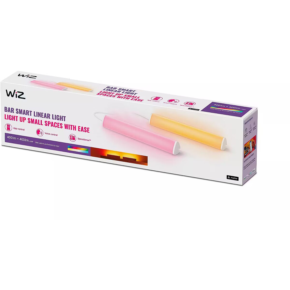 MediumDescription LV - WiZ Bar Linear Light ir plāns un universāls gaismas elements, kas piešķir jūsu telpai krāsainu akcentapgaismojumu plauktiem, stūriem vai sienām. To var noliekt, lai mainītu gaismas staru leņķi, vai savienot ar otru elementu, iegūstot paplašinātus gaismas efektus. • Pilnkrāsu apgaismojums ar dinamiskajiem režīmiem• SpaceSense™ kustības noteikšanas funkcija• No silti baltas līdz auksti baltai gaismai• Wi-Fi viedā vadība bez papildu vadības centra