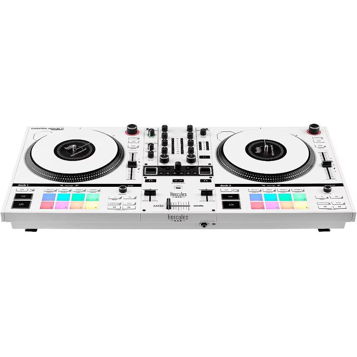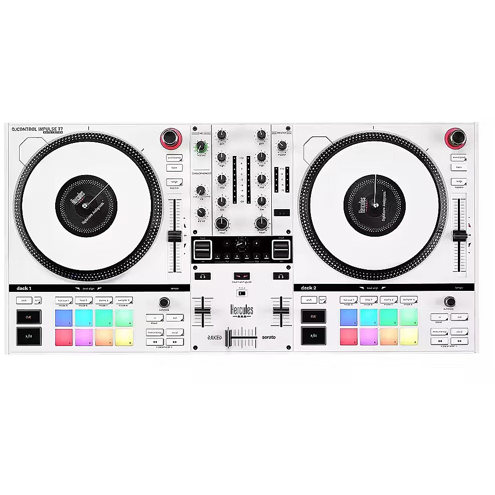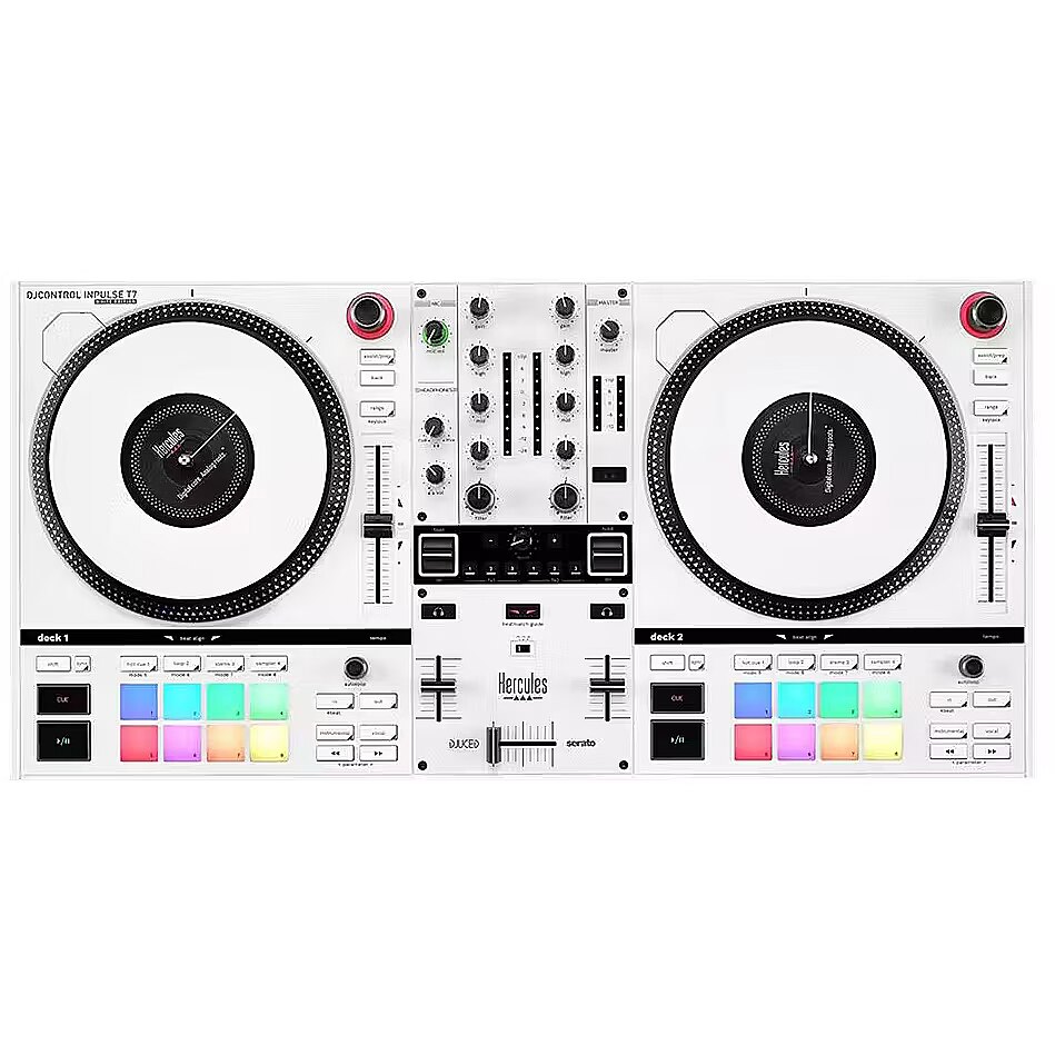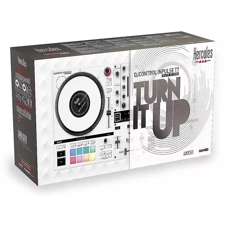 LongDesc - Introducing the DJControl Inpulse T7 White Edition, the latest release from Hercules DJ following the success of the Inpulse range and the DJControl Inpulse T7.Designed with precision and elegance, this model is perfect for both seasoned DJs and beginners. Experience unparalleled control and creativity with features that cater specifically to your artistic needs, like the FX section, the Stems functionalities and so much more.Whether you are performing at a club, a party, or honing your skills at home, the DJControl Inpulse T7 White Edition transforms your music and elevates your performances. Discover the future of DJing with a controller that combines innovation with timeless style.THE DJ CONTROLLER TO HELP YOU START SPINNING ON VINYL!Experience the thrill of vinyl turntables with the Hercules DJControl Inpulse T7 motorized DJ controller. The modern take on a classic tool emphasizes the genuine feeling of vinyl discs, giving you a taste of the past with all the benefits of digital technology. Aspiring DJs, take your first steps towards spinning on vinyl with authentic turntable materials, for authentic DJ moves.A unique motorized DJ controller that will make you stand outDJs can precisely blend and beatmatch thanks to the standard-sized 7" platters that quickly accelerate from 0 to 33⅓ RPM. Additionally, they can remove the vinyl discs and slipmats from the platters, recreating an authentic turntable experience in a digital format.It’s your turn to get creativeStems – the essential, real-time audio separation tool every DJ needs. With one-button controls to isolate vocals or instrumentals, DJs can effortlessly create personalized mixes on the fly. The possibilities for creating new mashups and blends are endless. Available in DJUCED and Serato DJ.Perfect your transitionsEquipped with three FX Select buttons, a paddle, and a Filter knob for each deck, along with an extra control knob and Beat -/+ buttons, the DJControl Inpulse T7 White Edition offers DJs the tools to fine-tune their mixes and transitions using a wide array of effects.Equipped with powerful learning toolsThe controller's interactive features, like the Beatmatch Guide and Intelligent Music Assistant (IMA), offer real-time feedback to help users quickly develop their skills. The Beatmatch Guide shows how to adjust the tempo fader or jog wheel for beatmatching, while the IMA suggests the best upcoming tracks based on energy, key, and tempo.