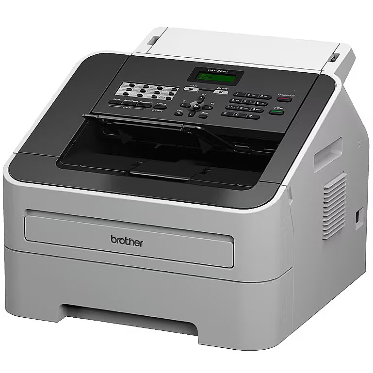 LongSummaryDescription - Brother FAX-2840. Print technology: Laser, Modem speed: 33.6 Kbit/s, Fax resolution modes: Fine, Photo, Standard, Super fine. Noise level: 53 dB, Product colour: Black, Grey, Noise level (idle): 30 dB. Maximum copy resolution: 300 x 600 DPI, Copy speed (black, normal quality, A4): 20 cpm, Maximum number of copies: 99 copies. Maximum standard media size: A4, ISO A-series sizes (A0...A9): A4, A5, A6, Supported media weight(s): 60 - 105 g/m². Standard input capacity: 250 sheets, Auto document feeder (ADF) input capacity: 20 sheets, Standard output capacity: 100 sheets