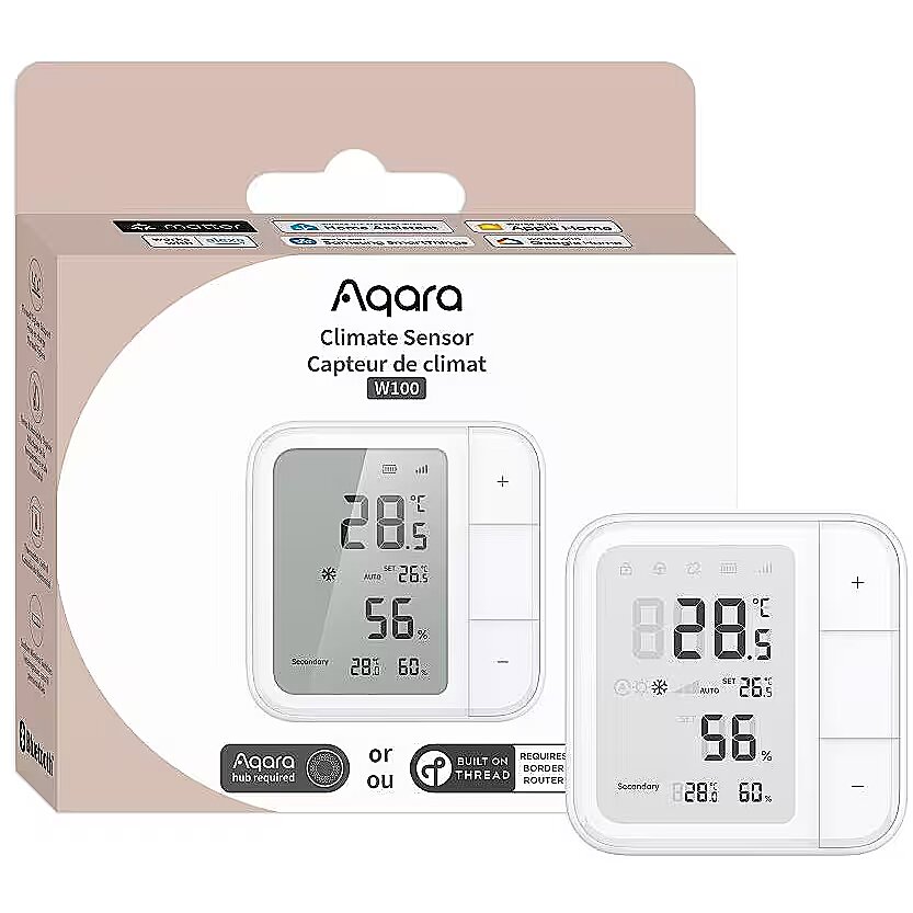 Description - Aqara Climate Sensor W100 Monitor temperature & humidity in real time with the Aqara Climate Sensor W100. Dual-protocol, Matter-compatible, smart buttons & HVAC control support. Smarten up your comfort with style and precision A high-precision sensor with a 3.4-inch LCD screen monitors temperature and humidity in real time. Supporting Zigbee and Thread, it integrates with third-party ecosystems or connects via an Aqara hub for extended features like remote HVAC control. With 3 customisable buttons for up to 9 actions, it enhances comfort, energy efficiency, and smart home automation. Aqara Climate Sensor W100 Features: Dual-Protocol with Matter Compatibility: Supports both Matter over Thread① and Zigbee②. The Matter compatibility ensures integrating seamlessly with third-party ecosystems such as Apple Home, Amazon Alexa, Google Home, etc. creating a more comprehensive and unified experience that is future-proof and highly adaptable. While Zigbee with an Aqara hub helps users experience exclusive Aqara Home features. You can switch③between desired protocols based on preference. 3 Smart Button Customisation: Equipped with 3 customisable buttons, supporting single, double and long press operations, enabling up to 9 automations or scene configurations④. Whether you want to turn on/off your device through wireless control, or switching to comfort mode with one button, the flexibility allows you to easily create an ideal living environment, adjust home comfort in real time. Precision Sensor with LCD Display: This device features a high-precision temperature (±0.2℃) and humidity (±2%RH) sensor, along with a 3.4-inch LCD screen for real-time environmental data. It not only enhances home comfort but also ensures optimal conditions for storage, greenhouses and a healthy environment for sensitive groups. External Sensor Integration: In Zigbee mode, the device can connect to an Aqara temperature and humidity sensor⑤ to display additional data in the secondary screen area⑥, allowing users to monitor conditions in different locations simultaneously. If no external sensor is connected, the secondary screen area defaults to local temperature and humidity information, helping users easily understand their environment and maintain a comfortable living space. HVAC Remote Control Integration: The sensor can be paired with an Aqara thermostat⑦ via an Aqara hub OR a third-party IR air conditioner via Aqara Hub M3 to enable wireless remote control of the HVAC system. This allows you to adjust the temperature, humidity, mode, and other settings directly from the device, automatically adjusting the environmental comfort and improving energy efficiency without actually visiting the HVAC unit. Long Battery Life with Configurable Performance: Powered by 2 CR2450 batteries, the device delivers an impressive battery life of up to 2.4 years on Zigbee mode and 2.3 years on Thread mode⑧ with regular use. You have the flexibility to adjust the sensor’s sampling and reporting frequency⑨ to further balance performance with power consumption. This adaptability ensures reliable, long-term functionality with minimal maintenance, providing a seamless and hassle-free smart home experience.