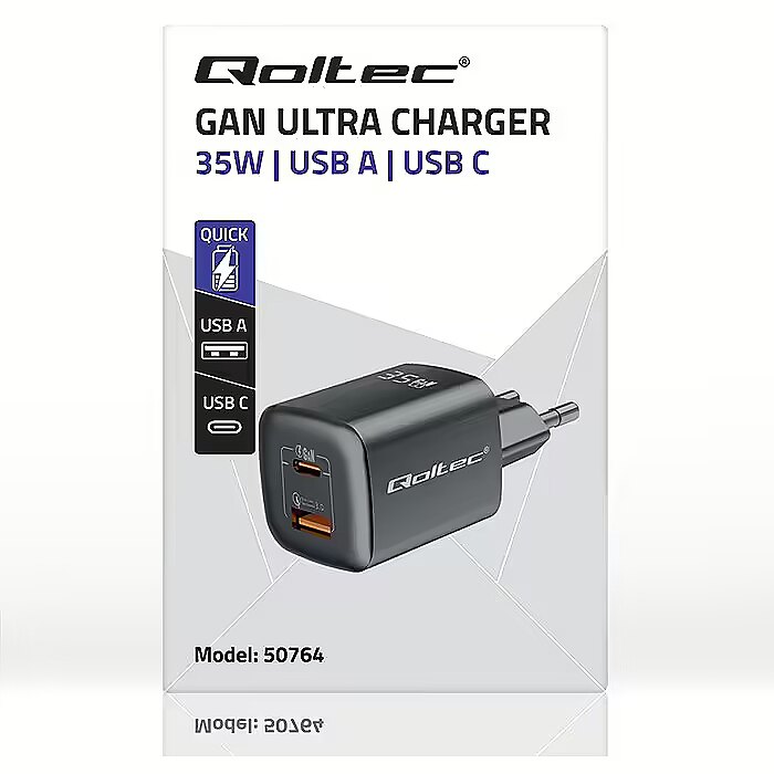 Qoltec 50764 GaN ULTRA 35W charger / 5-20V / 2.25 3A / 1 x USB type C PD / 1x USB / Black