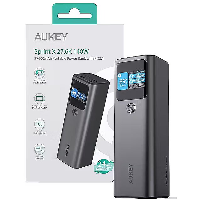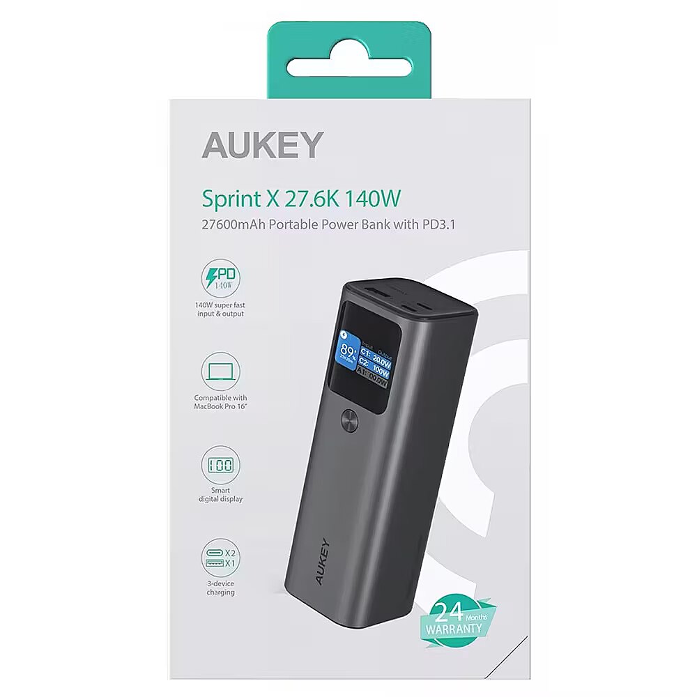 Description - AUKEY PB-Y45 Sprint X 27.6K 140W 27600mAh przenośny power bank z PD3.1 Mocny 140 W PD szybko ładuje nawet duże laptopy Możliwośc ładowania 3 urządzeń jednocześnie (2xUSB-C oraz 1xUSB-A) Duża pojemność 27600mAh Intuicyjny wyświetlacz cyfrowy Szybkie ładowanie WEJŚCIE I WYJŚCIE Ładuj laptopy - Niesamowite, szybkie ładowanie 140 W dużych laptopów. Ładowanie dwukierunkowe - Obsługuje zarówno szybkie ładowanie, jak i ładowanie doładowujące. Pojemność 27600mAh - co pozwala na wielokrotne ładowanie telefonów komórkowych i innych urządzeń Praca jednoczesna - Ładuj 2 laptopy z pełną prędkością jednocześnie Jednoczesne ładowanie - Ładuj 3 urządzenia jednocześnie przez 2 porty USB-C i 1 port USB-A. Szeroka kompatybilność - Bezpieczne ładowanie iPhone'ów, iPadów, MacBooków Air Pro i innych laptopów. Przejrzysty wyświetlacz poziomu naładowania baterii - Dzięki inteligentnemu wyświetlaczowi cyfrowemu możesz monitorować napięcie wejściowe i wyjściowe oraz poziom naładowania, aby mieć pewność, że Twoje urządzenia ładują się wydajnie i bezpiecznie. Wielorakie zabezpieczenia - Zabezpiecz swoje urządzenia dzięki zabezpieczeniom przed zwarciem, przepięciem, przetężeniem i przegrzaniem.