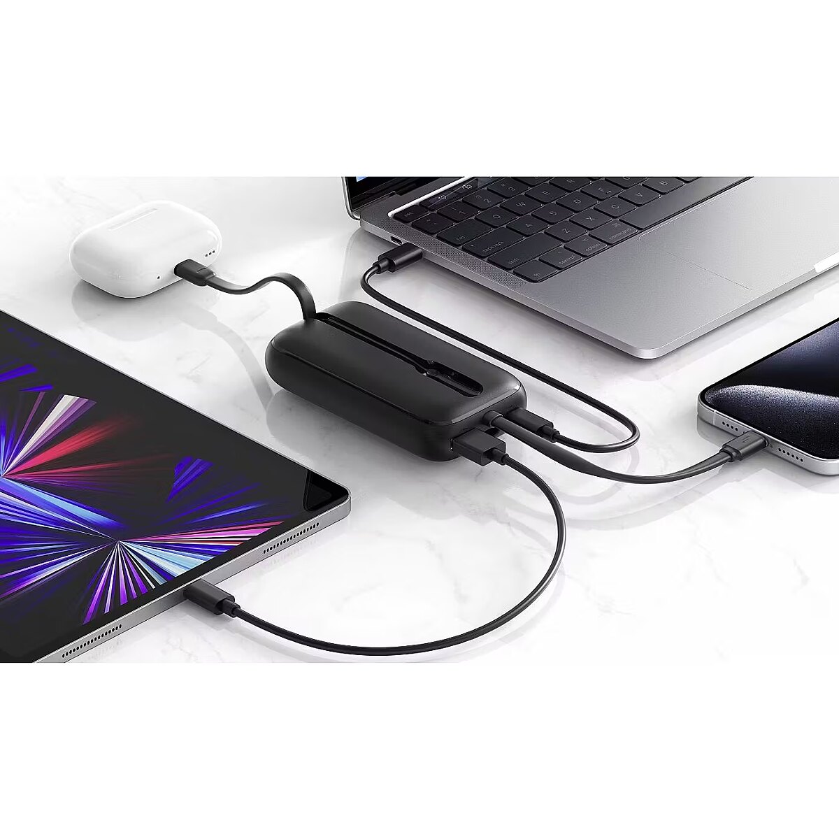 Встроенные кабели USB-C и Lightning обеспечивают гибкость и удобство, позволяя заряжать как устройства Android, так и Apple без дополнительных аксессуаров. Порт USB-A также обеспечивает выходную мощность до 22,5 Вт, что делает его универсальным для различных устройств.