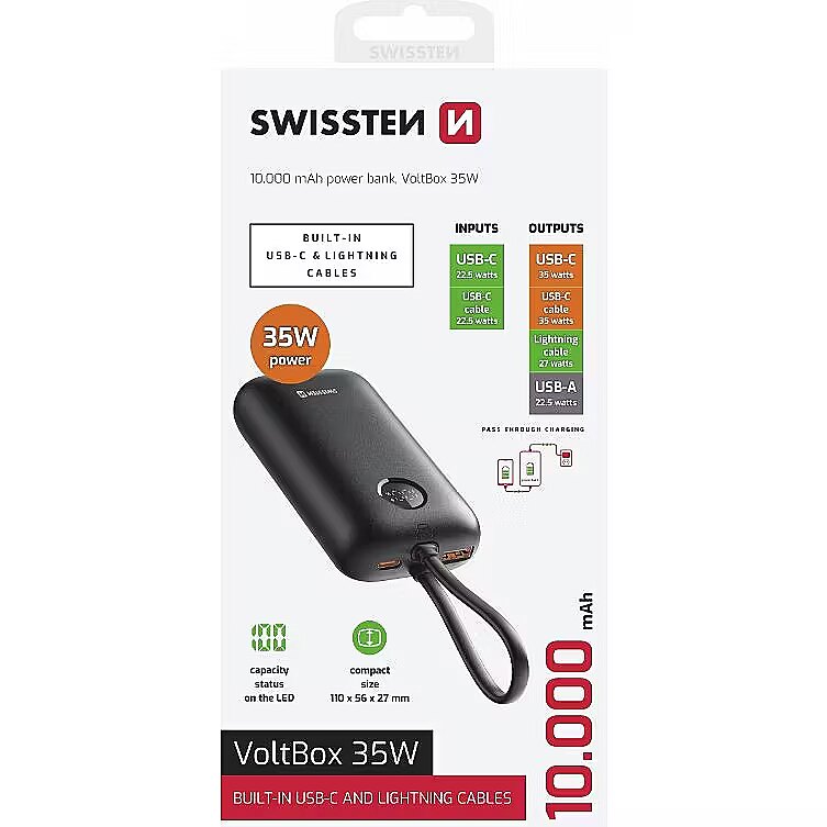 description_en - The SWISSTEN POWER BANK VOLTBOX 35W 10,000 mAh is a powerful solution designed for modern users who need to charge multiple devices simultaneously. It comes with integrated USB-C and Lightning cables, so you no longer need to carry extra cables. 35W High-Speed Charging