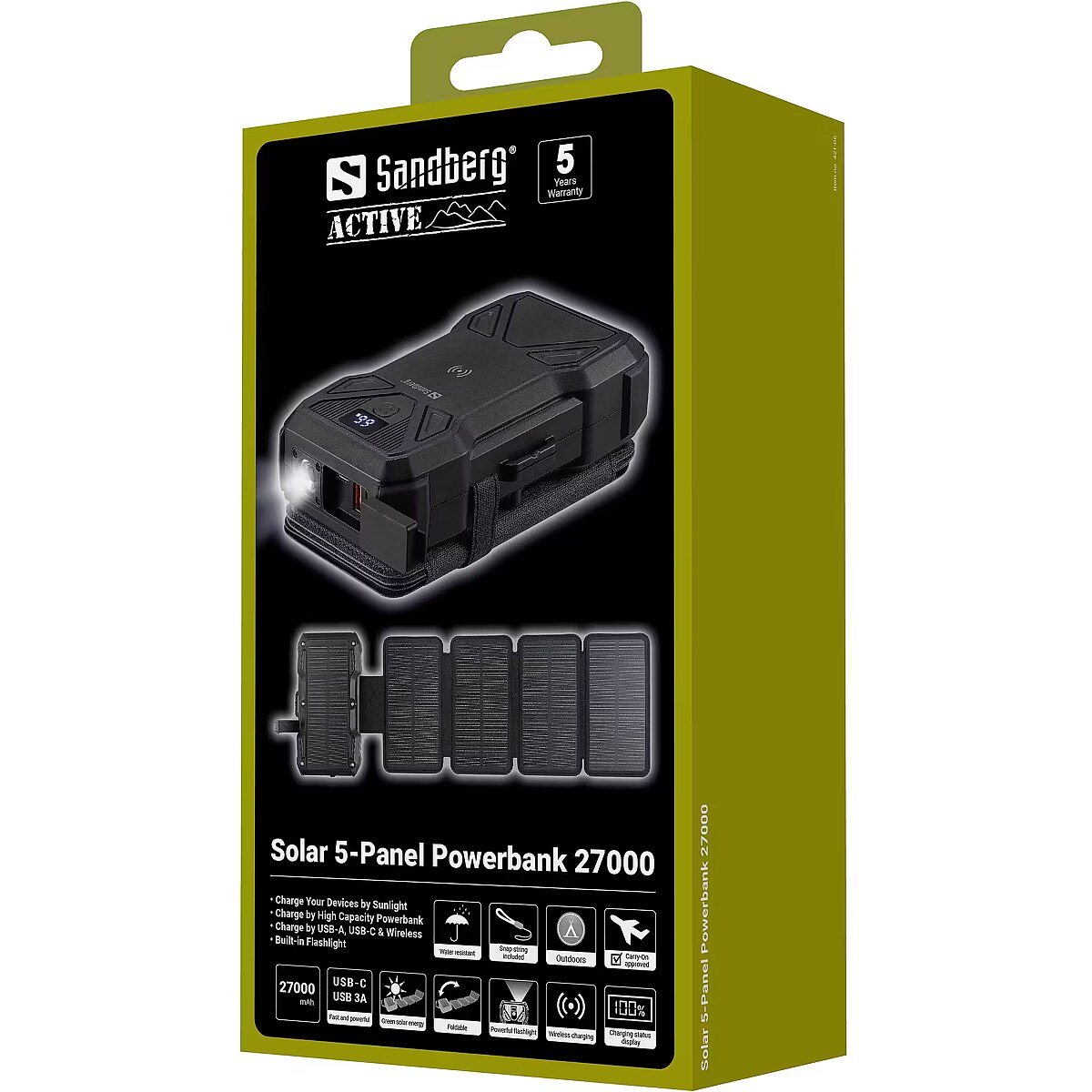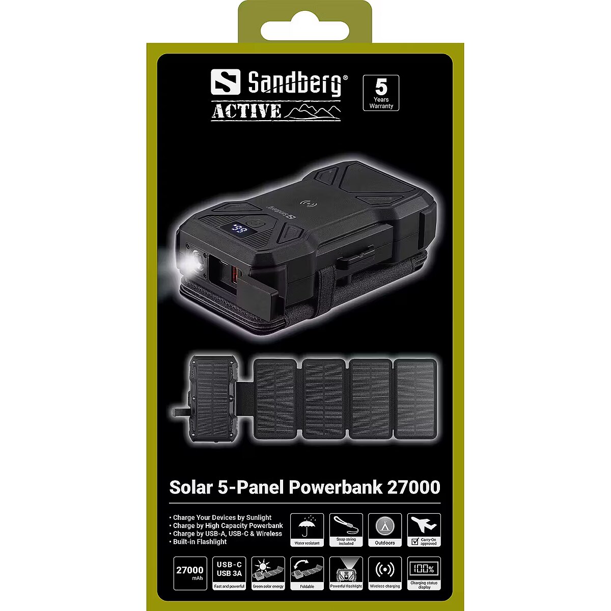 LongSummaryDescription - Sandberg Solar 5-Panel Powerbank 27000. Battery capacity: 27000 mAh, Fast charging technology: Programmable Power Supply (PPS), Wireless charging. Output current: 5 A. Product colour: Black