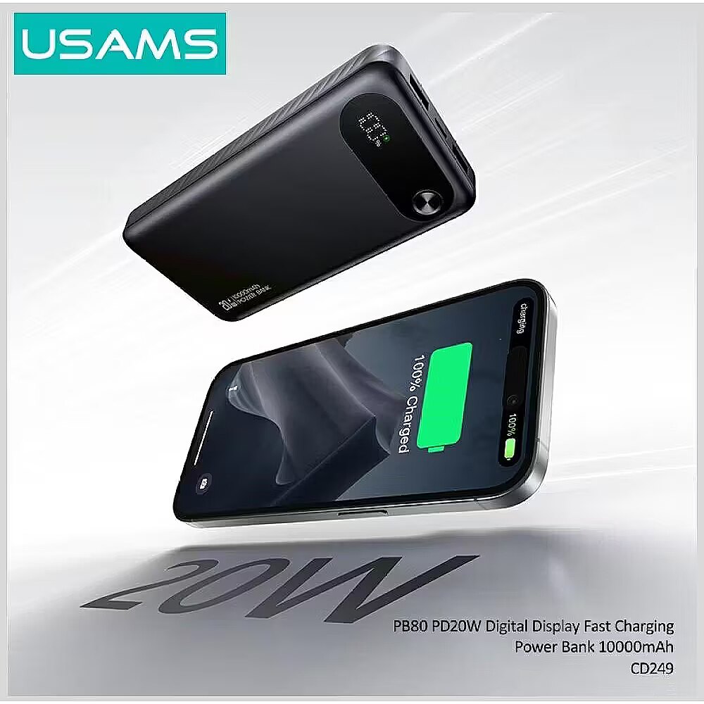 Description - Powerbank USAMS PB80 PD20W 10000mAh Powerbank USAMS PB80 PD20W 10000mAh is an efficient and reliable energy source designed for users who value mobility, modern design and fast charging. Thanks to the capacity of 10 000 mAh, it allows you to charge your smartphone, headphones, smartwatch or other mobile devices several times, which makes it perfect for travel, at work or on a daily basis. Power Delivery 20W technology supports instant charging of compatible devices such as iPhone, Samsung, Xiaomi or Huawei smartphones. Powerbank automatically recognizes the connected device and adjusts the appropriate power, which ensures fast and safe charging. The model is equipped with three output ports one USB-C and two USB-A thanks to which it is possible to charge several devices at the same time. The USB-C port also acts as an input for charging the powerbank itself, which increases its practicality. On the case there is a clear LED display, which in percentage shows the battery level, allowing you to control the state of energy at any time. The housing made of durable ABS and polycarbonate (PC) materials guarantees resistance to scratches and mechanical damage, and its ergonomic shape makes the powerbank confidently lie in the hand and easily fits in a pocket or bag. USAMS PB80 has a set of advanced protections to protect against overcharge, overvoltage, overheating and short circuit, ensuring complete safety during use. It is an ideal choice for people who need a strong, compact and elegant powerbank with a quick-charging function, ready to operate in any situation.