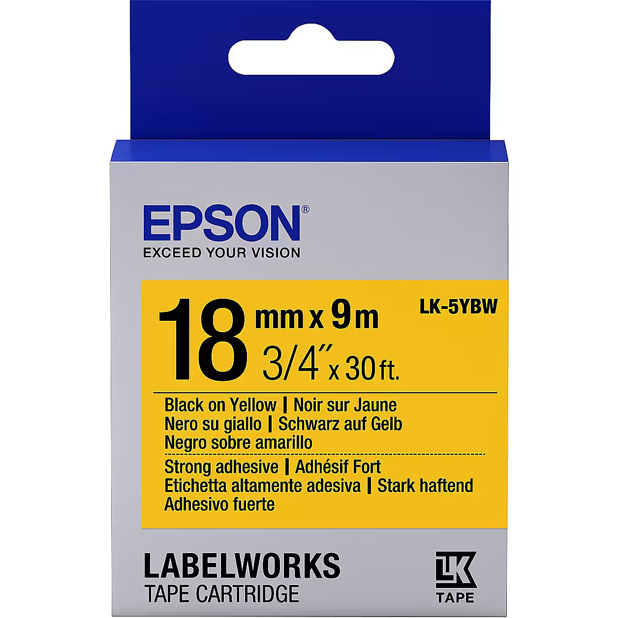 ShortSummaryDescription - Epson Label Cartridge Strong Adhesive LK-5YBW Black/Yellow 18mm (9m), Black on yellow, Japan, LabelWorks LW-1000P LabelWorks LW-400 LabelWorks LW-400VP LabelWorks LW-600P LabelWorks LW-700..., 1.8 cm, 9 m, 1 pc(s)