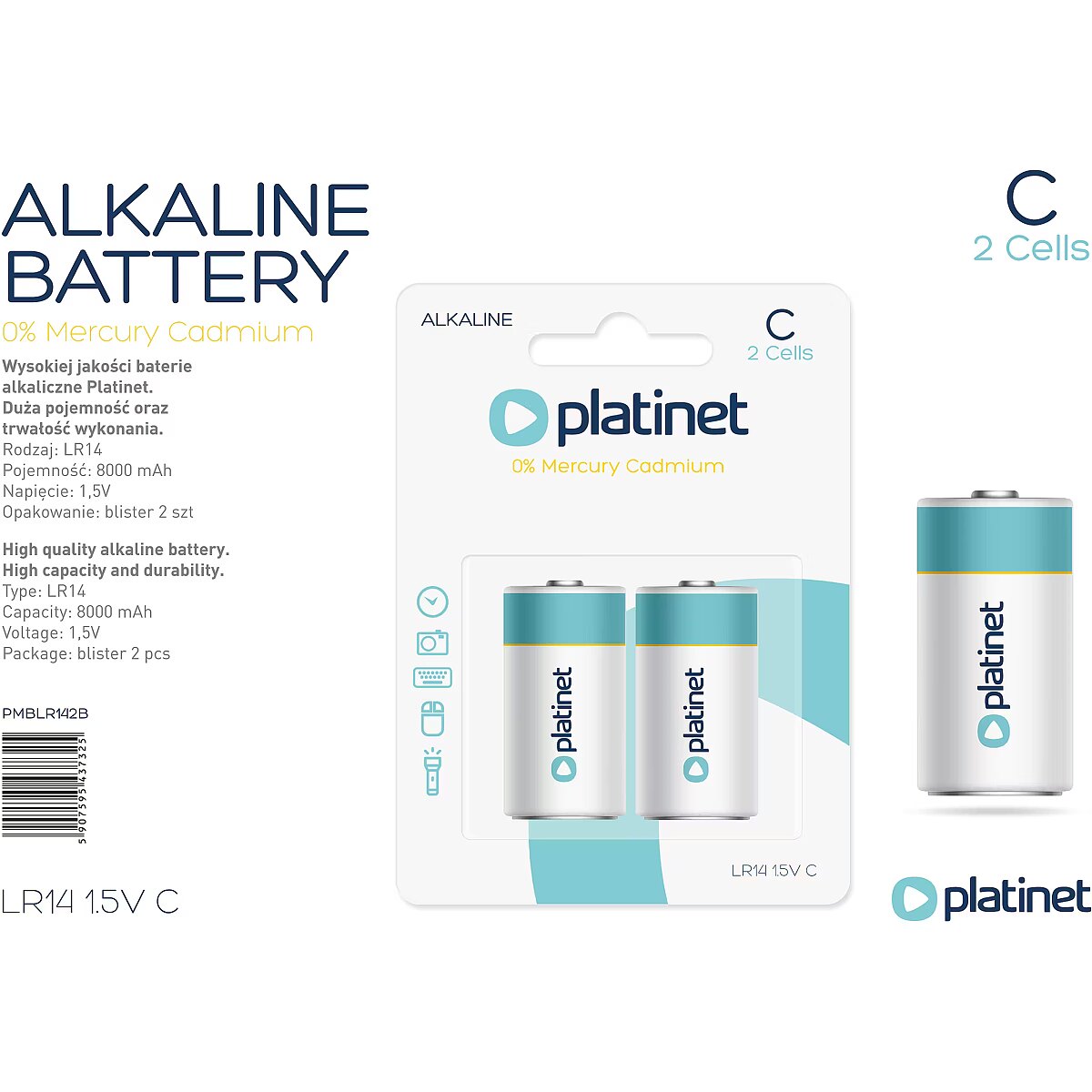 LongSummaryDescription - Platinet Battery Type LR14 (2 pack), Capacity 8000 mAh each, Blister packaging. Battery type: Single-use battery, Battery size(s): LR14, Battery technology: Alkaline. Package type: Blister