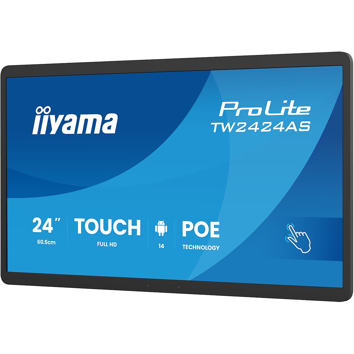 LongDesc - The ProLite TW2424AS-B3P interactive Touchpanel-PC is a perfect choice for high-use environments. The IPS panel, integrated in a slim and elegant bezel, delivers both excellent colour performance with wide viewing angles and noticeably sharper images. The In-cell 10tp PCAP touch technology ensures a fluid and natural touch experience. This monitor can operate in landscape, portrait and face-up orientation in 24/7 operating time. Thanks to the pre-installed Android 14 operating system, it is possible to easily customize the monitor by installing applications directly to it. In combination with the 32GB storage, Wi-Fi connection, LAN (RJ45) and Bluetooth connectors, it makes the monitor especially suited for POS systems or information points in retail shops to educate customers about your products, as well as virtually limitless smart home applications. Thanks to Power over Ethernet (PoE), both power and data are delivered through a single cable, simplifying installation and reducing additional cables. Additionally, it integrates effortlessly with iiSignage² , iiyama’s Content Management System (CMS), giving you full control over your messages and advertising.