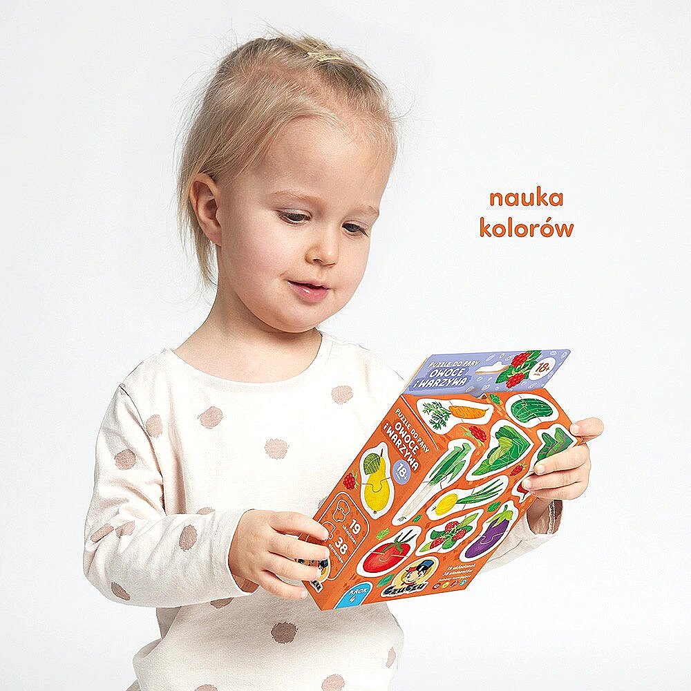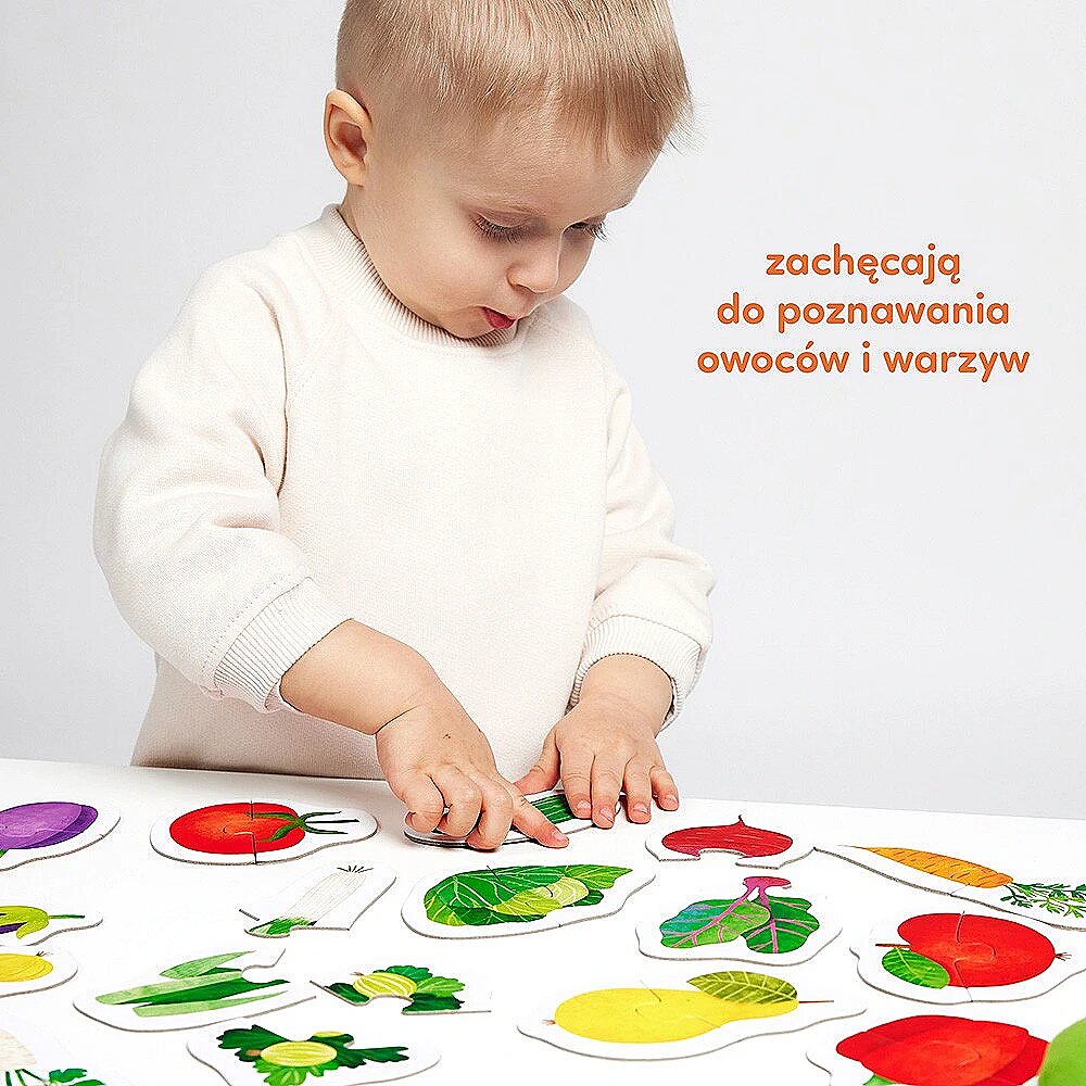 Description - Puzzle Pair Puzzle - Fruits and Vegetables Time for some delicious fun - find and match the halves of vegetables and fruits! The brightly colored puzzles present healthy delicacies from the garden and orchard. Finding and matching the halves is a comprehensively developing game that improves hand-eye coordination and allows you to learn and consolidate new words and knowledge about the world around us in a fun way. A unique feature: puzzles inspire comprehensively developing games. Hey, kids! Do you know what grows in the garden and orchard? The Fruits and Vegetables Pair Puzzle is an educational set that contains 19 colorful, two-piece puzzles! Have fun together in many ways: Put together the puzzle Finding matching halves improves your observation skills. Matching them is a great exercise for fine motor skills. You can start by playing with a smaller number of puzzles and gradually increase their number. Learn new words Use the game to learn new words. Name the fruits and vegetables in the illustrations, their colors and individual elements. Draw your child's attention to the similarities and differences between the pictures. Riddles Ask your child various questions. What is red? What can you make soup from? Which leaves can you eat? Your toddler can answer or show the answers with his or her finger. Switch roles! What is it? Was ist das? You can also use the pictures to learn another language. Cooking together Compare the illustrations with real fruits and vegetables. It's time to get to know them with all your senses: touch, smell and taste. Get inspired and prepare something delicious together. Older children can use the elements to create their own illustrations. The elements will be useful when playing shop and cooking. Delicious fun, start!