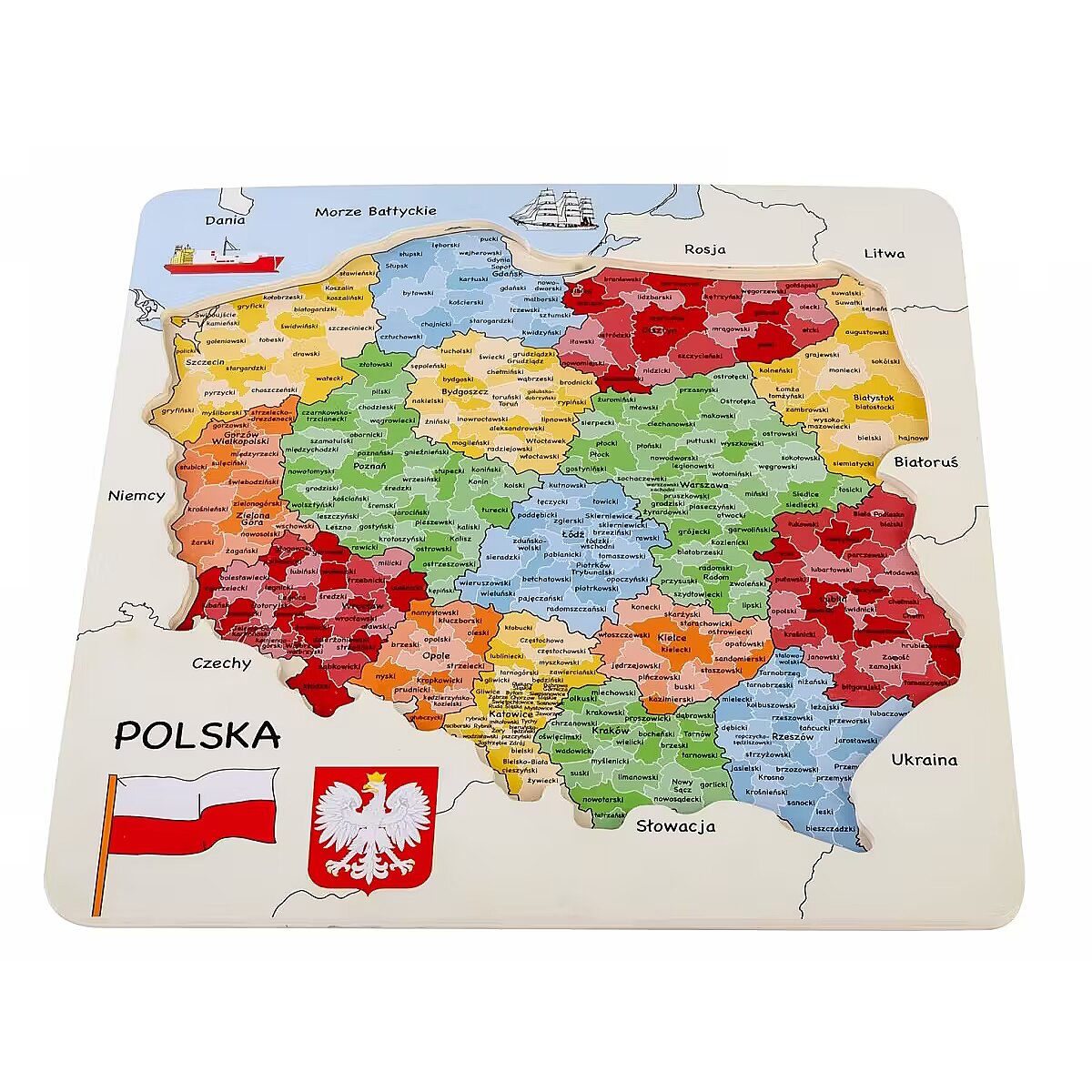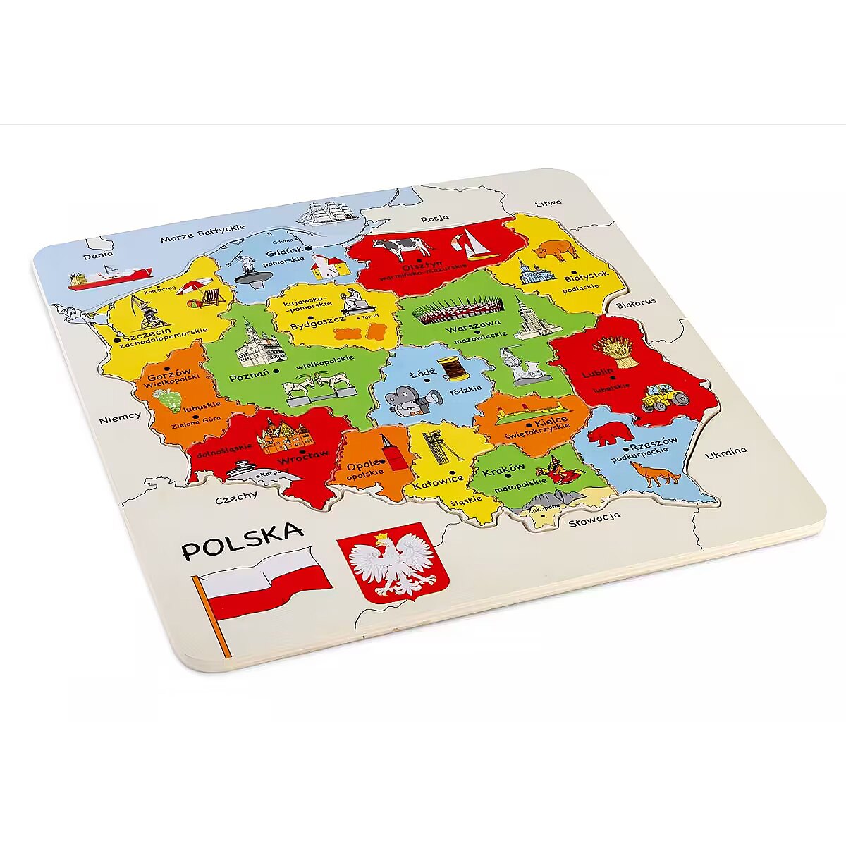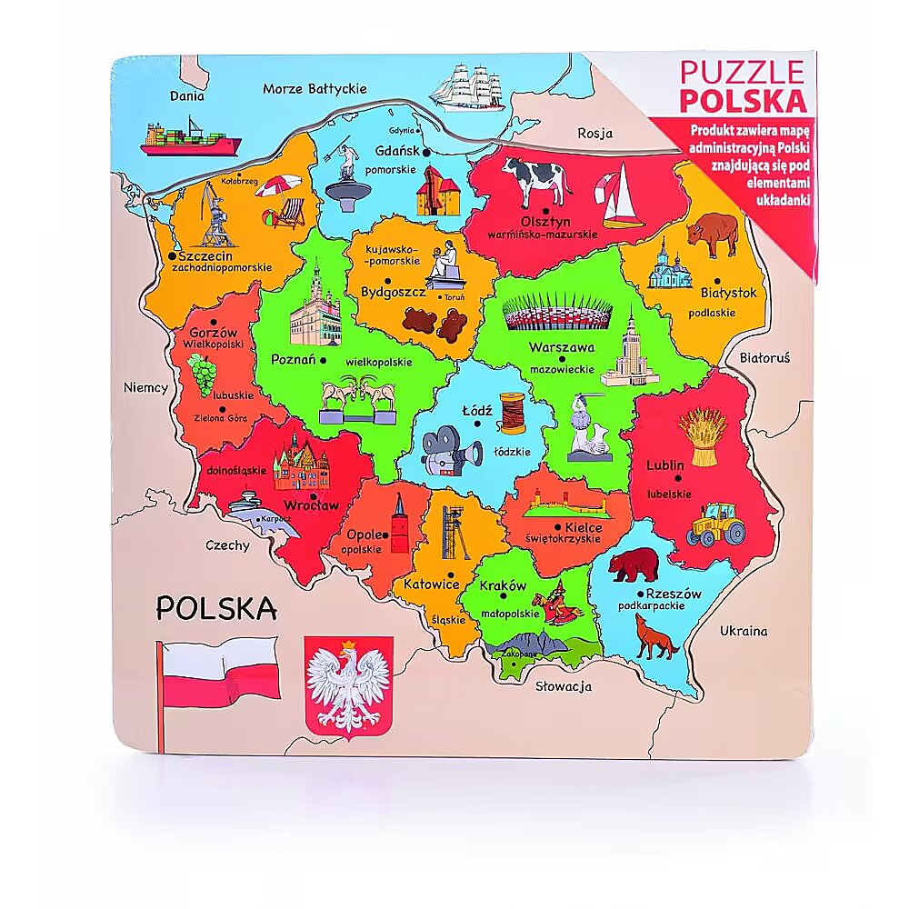 Description - Mapa Polski Puzzle Edukacyjna drewniana układanka rozwijająca zdolności manualne jednocześnie przekazując ciekawe informacje na temat charakterystycznych elementów związanych z różnymi regionami Polski. Puzzle POLSKA, przestawiają województwa z ich popularnymi symbolami. Pod wierzchnią warstwą puzzli znajdziemy mapę administracyjną Polski z podziałem na powiaty.