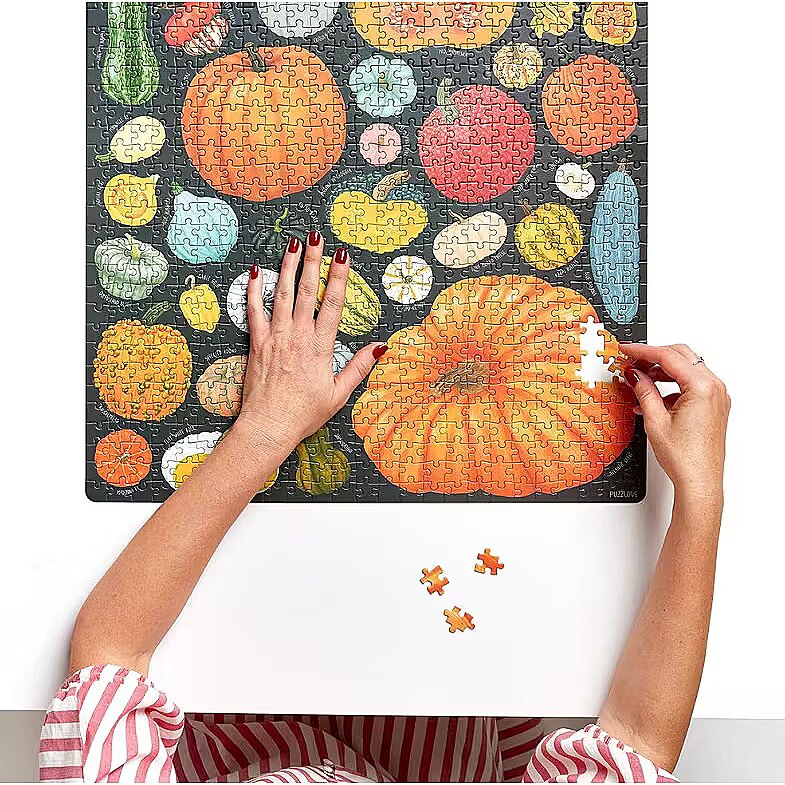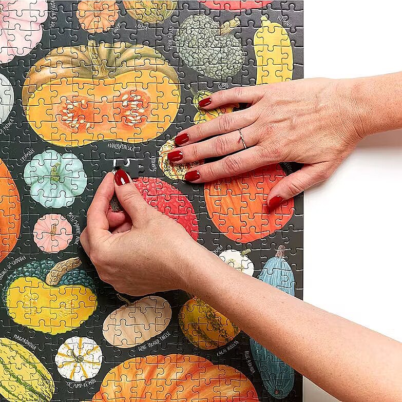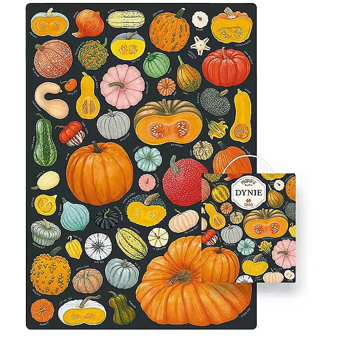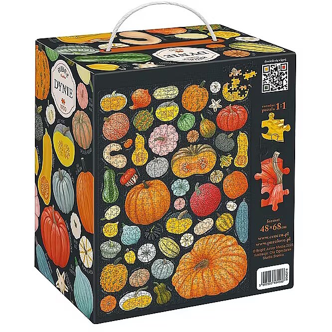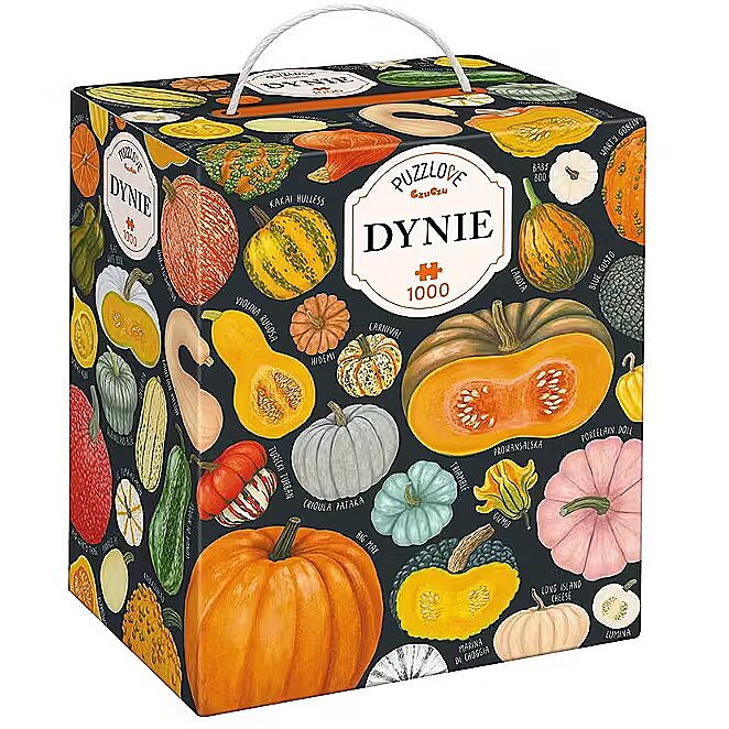 Description - Puzzlove grządki znowu obrodziły! Zaparz ulubioną aromatyczną herbatę lub pumpkin spice latte i odpocznij tak, jak lubisz! Kilkadziesiąt imponujących dyń prosto z pola tworzy dużą, piękną ilustrację. Czy znasz wszystkie odmiany? Ułóż 1000-elementowe puzzle i przywołaj złotą polską jesień. Sezon na puzzle trwa cały rok! Puzzlove Dynie to wyjątkowo smakowite puzzle, które mają 1000 elementów. Ich ułożenie to wyzwanie, ale i sposób, aby zachować pachnące słońcem letnie chwile na dłużej. Kogo zaprosisz do układania puzzli? Dyniowe puzzle rodzinne i dla dorosłych to piękny pomysł na prezent. Ułożone puzzle mogą stać się wysmakowaną ozdobą wnętrza. Może powiesisz je w towarzystwie Pomidorów? Obserwuj nas, by nie przegapić kolejnych nowości z puzzlovej grządki!