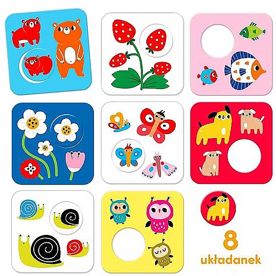Description - Hop to the hole or does it fit? Find the right piece and match the circles! This two-piece contrasting jigsaw puzzle is the perfect gift idea for a little explorer. Get your eyes straining, think and get your hands on the puzzle see which circles match the plates and why! The large contrasting puzzles have beautiful illustrations and allow for lots of fun activities to develop the senses, small motor skills and logical thinking. We have included a guide full of ideas for playing with the puzzles. A unique feature: the circles can be rearranged as desired. The illustrations deal with themes familiar and loved by the little ones. Have fun and improve a variety of skills: Small motor skills Cognitive development Perceptive skills Creative play