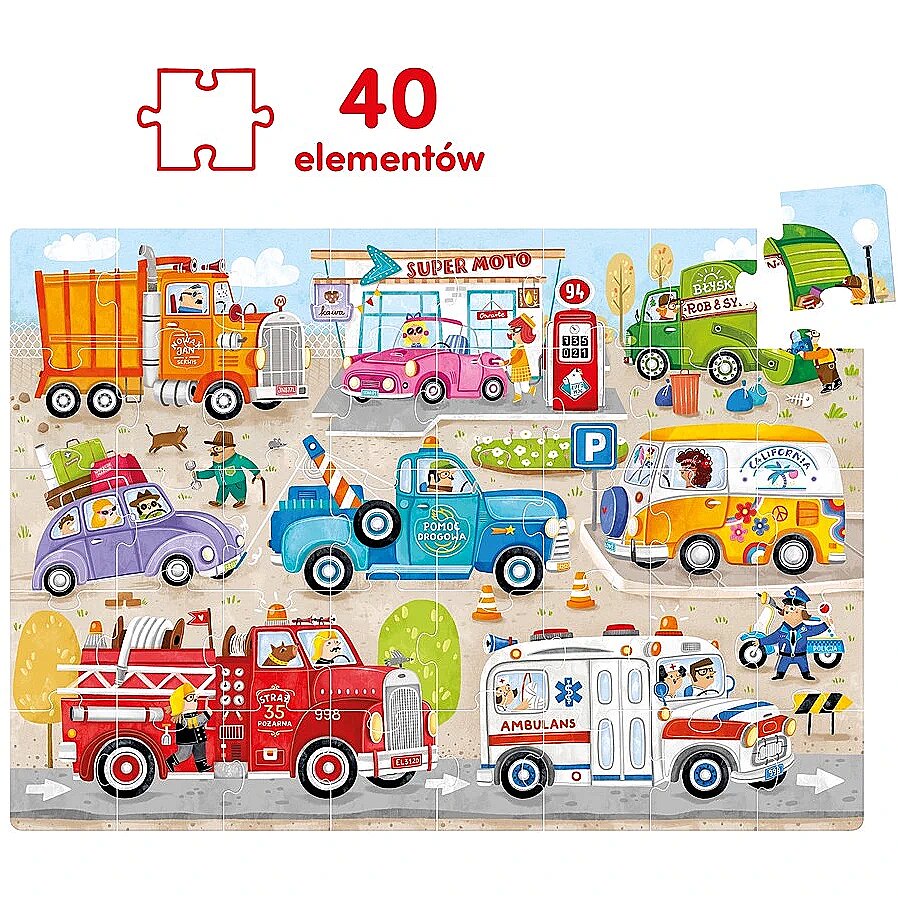 Description - Puzzle 40 pieces Moto puzzle Cars Every motoring fan will find their favourite vehicle here. Boom, boom, fasten your seatbelts, let's hit the road! In the gift box you will find a large 40-piece jigsaw puzzle, which depicts various cars, trucks and vehicles in action of preschoolers' favourites. While playing, children will improve hand dexterity, perceptiveness and imagination. Putting the puzzle together is not enough! Children's imagination will make the puzzle the starting point for many creative games. The puzzles are perfect for home, nursery and travel. Who will you invite to play with you? A unique feature: putting the puzzle together is the start of the fun! The curious preschooler is constantly improving his skills and expanding his knowledge, which comes naturally to him through play. He also has his own interests, and one of them is his favourite vehicles: cars, trucks, fire engines, ambulances, rubbish trucks Moto puzzle Cars brings together all his favourite vehicles in one illustration! With this beautiful jigsaw puzzle you can play in many ways and improve your competence step by step. Did you know that putting together a jigsaw puzzle is an excellent exercise in manual skills and perceptiveness, as well as perseverance and concentration? Putting them together for a beginner puzzle maker is a challenge, so be patient. Help your child if necessary. Practice makes perfect! Together, name the vehicles, the colours, the details in the picture. Which car do you like best and why? Design and draw your own cars. Make up stories about the characters in the illustrations.