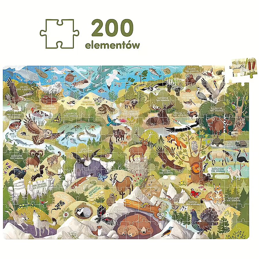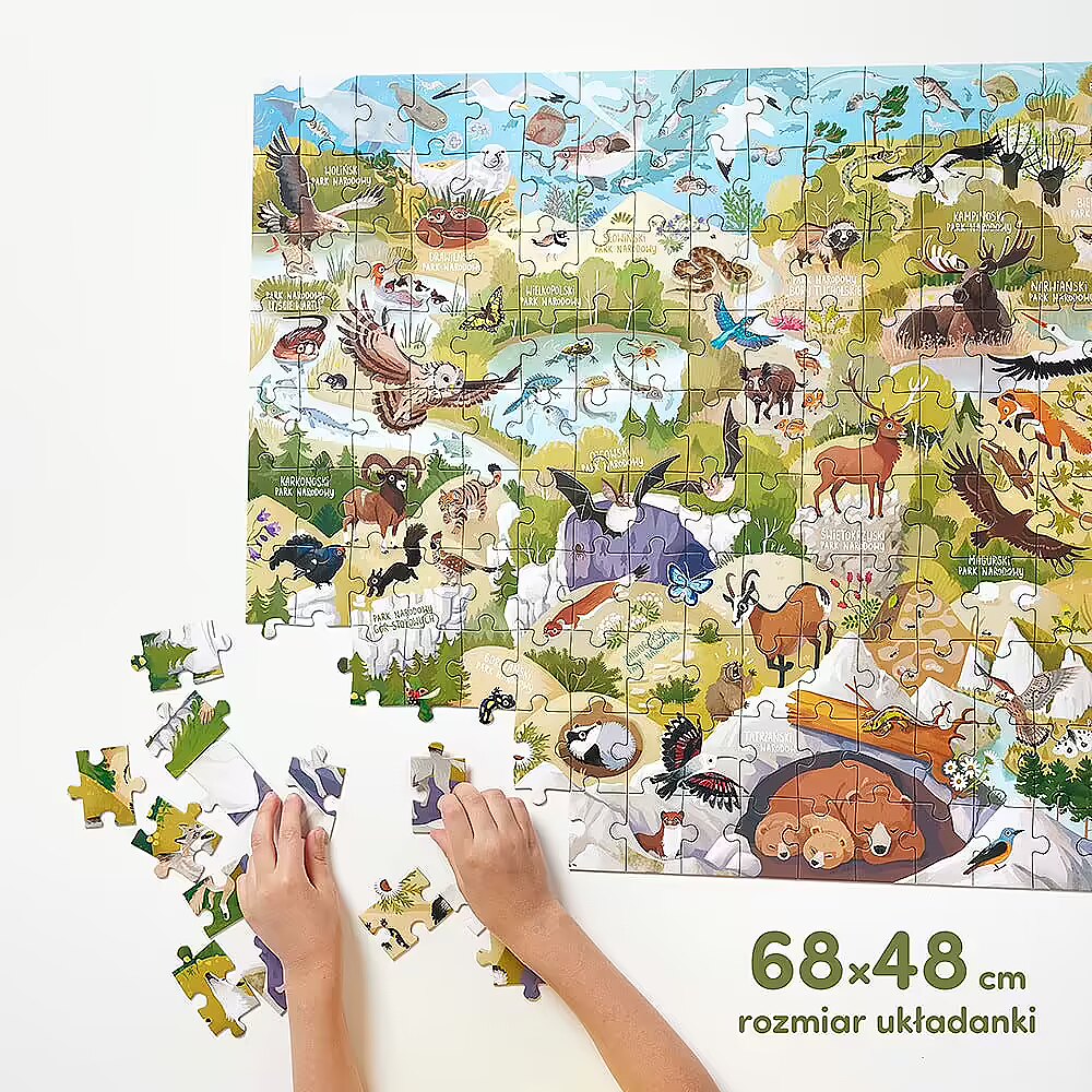 Description - Wild puzzles National parks Hey, hiking and nature lovers, let's get to know Poland's nature! A large, beautiful illustration depicts less and more famous wild inhabitants of Polish forests, mountains, lakes, rivers and the sea. Putting together a puzzle is not only a way to relax and an extremely pleasant exercise for your brain cells, but also an encouragement to broaden your horizons, talk about nature, and acquire new knowledge. Puzzles are a beautiful idea for a smart gift for curious explorers. Who will you invite to have fun? Unique feature: solving the puzzle is where the fun begins! Having fun and an active lifestyle is the best way to acquire new knowledge and skills, as well as a condition for health and happiness. That's why we take you on countless walks and encourage you to make your own discoveries! Wild National Parks puzzles were created for older preschoolers and students, as well as family puzzles. This is a large, beautifully illustrated 200-piece puzzle. It is a beautiful idea for a wise gift, an inspiration for hiking, interest in nature, discovering new knowledge and understanding the mechanisms that govern nature. The arranged picture can become an original decoration for a young naturalist's room. Exercise your perceptiveness and imagination This is not an easy puzzle! But arranging them gives great satisfaction and allows you to improve your patience and perseverance. Putting together a puzzle is a great way to calm down and relax - for example, after a long hike. Have fun with your favorite company! Name all the animals and plants in the picture Find out as much as you can about them - some of the information can be found on the poster included in the set, but check out other sources! Get to know Polish national parks - how many are there? What are they famous for? Where exactly are they located? Compare the illustration with the map of Poland. Draw your favorite animals. Plan your next family hike!