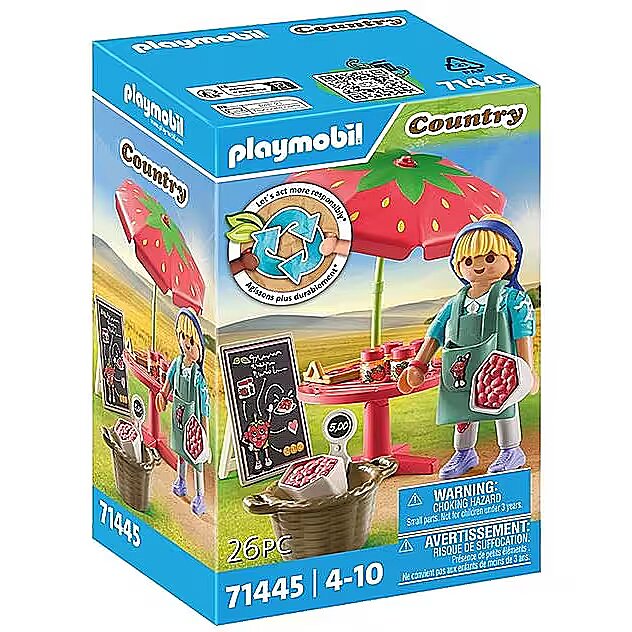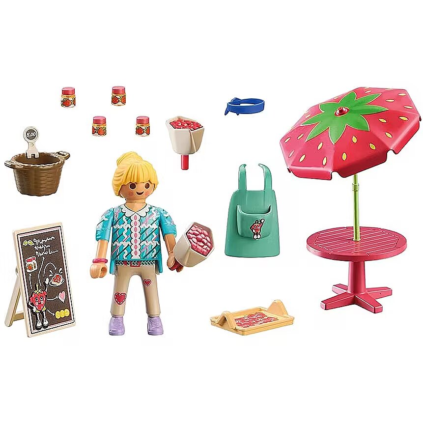 Description - Fancy a homemade treat? Then off to the jam stand. Here, delicious strawberry jam and strawberry cake await hungry guests! Indulge in the delightful world of the PLAYMOBIL Country Homemade Strawberry Jam Stall where role-play is a piece of cake! Designed for children aged 4 years and up, this berry-luscious set is made from over 80% sustainable material, putting the planet first. Visit the strawberry stand and taste the sweetness of fresh-picked strawberries. Don't miss out on the scrumptious strawberry cake and tangy strawberry jam. With one PLAYMOBIL figure and a handle-equipped bag filled with fresh strawberry inserts, it's time to jam and have a fruitful playtime adventure!