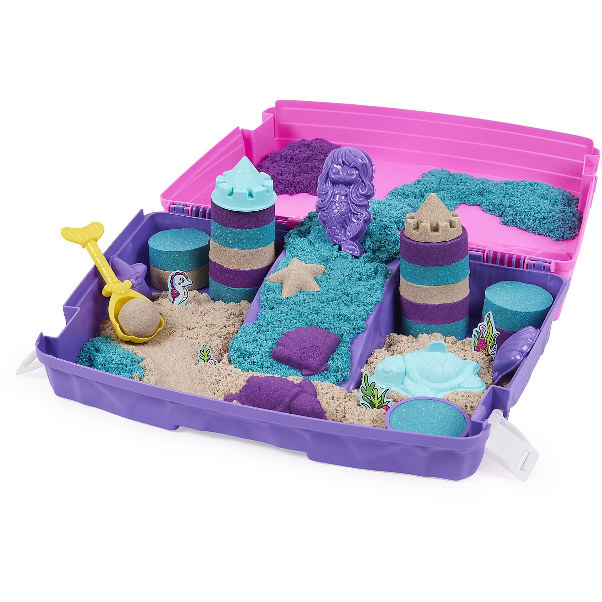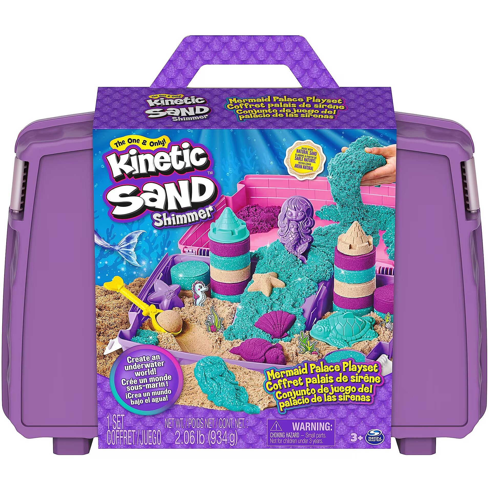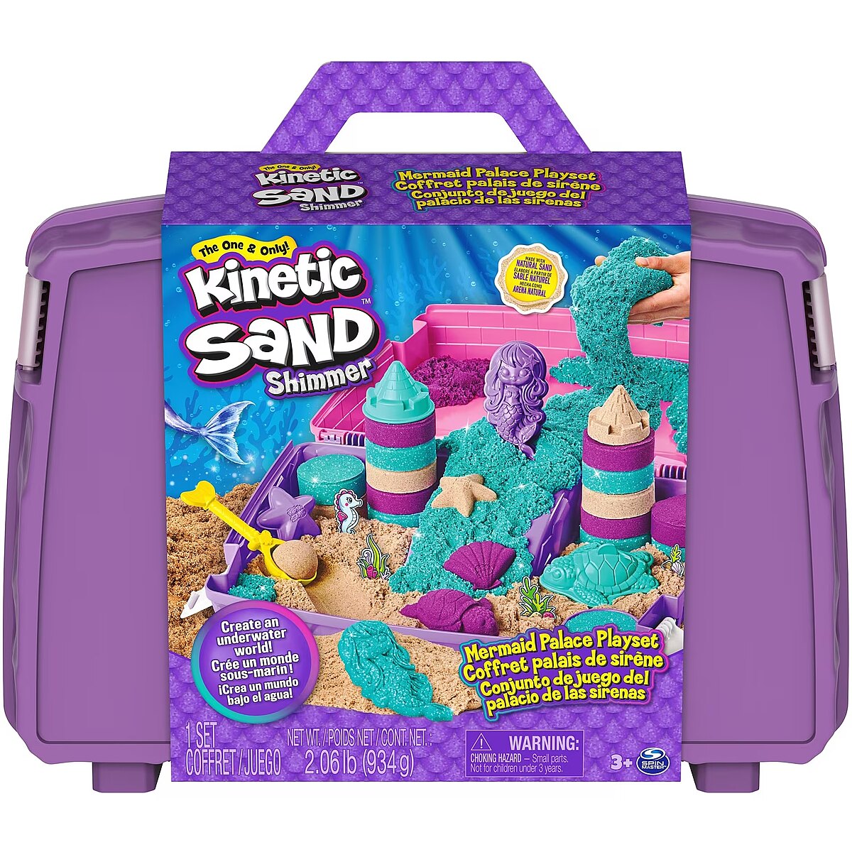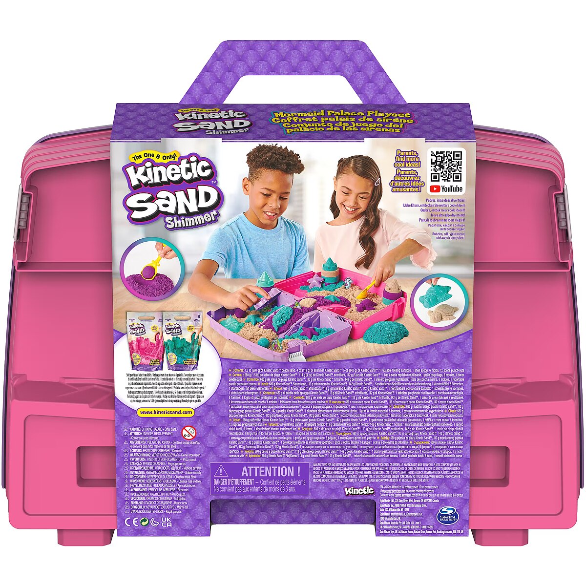 LongDesc - Turn your mermaid dreams into reality with the Kinetic Sand Mermaid Palace Playset. This playset comes with a total of 2.06lbs of Kinetic Sand, including exclusive shimmer teal sand, beach sand, and neon purple sand. Use the included 7 mermaid-themed tools to create the ultimate mermaid world. Use the scoop to shape, molds to build, and scene pop-out to bring your creations to life. Kinetic Sand is the original magical, moldable and mesmerizing play sand. Better than arts and crafts modeling clay, this sensory sand never dries out, so you can play with Kinetic Sand for hours of tactile independent play. It’s a welcome addition to sensory bins and toys collection. Let it flow through your hands – it’s so satisfying, you won’t be able to put it down. Kinetic Sand is made with natural sand, magically sticks together and cleans up easily. Kinetic Sand develops creative and sensory skills and allows kids to create anything they can imagine. Kinetic Sand kids toys for 3 year old boys and girls are a fun gift for kids. Kinetic Sand Mermaid Palace Playset includes a reusable sandbox storage to keep your sand contained for easy storage and clean up. Create the ultimate mermaid world with the Kinetic Sand Mermaid Palace Playset.Includes: 1.5 lbs of Kinetic Sand beach sand, 4oz of shimmer Kinetic Sand, 5oz of Kinetic Sand, 1 reusable folding sandbox, 1 shell scoop, 6 molds, 1x scene punch-out