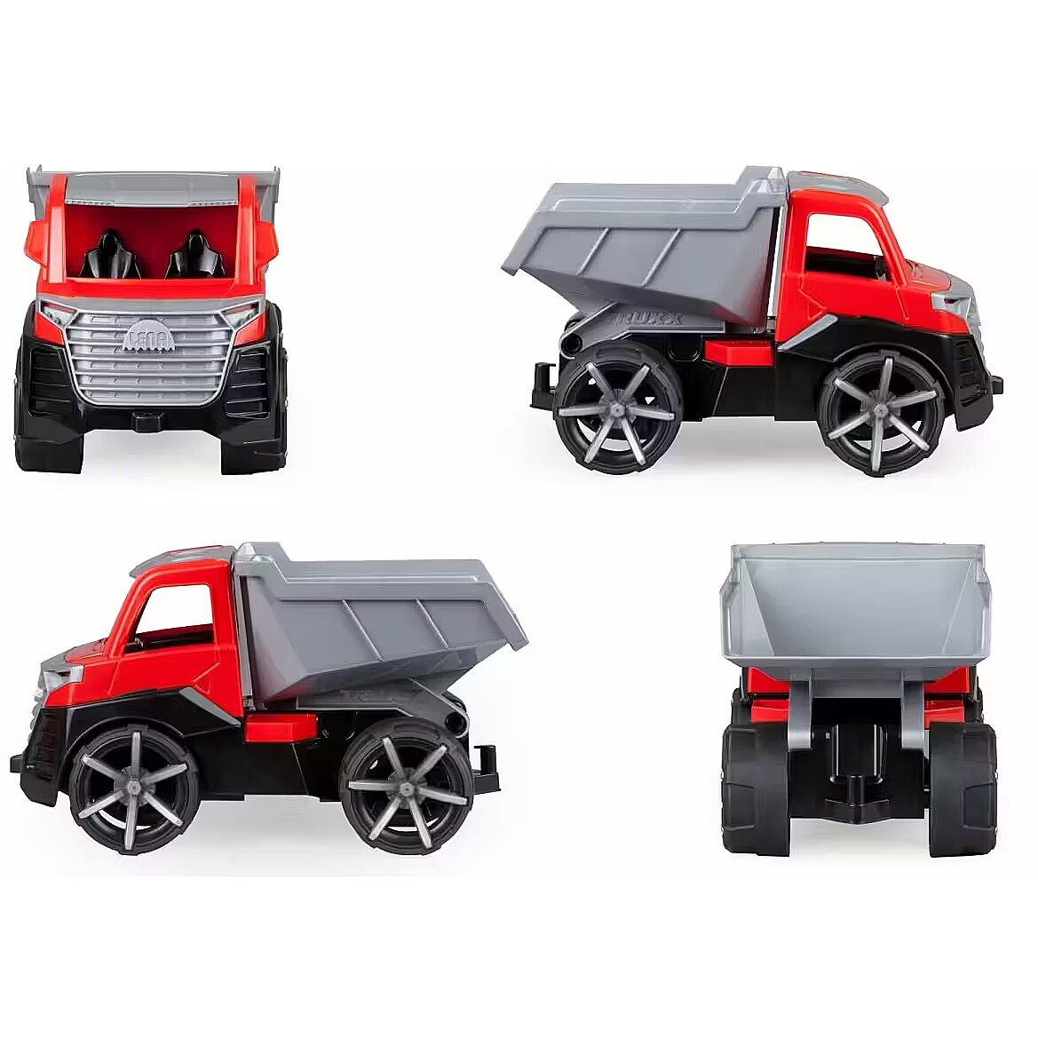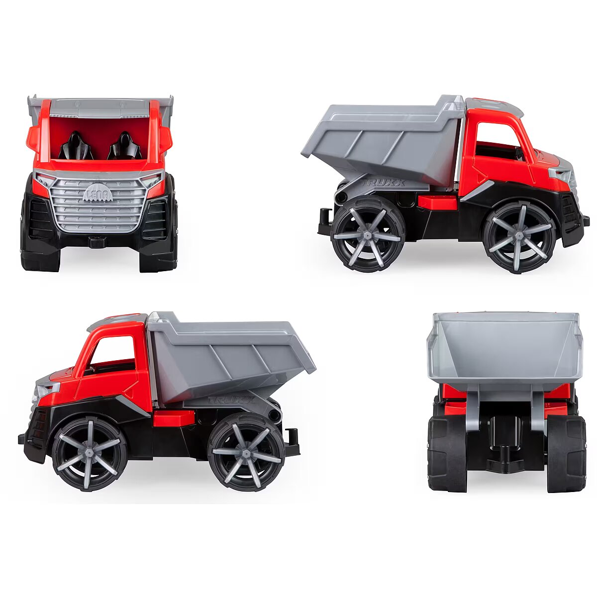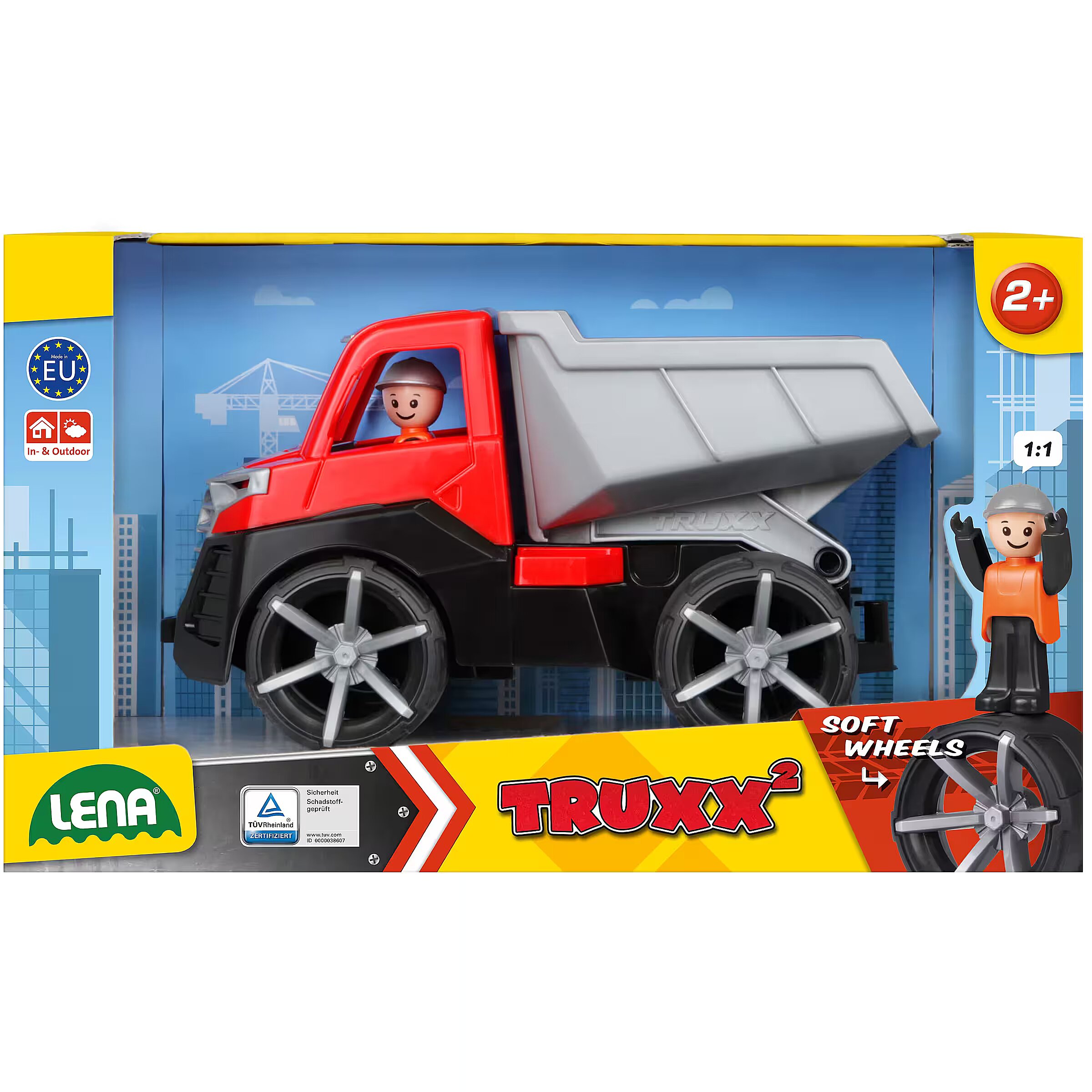 Description - LENA TRUXX 2 Tipper Truck Suitable for indoor and outdoor use. Suitable for children over 2 years old. Packaged in a colourful display box. MANUFACTURED IN EUROPE. TÜV certified. 4 mm galvanised steel axles Opening driver's cabin Lockable box Trailer hitch Figure