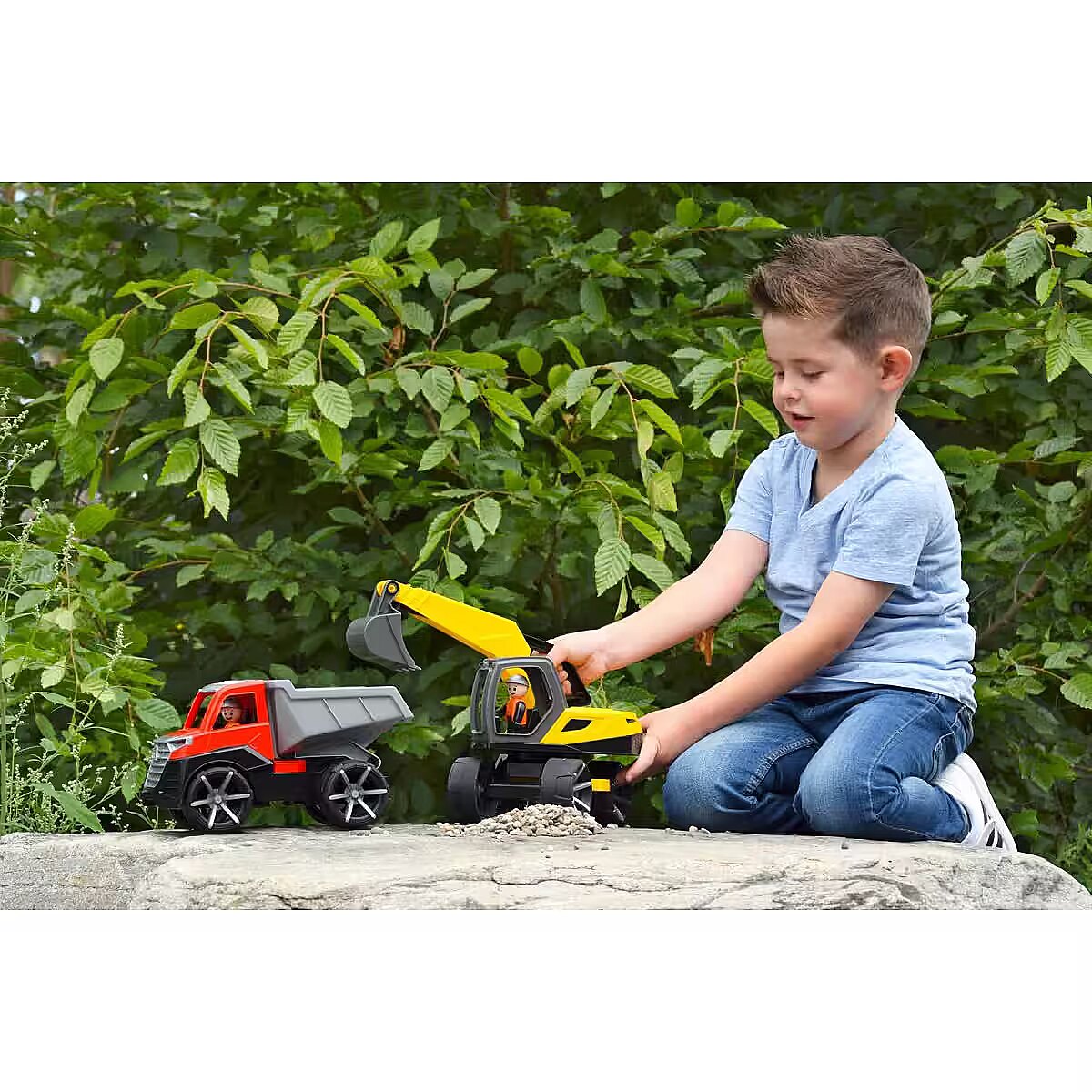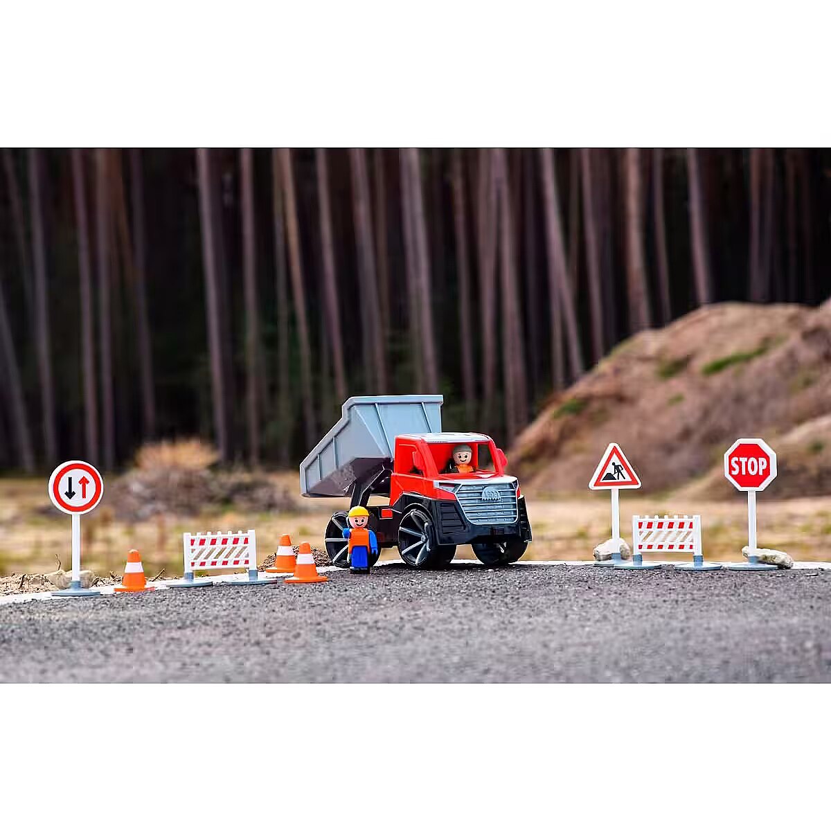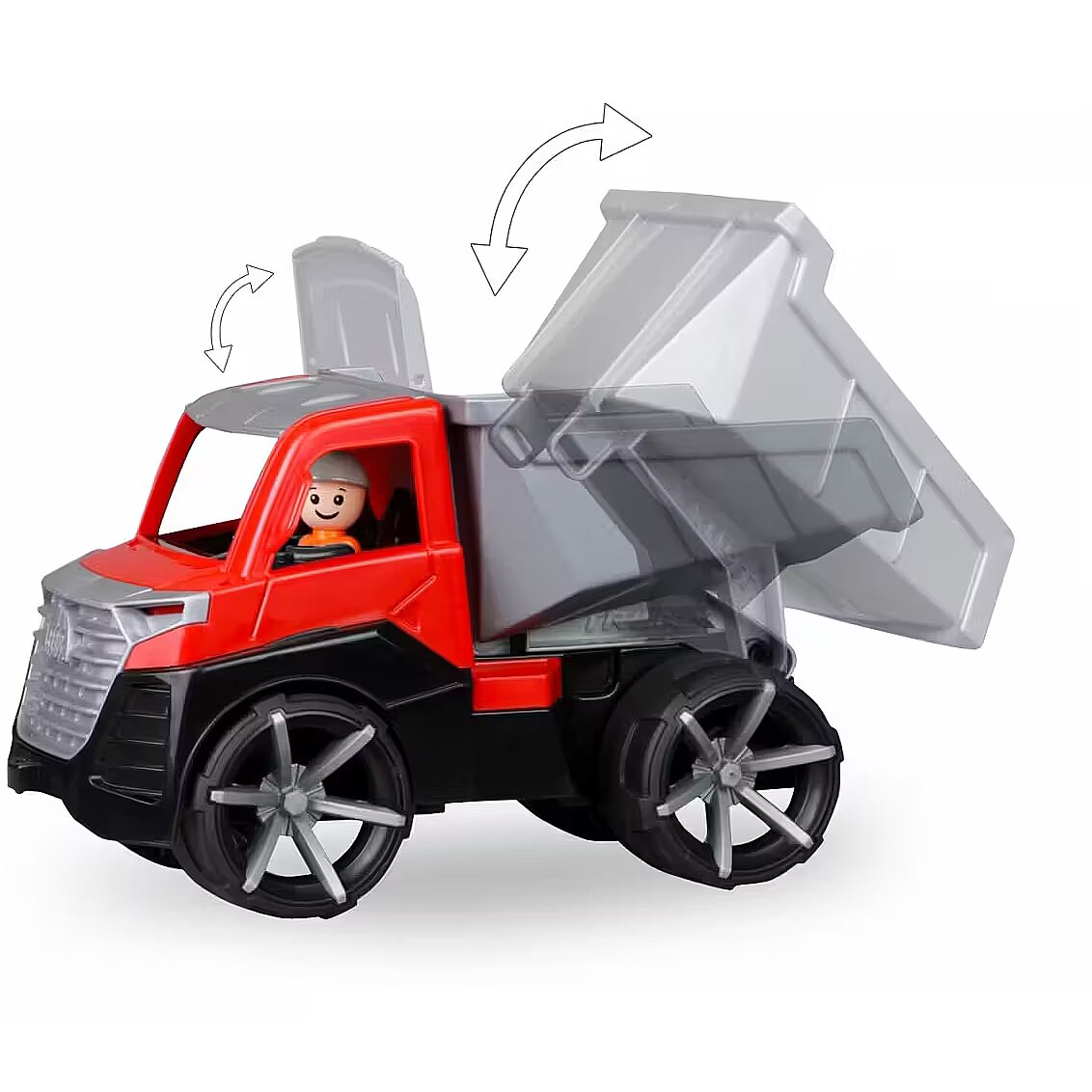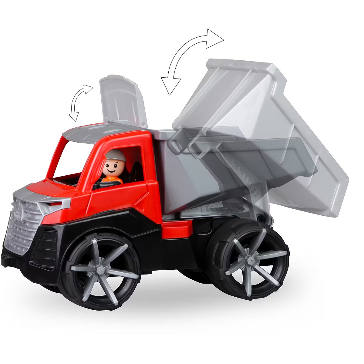 Description - LENA TRUXX 2 Tipper Truck Suitable for indoor and outdoor use. Suitable for children over 2 years old. Packaged in a colourful display box. MANUFACTURED IN EUROPE. TÜV certified. 4 mm galvanised steel axles Opening driver's cabin Lockable box Trailer hitch Figure