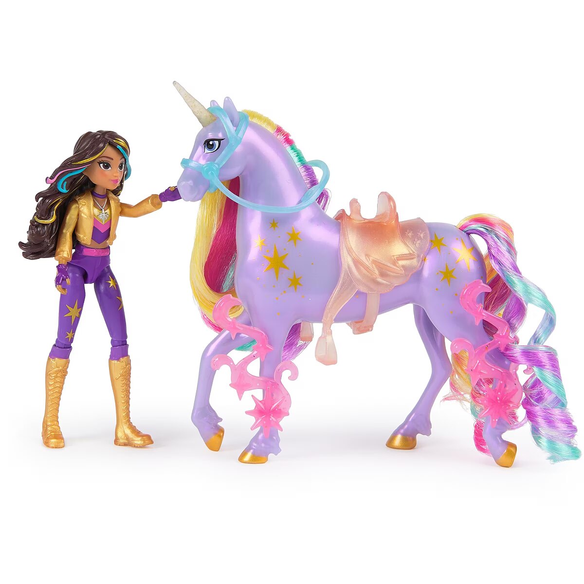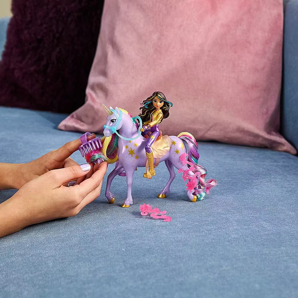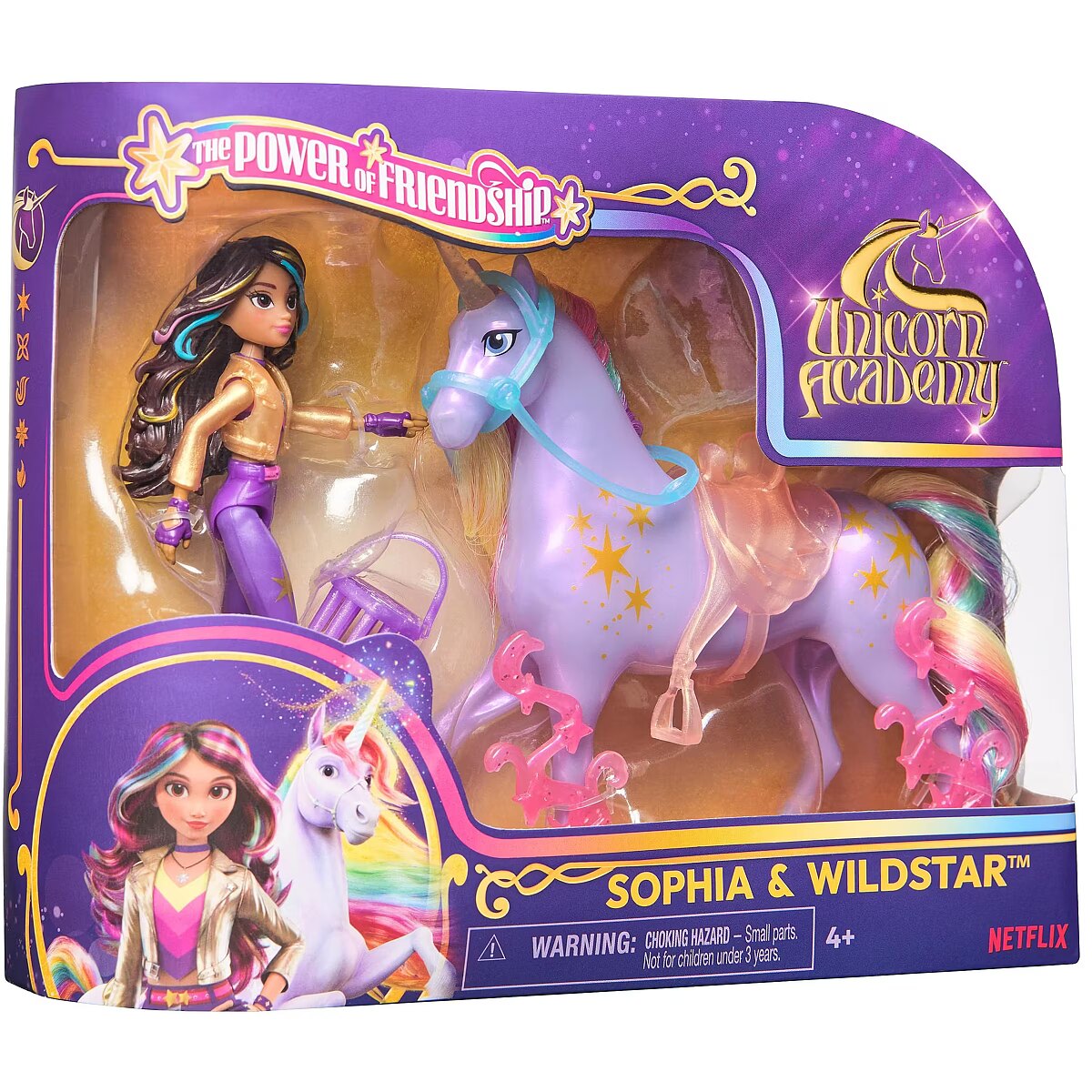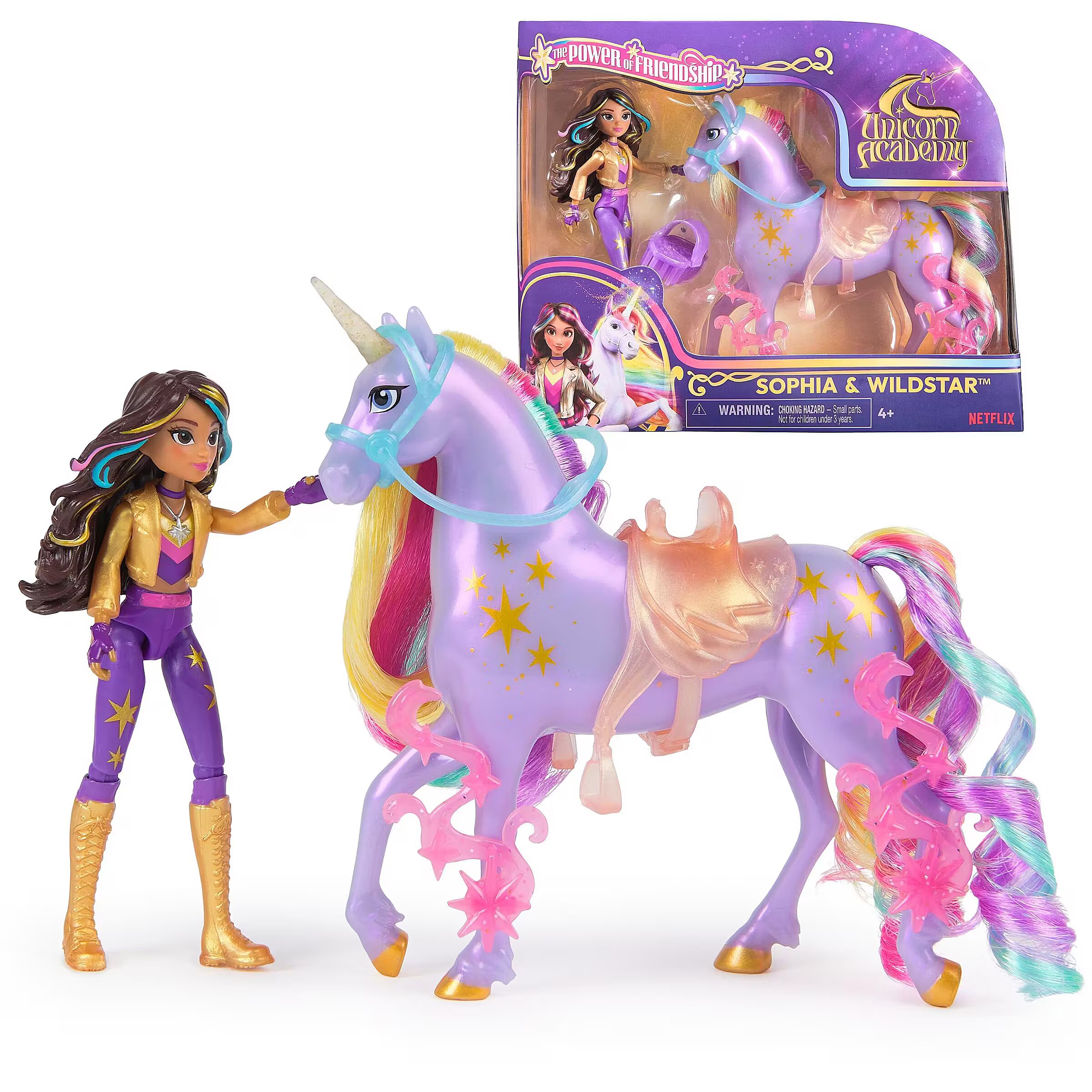 LongDesc - Celebrate the bond between rider and unicorn with the Unicorn Academy Power of Friendship-themed Sophia & Wildstar Set. Inspired by the NETFLIX animated show and best-selling book series where friendship reins, this set will spark endless imaginative storytelling. 4.5-inch Sophia features realistic true-to-show details including metallic power markings, and 7 points of articulation for dynamic poses. Wildstar stands at 5 inches tall, complimenting Sophia’s look with beautiful details, including metallic Light Magic markings and 2 translucent clip-on power accessories for her legs. Keep Wildstar’s mane shiny and smooth with the brush, and as you play, pose Sophia on Wildstar and ride into adventure. With the translucent removable bridle and saddle, Sophia can securely stay in place on Wildstar. For more ways to experience Unicorn Academy with your favorite characters, look for the other dolls, including Ava, Layla, Isabel, Valentina, and their unicorns (sets sold separately) and expand your world. For kids who enjoy unicorns and horse toys, dolls & accessories, doll house play, collectibles, plush toys and more, Unicorn Academy toys are fun birthday gifts for girls or gifts for any occasion. Experience enchanting Unicorn Academy adventures with the Sophia & Wildstar Set.Includes: 1 Doll, 1 Unicorn, 1 Removable Saddle, 1 Removable Bridle, 2 Power Accessories, 1 Hair Styling Tool