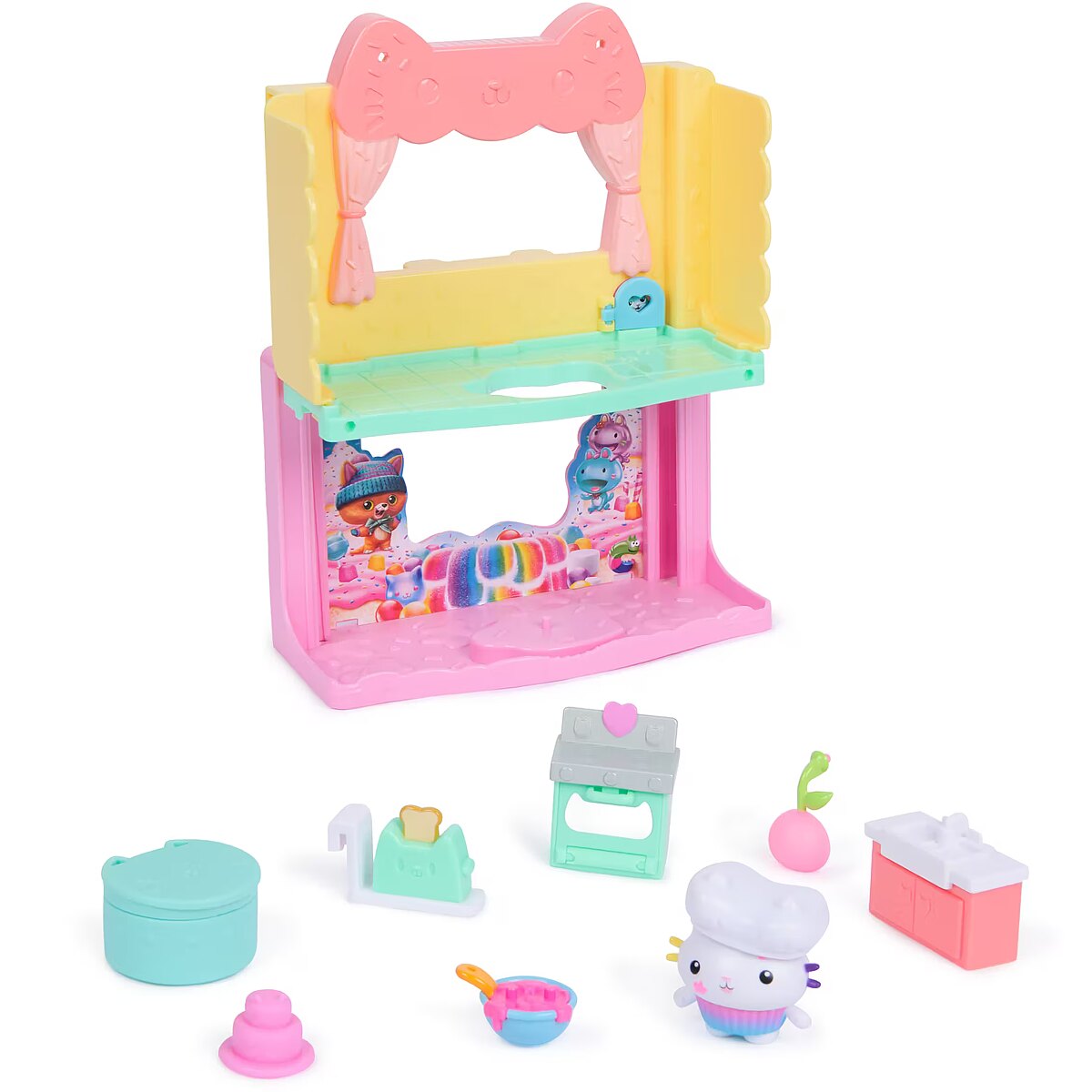 LongDesc - Meow-mazing adventures await with Cakey's Sprinkle Cake-tastic Kitchen! This 10-piece playset brings the magic of Gabby's Dollhouse: The Movie to life, featuring a Cakey figure and a combined 8 pieces of doll house furniture & accessories, for cat-tastic adventures with these learning toys. The Cake-tastic Kitchen is designed to be attached to the dollhouse and transforms into a 2-story dollhouse room, creating an even more thrilling dollhouse world, enhanced by a surprise feature. Place Cakey on the pegged pedestal and pull the room down to teleport him to his movie-world confection land. Unbox the Dollhouse Delivery, just like Gabby does in the show, to find a surprise accessory, then scan the QR code to unlock a surprise in the Gabby's Dollhouse app. This set is a fun-filled way to inspire pretend play and invites meow-mazing explorations, with these adorable Gabby cat toys for kids. Gabbys dollhouse toys are purrfect gifts for kids to relive cherished moments from the Gabby movie, and for creating new adventures in Gabby's dollhouse, with toddler toys for kids, like doll house accessories & furniture, her meow-mazing cat friends and fin-tastic mermaid toys, for endless hours of cat-terrific adventures (each sold separately)Includes: 1 Playset, 1 Cakey figure, 1 Oven, 1 Sink, 1 Mixing Bowl, 1 Toaster Shelf, 1 Cake, 1 Cherry Lamp, 1 Chef’s Hat, 1 Dollhouse Delivery box