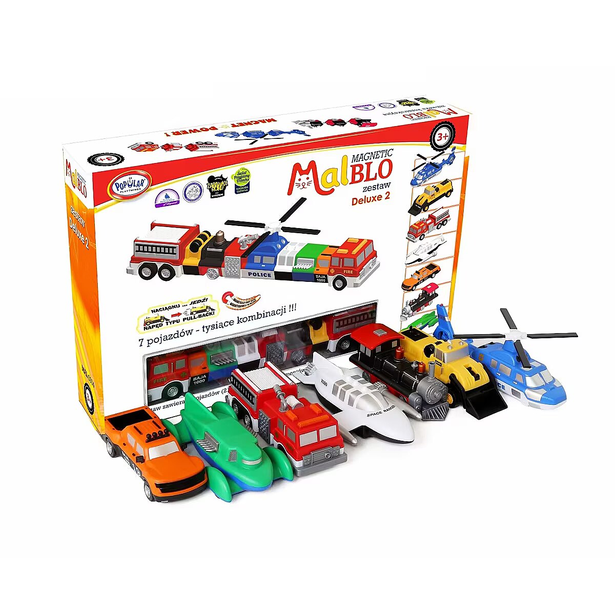 Description - MalBlo MAGNETIC magnetic bricks are a modular creative toy. The patented, innovative magnetic-snap system allows individual modules to be easily connected and disconnected to build a variety of vehicles. By connecting the modules together to create new vehicles, children develop their spatial imagination and concentration skills. Designing and building their own forms with MalBlo MAGNETIC Deluxe bricks brilliantly develops creativity and manual dexterity. By connecting and disconnecting modules that have the right bonding strength, children can also develop the strength of their hands. The product series consists of two themed sets. All sets are compatible and the vehicles can be combined with each other in any way!!! There are 21 pieces in each set (7 finished vehicles), allowing you to create over 1,000 different combinations within just one set. There are three PULL-BACK (pull and drive) vehicles in the set