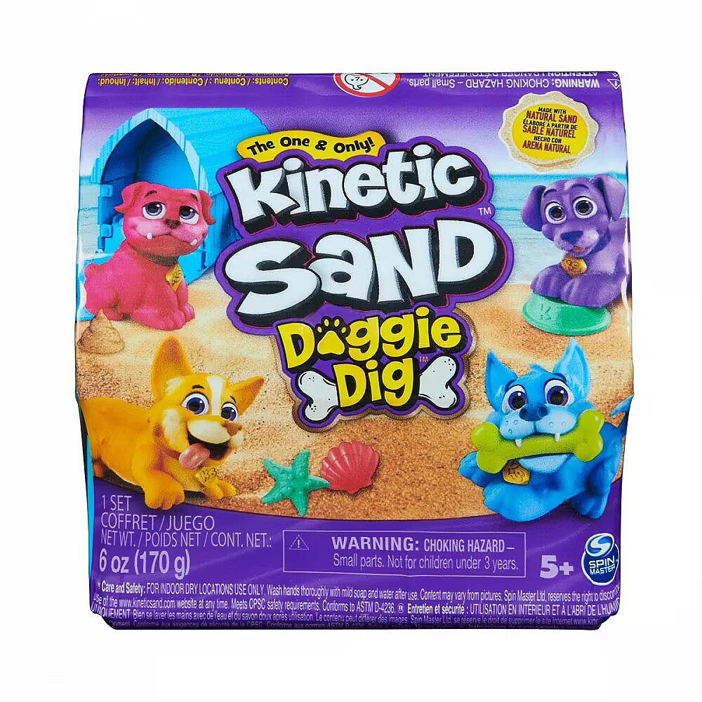 LongDesc - Dig for treasures with Kinetic Sand Doggie Dig! This Kinetic Sand kit includes 6oz of Beach Sand, 1 of 4 super cute dogs that double as a multipurpose tool and two treasures. Doggie Dig will spark imagination and excitement as kids use their beagle, pug, husky, or corgi’s paws to dig through the play sand, revealing their dog-themed hidden treasures! They may even find the golden treasure! With four dogs to collect (each sold separately), kids can play with hidden stamps, a knife, or a mold for endless ways to play. The reusable doghouse container folds up for convenient storage. The One and Only Kinetic Sand is made from natural sand that sticks to itself for easy cleanup! Create again and again and let it flow through your hands – it’s so satisfying, you won’t be able to put it down! Kinetic Sand is an exciting alternative to arts and crafts modeling clay and is a welcome addition to the craft table, sensory bin, kids activities time and Montessori toys. Kinetic Sand promotes fine motor skills and creativity in kids aged 5 and up through independent tactile play. What dog-themed world will your child create with Kinetic Sand Doggie Dig?Includes: 6oz Kinetic Sand Beach Sand, 2 Accessories, 1 Dog Character, 1 Doghouse Container with Dog Bed (Inside), 1 Collector Sheet
