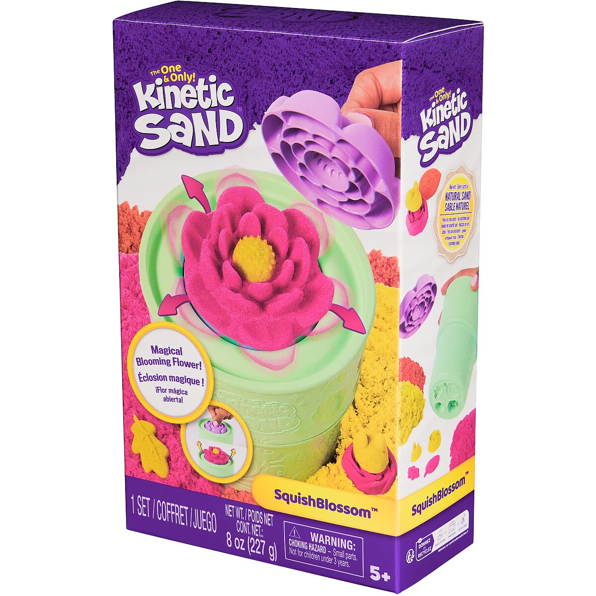 LongDesc - Bring flowers to life with Kinetic Sand SquishBlossom. This Kinetic Sand kit will spark imagination and excitement as kids squish to reveal mesmerizing flower creations. Featuring 8oz neon pink and yellow Kinetic Sand, a flowerpot and mold, plus extra molds on the bottom of the pot, SquishBlossom is a must-have for springtime fun. Fill the flower mold with sand and squish it down on the foam to stamp your flower – when lifted, the flower magically blooms. Enhance creative play and mix the colors of sand to make peach and create more shapes – roses, bees and leaves – with the flowerpot molds. The One and Only Kinetic Sand is made from natural sand that sticks together for easy cleanup and never dries out. Let it flow through your hands – it’s so satisfying, you won’t be able to put it down. An alternative to arts and crafts modeling clay, Kinetic Sand is a welcome addition to the sensory bin, activities time and Montessori toys. Kinetic Sand promotes fine motor skills and is suitable for individual or group play, encouraging social interaction. SquishBlossom is a special gift idea for birthdays, holidays, Mother’s Day gifts and more. Bloom again and again with Kinetic Sand SquishBlossom.Includes: 8oz (227 g) Kinetic Sand, 1 Flower Pot, 1 Flower Mold, 1 Instruction Sheet