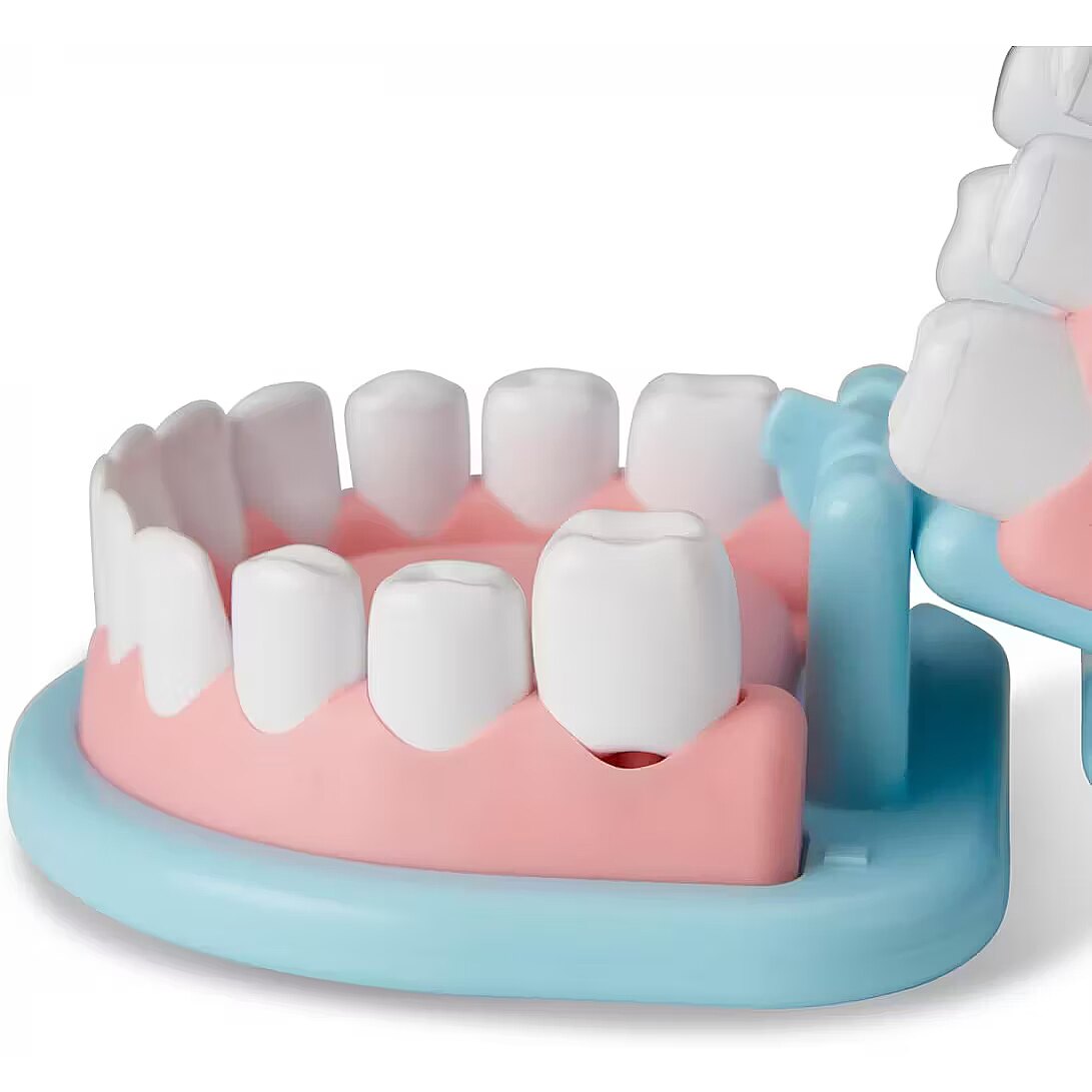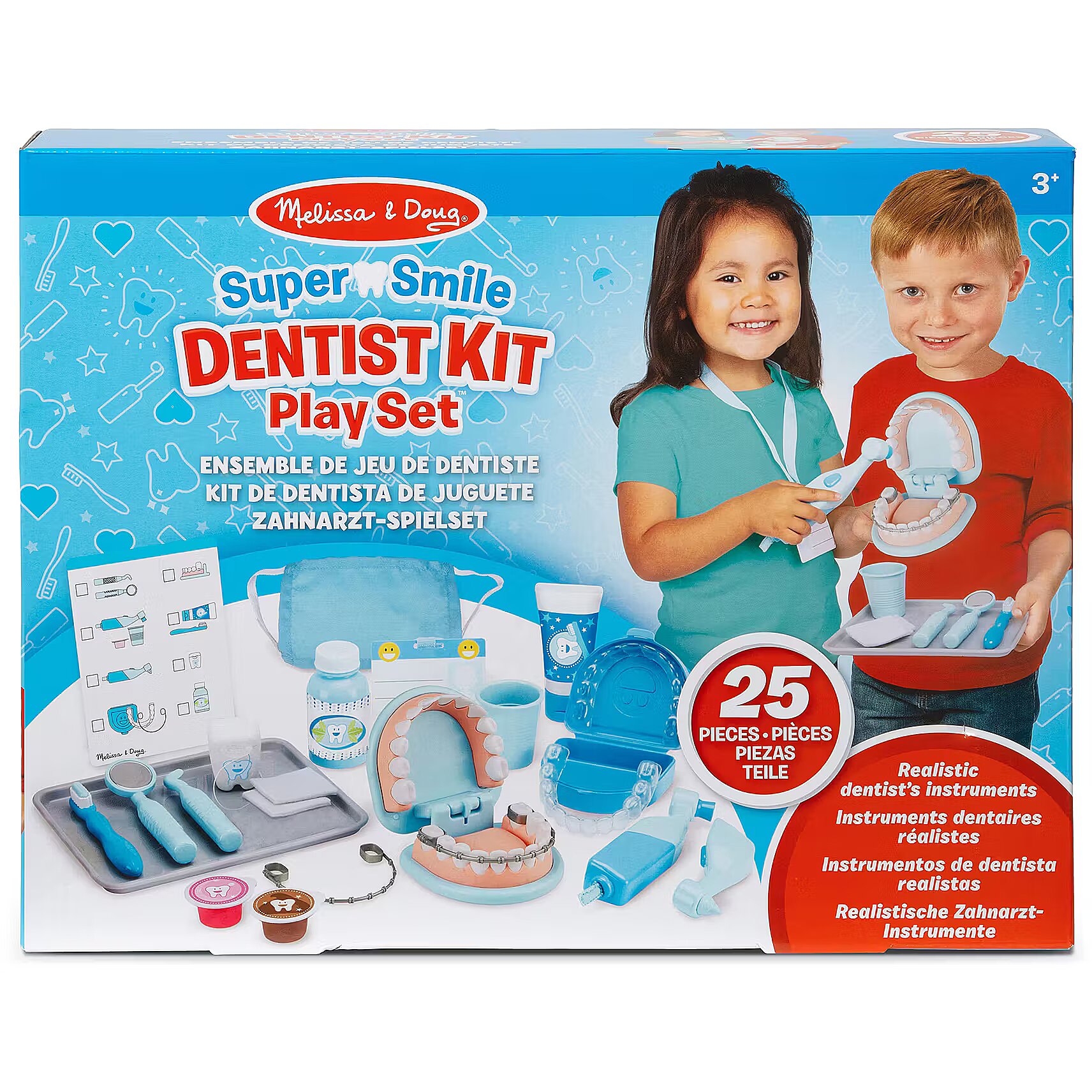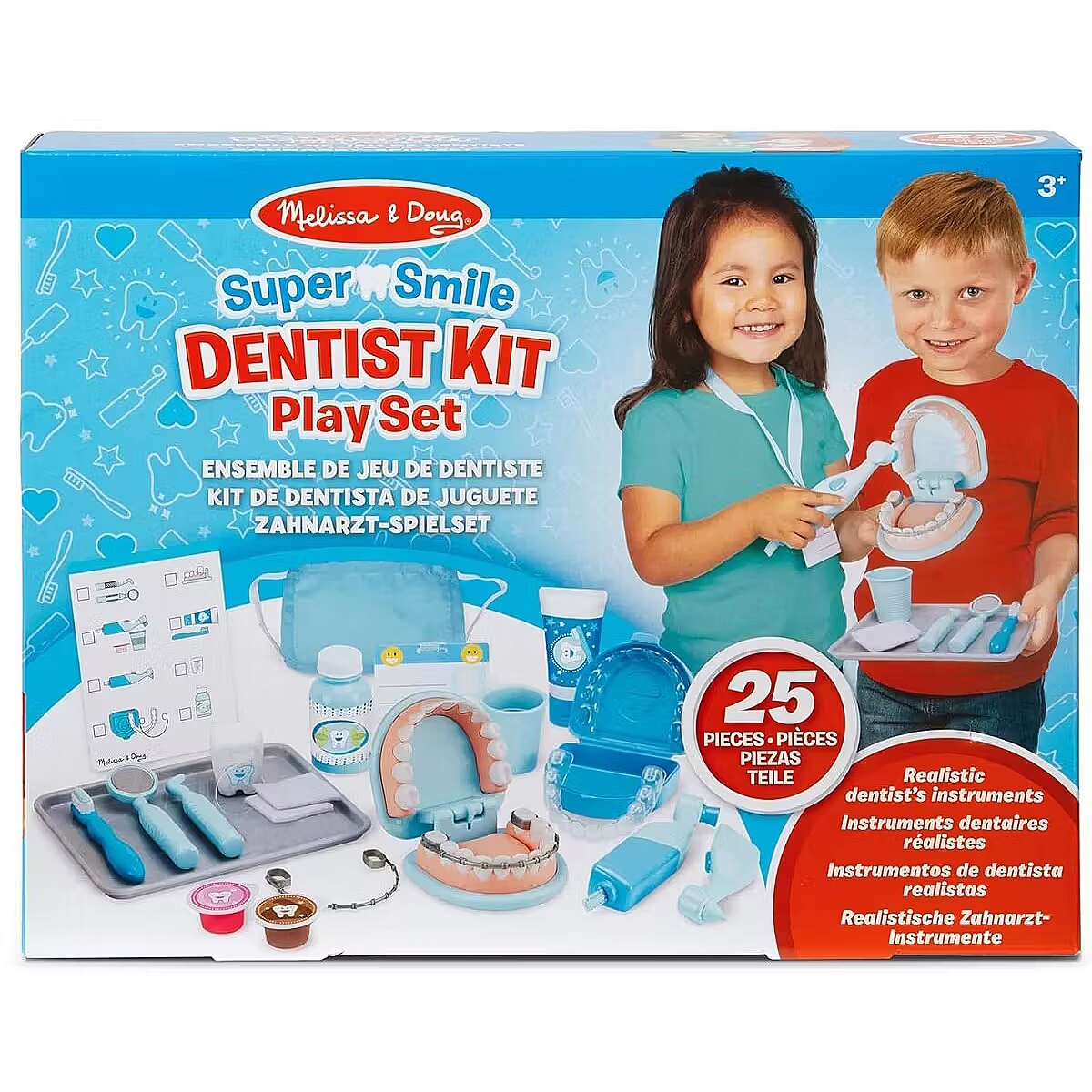 Description - Melissa & Doug: Dentist Say cheese-your dentist will see you now! This 25-piece dentist play set includes a large tooth model, allowing aspiring dentists to perform cleanings, treat cavities, and even fit braces! Mark individual teeth with cavity stickers, then use the vibrating tool with interchangeable heads for polishing and drilling, along with the toothbrush. The set includes realistic tools such as a dental probe, mirror, and floss, a rinse bottle and cup, 2 gauze pads, 2 polishing cups, and a tray for storing instruments. A mask, reusable ID badge on a lanyard, and double-sided reusable activity card add extra realism to dental office play. This set provides a fun and engaging way to teach children good oral care habits while helping to reduce anxiety or stress about dentist visits. Spark creativity and imagination while inspiring the dentists of tomorrow.