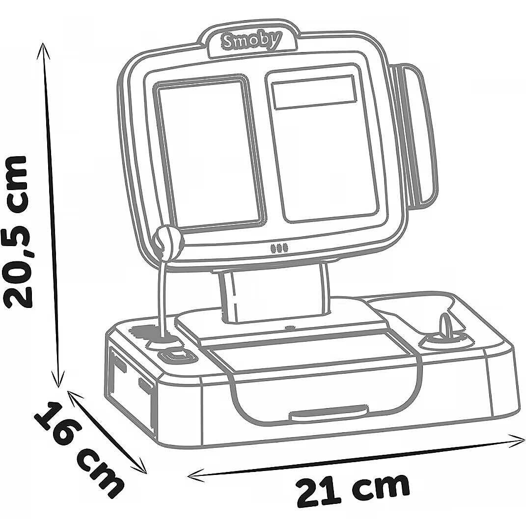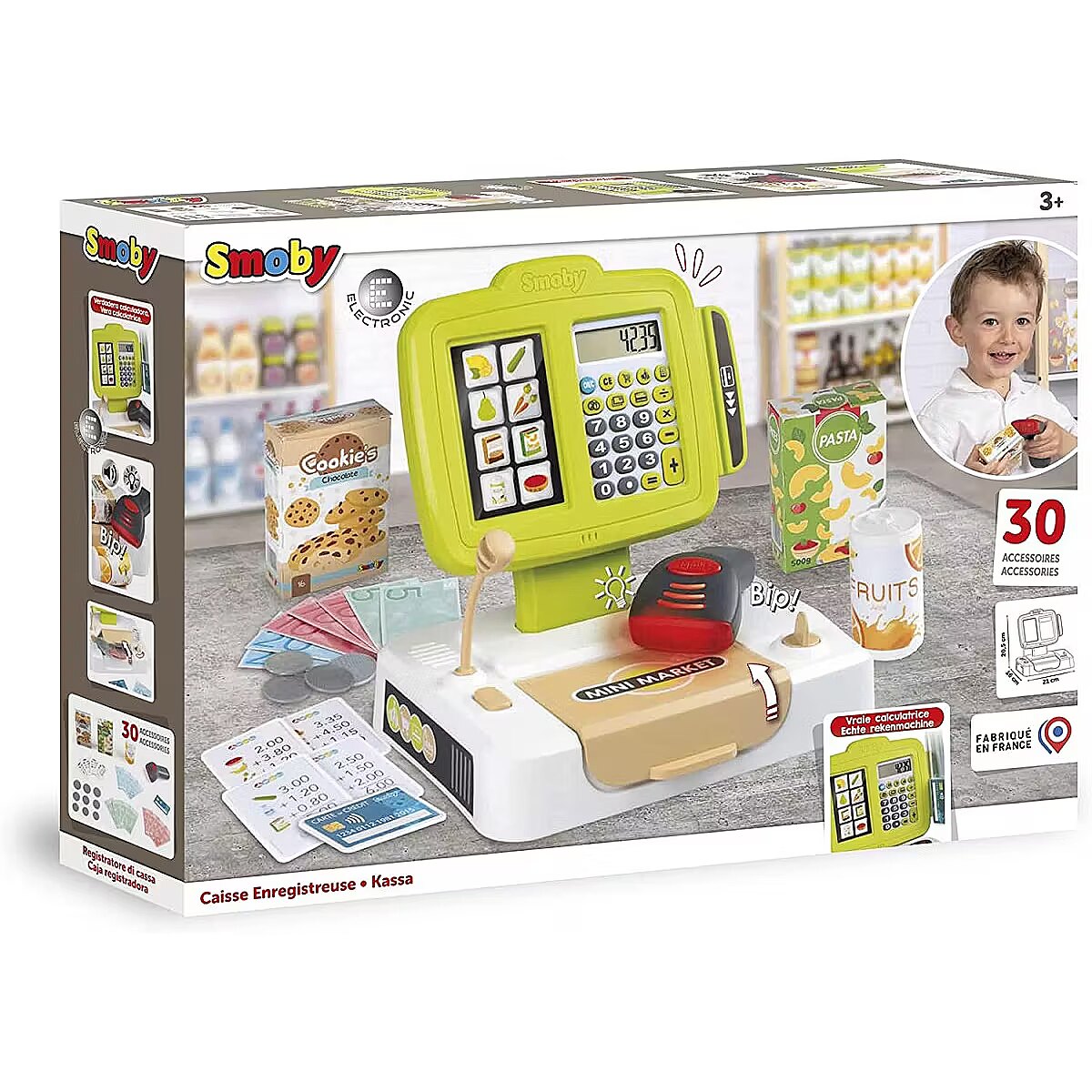 Description - Small electronic cash register with scanner Cash register with electronic functions, real calculator with display, scanner with sound and light, mechanical scale, credit card reader, money drawer. Includes 30 accessories, including coins and banknotes.