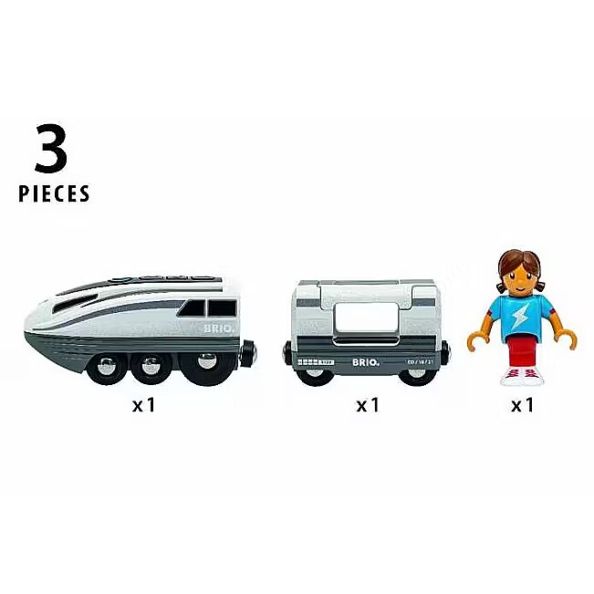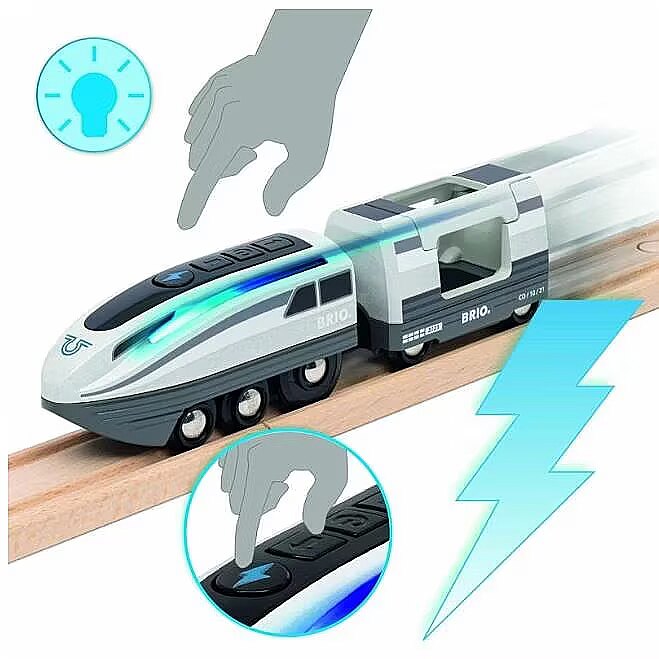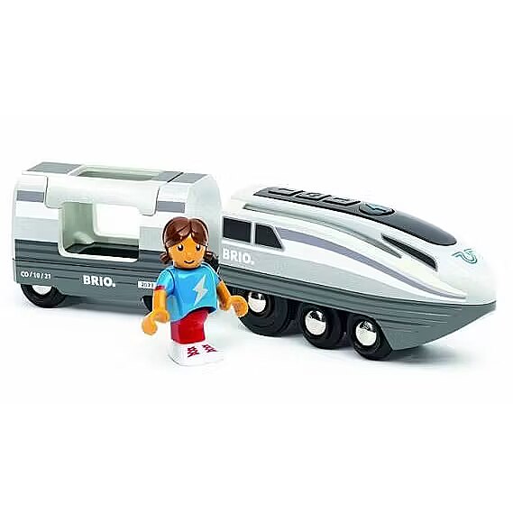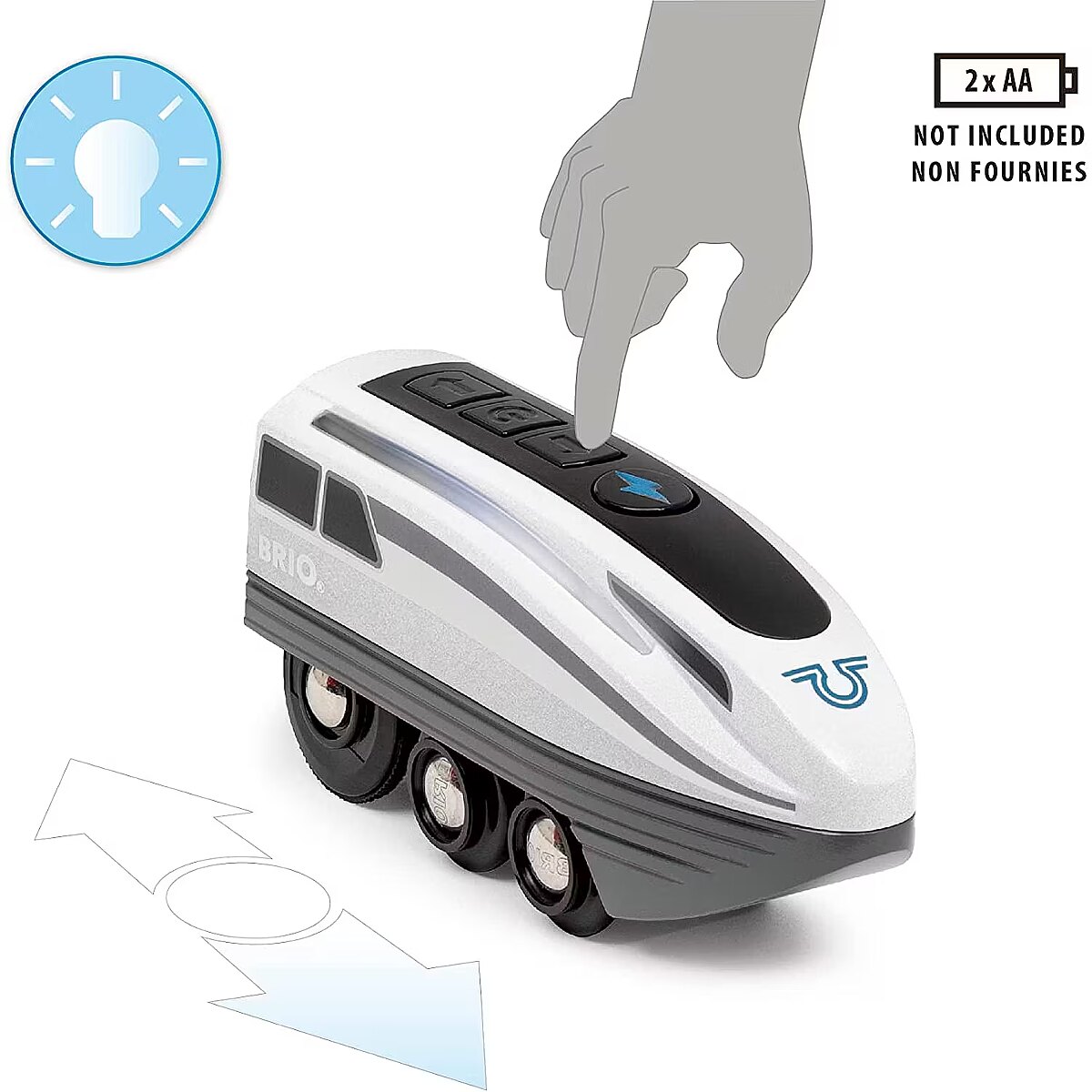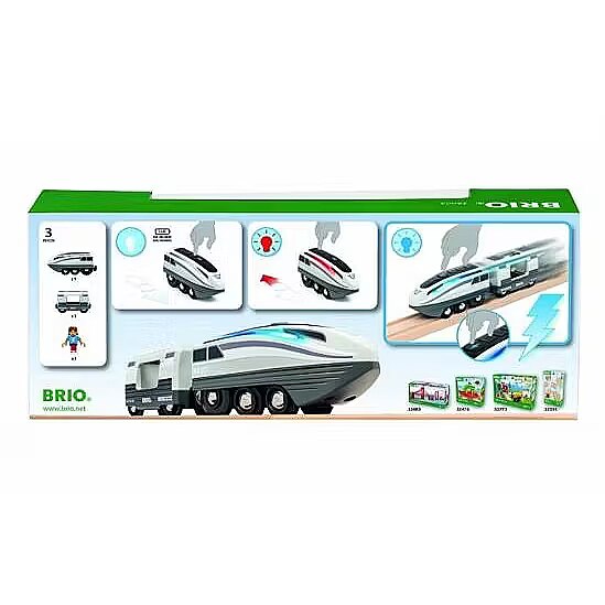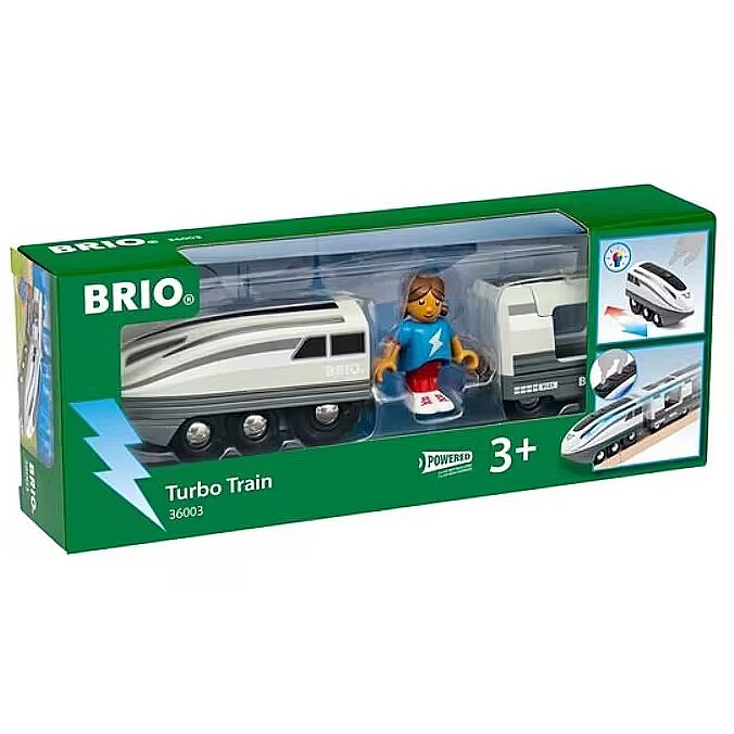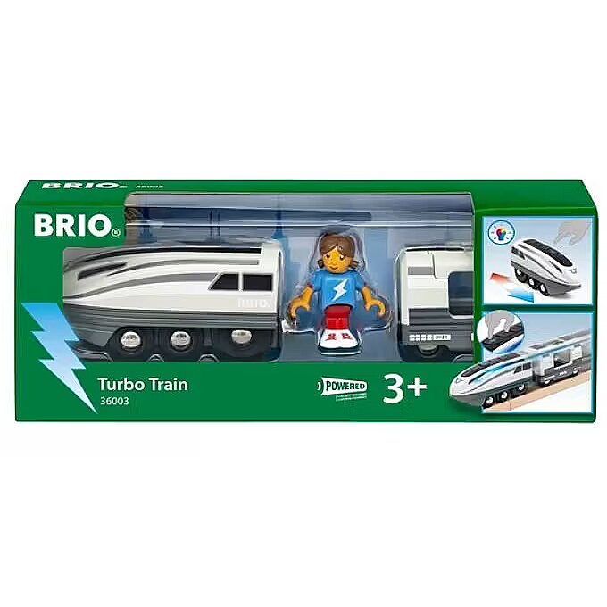 Description - Crank up the speed with the 36003 Turbo Train. Simply press the big turbo button and this battery-operated toy train doubles its speed, making it the fastest train in BRIO World. The turbo boost lasts for 5 seconds and as it runs at top speed, the white lights along the sides of the engine change to a cool blue. This futuristically designed engine also includes a passenger wagon with enough space for one lucky passenger to enjoy an exhilarating ride to remember. About BRIO World: BRIO World is our open-ended play system that grows with your child. All BRIO World toys work with each other to create an entirely customisable world thats great for challenging growing minds. Theres endless combinations of imaginative play waiting to be explored and this toy train fits right in just pick up a piece and start building your world.