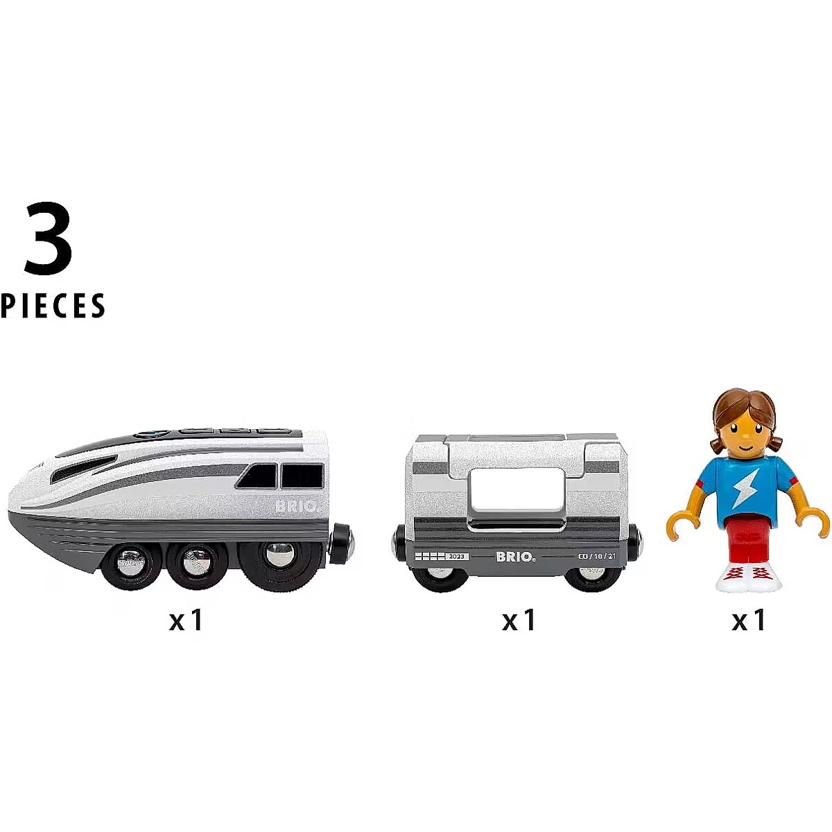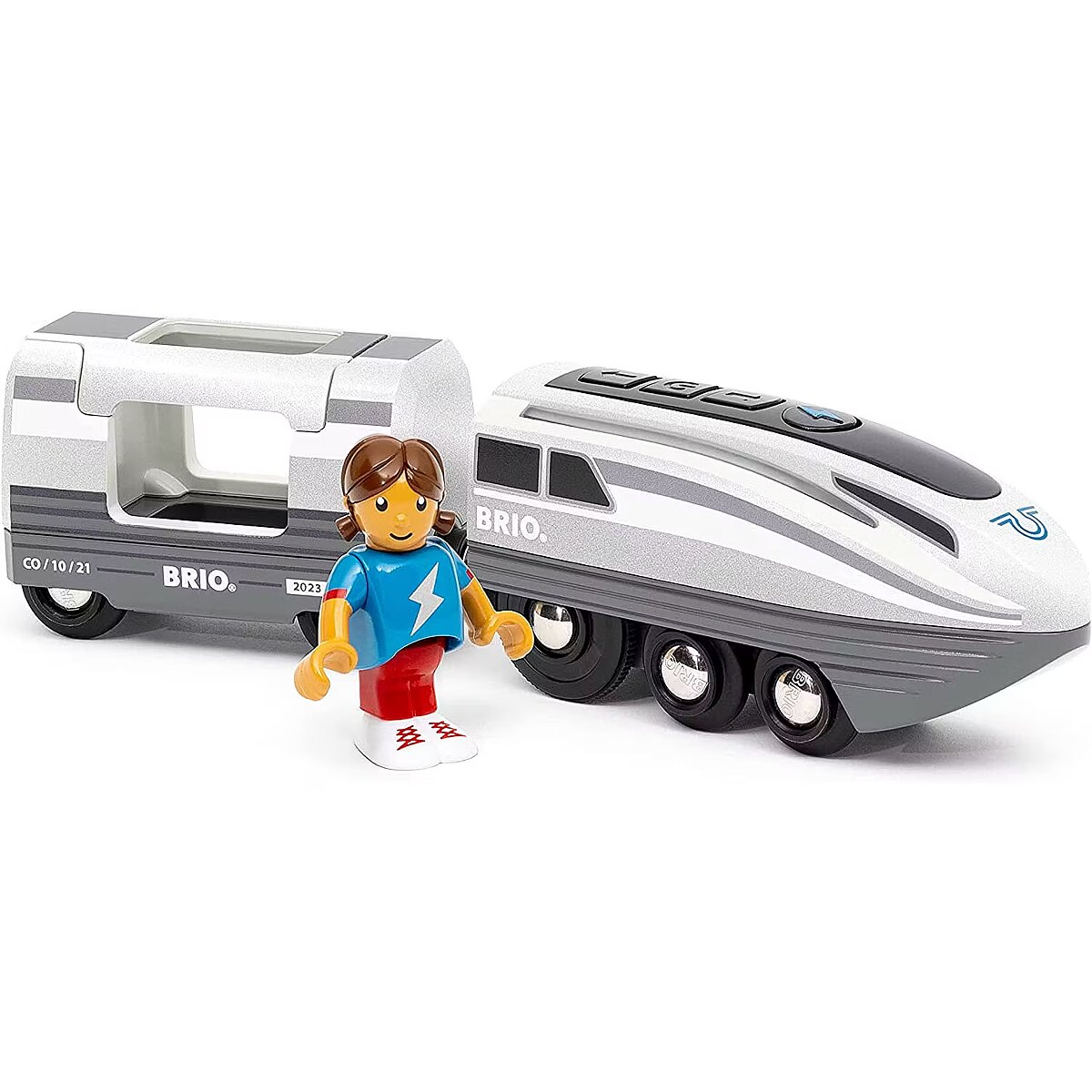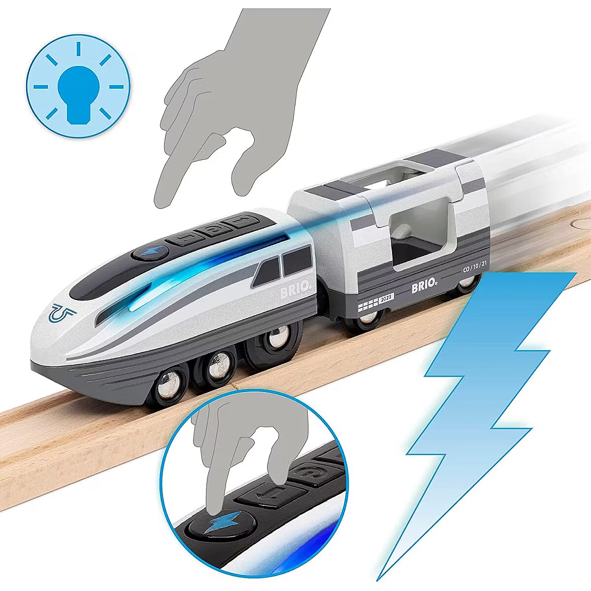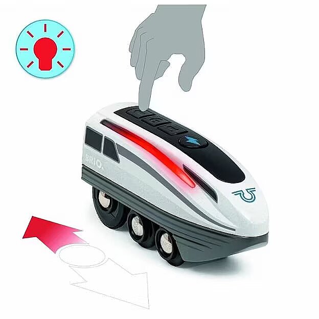 Description - Crank up the speed with the 36003 Turbo Train. Simply press the big turbo button and this battery-operated toy train doubles its speed, making it the fastest train in BRIO World. The turbo boost lasts for 5 seconds and as it runs at top speed, the white lights along the sides of the engine change to a cool blue. This futuristically designed engine also includes a passenger wagon with enough space for one lucky passenger to enjoy an exhilarating ride to remember. About BRIO World: BRIO World is our open-ended play system that grows with your child. All BRIO World toys work with each other to create an entirely customisable world thats great for challenging growing minds. Theres endless combinations of imaginative play waiting to be explored and this toy train fits right in just pick up a piece and start building your world.