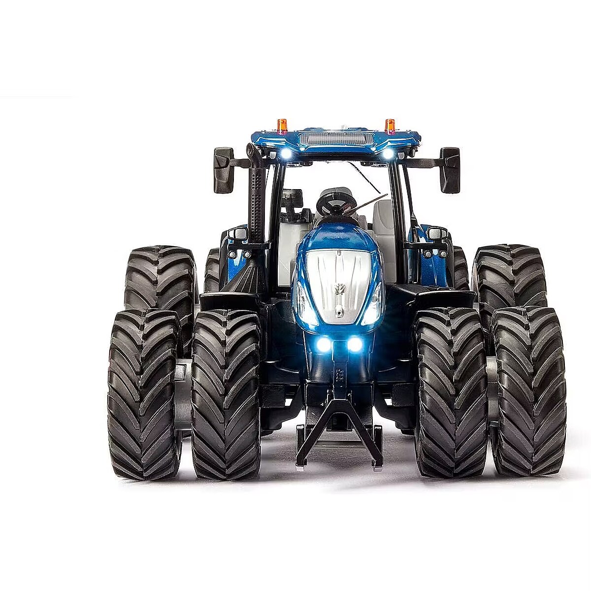 LongDesc - Versatility and strength – those are what the modern T7 Heavy Duty from New Holland represents. More strength, more lifting power, more flexibility, more comfort – the premium tractor in the 7 series was designed for modern agricultural operations requiring the highest standards. With the T7, up to 315 HP are available for using the heaviest working equipment. The very top model among the large tractors is strong enough for traction tasks, soil cultivation, baling, and transport. With Bluetooth control, the New Holland T7 from SIKU CONTROL provides really varied playing fun. Its bodywork is metal, and the interior of the glazed cab is highly detailed. Visually too the large tractor from the SIKU CONTROL series really creates an impression: The special dark blue metallic New Holland colour and the silvered rims emphasise its modern design. The magnetic twin tyres are a highlight and give the model additional stability and a particularly bulky appearance. The integrated magnets make fitting and removing the wheels child’s play. Using the SIKU CONTROL app, the three gears, 12 LEDs, and numerous tractor functions can be operated from a Smartphone or tablet. Driving and steering functions are controlled proportionally – optionally via the virtual gamepad controller or via the movement sensor of the mobile devices. The SIKU CONTROL app can be downloaded free of charge from the App Store and the Google Play Store. Settings and functions of the app are continuously updated. By means of the OTA (over the air) function, all updates for the model are automatically downloaded at the app’s system start. The remotely controlled tractor requires three AAA batteries as the power supply. The siku standard couplings at front and rear mean that the New Holland tractor can be combined with all trailers and accessories from the siku Farmer series.