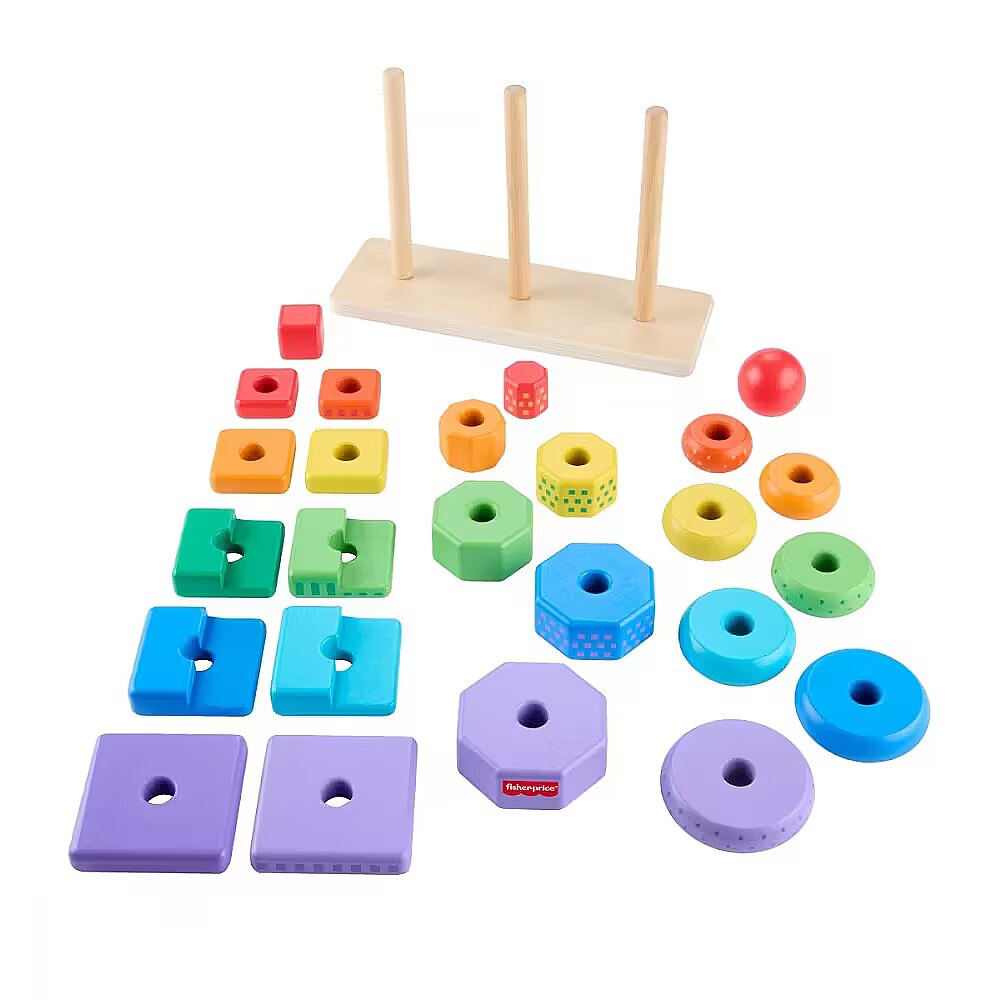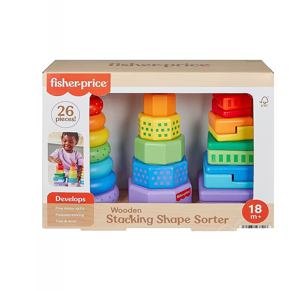 Description - Drewniane piramidki Sorter kształtów Z zestawem Drewniane piramidki Sorter kształtów od Fisher-Price malucha czeka potrójna dawka zabawy! W zestawie są łatwe do chwytania drewniane kółka, ośmiokąty i 2-częściowe kwadraty do sortowania i układania na podstawie. Ta kreatywna zabawka do układania wykonana jest z drewna pochodzącego z prawidłowo zarządzanych lasów z certyfikatem FSC. Zapewnia dużo zabawy oraz wprowadza dzieci w świat kolorów, kształtów i innych odkryć! (FSC C004225, 2021). Drewniana zabawka do sortowania kształtów i układania dla młodszych dzieci. Zestaw wykonany z drewna pochodzącego z prawidłowo zarządzanych lasów z certyfikatem Forest Stewardship Council i dostarczany w opakowaniu bez plastiku (FSC C004225, 2021). Pomaga ćwiczyć zręczność i koordynację ręka-oko. Zawiera 1 podstawę do układania i 25 elementów. Inspirowana metodą Montessori kreatywna zabawka dla dzieci od 18 miesiąca życia.