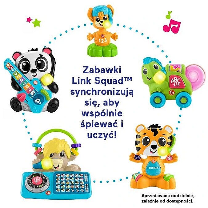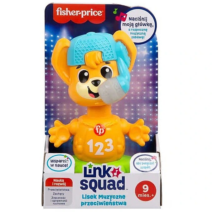 Description - The Fisher-Price Link Squad Musical Opposites Fox is the perfect companion for dancing and learning. When your child presses Fox's head, the animal raises and lowers its paws, and its microphone lights up to the rhythm of cheerful songs, sounds and phrases about opposites and more. And when Fox meets other members of the Link Squad, it lights up with them to sing and learn together! Toy in Polish language version. (Additional toys from the Link Squad line are sold separately, subject to availability. *Fisher-Price Link Squad toys are not compatible with Fisher-Price Linkimals toys).     Interactive Fox with songs, sounds and phrases teaching about opposites and more Press Fox's head to activate paw movements, songs, sounds, phrases and colourful lights The microphone lights up to the beat of the music and encourages your little one to move     Collect the other interactive toys from the Link Squad line to see how they react to each other! (Sold separately, subject to availability)     Helps strengthen motor skills and introduces the principle of cause and effect through play for children from 9 months of age Happy development: welcome every stage of your child's development with a smile! Link Squad toys develop early learning skills, helping children learn and expand their abilities through interactive educational play