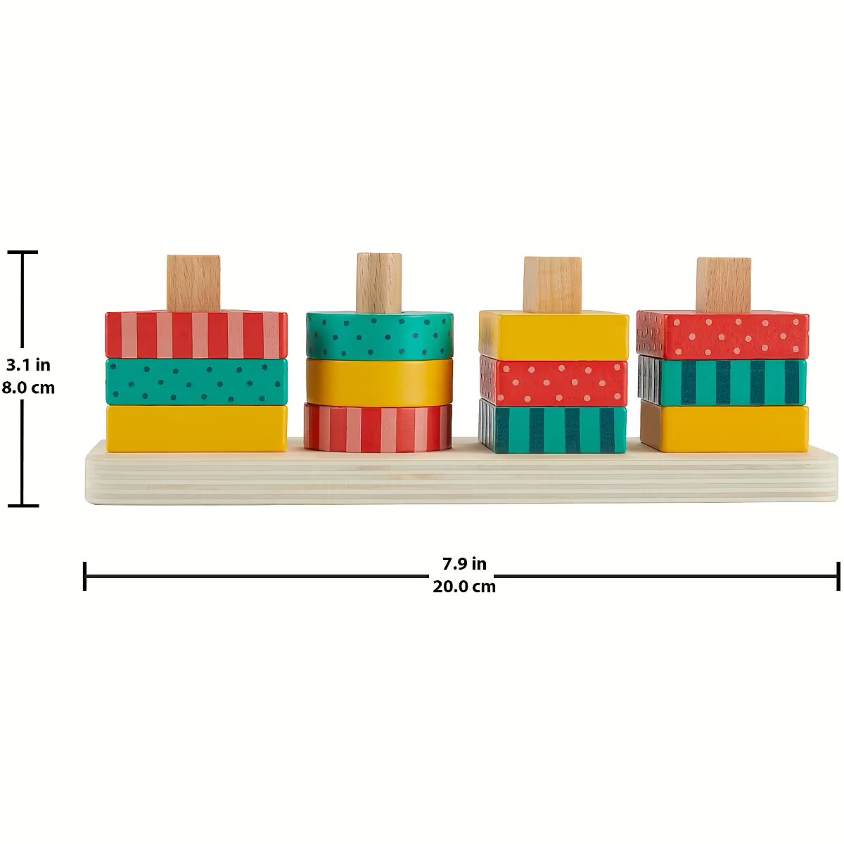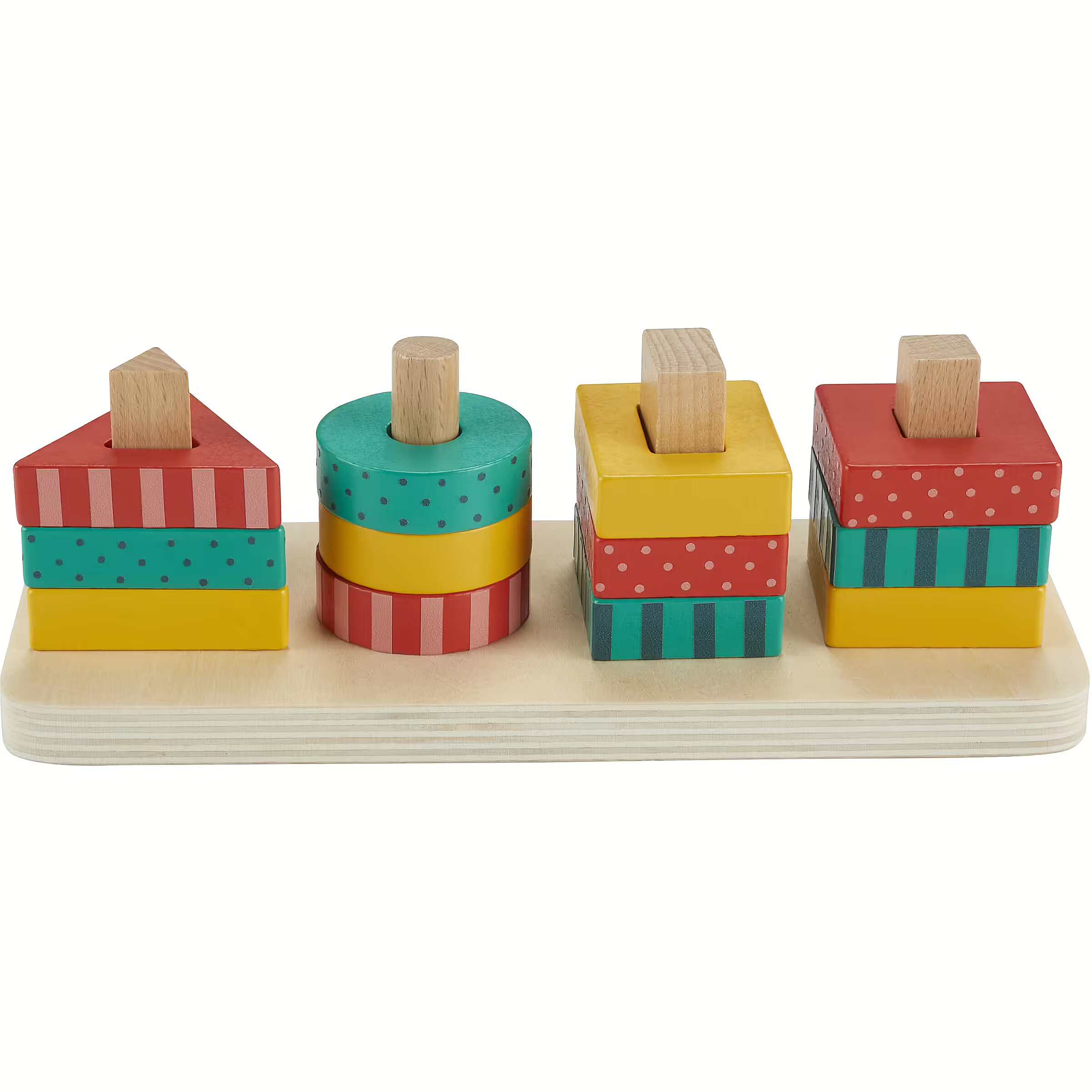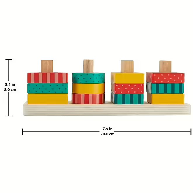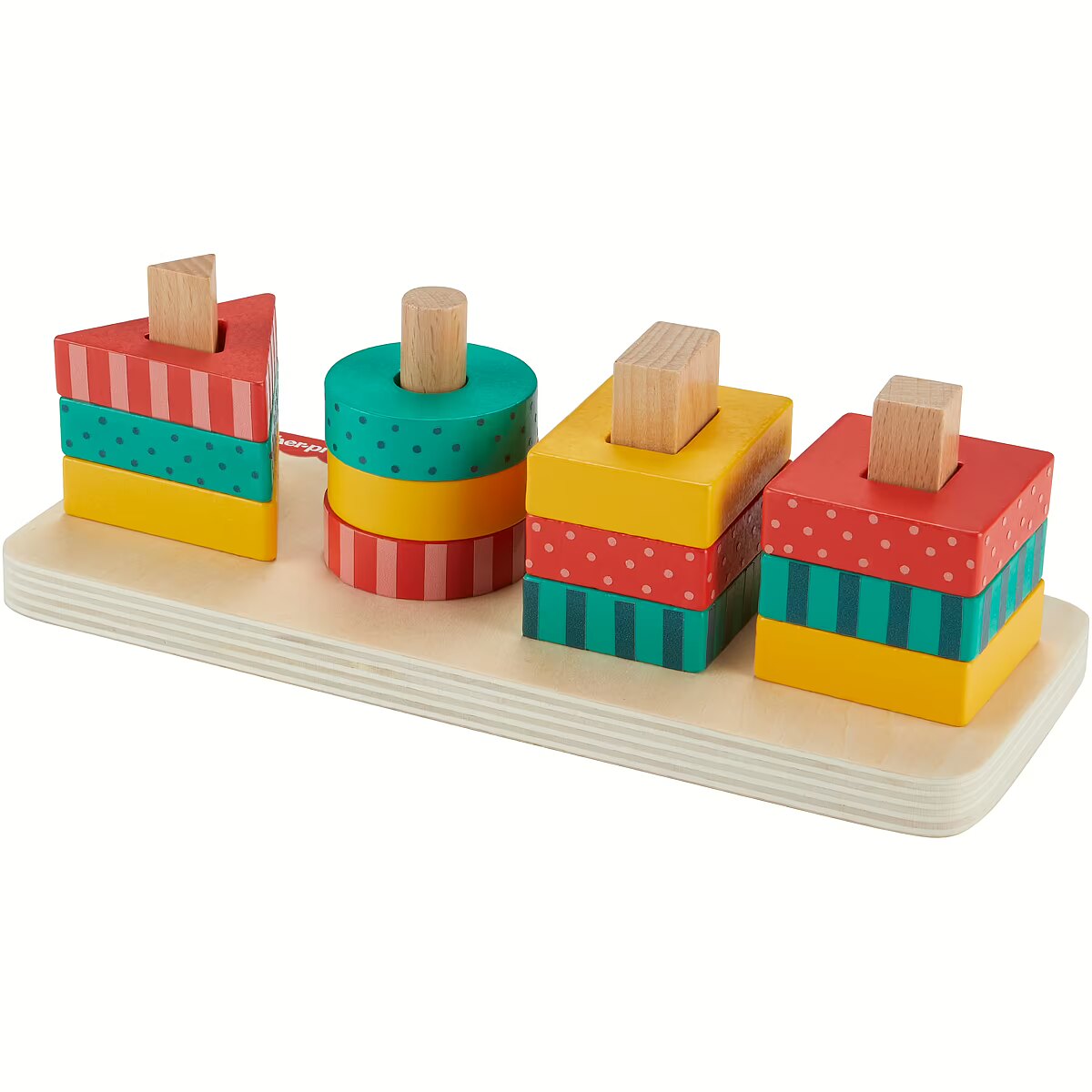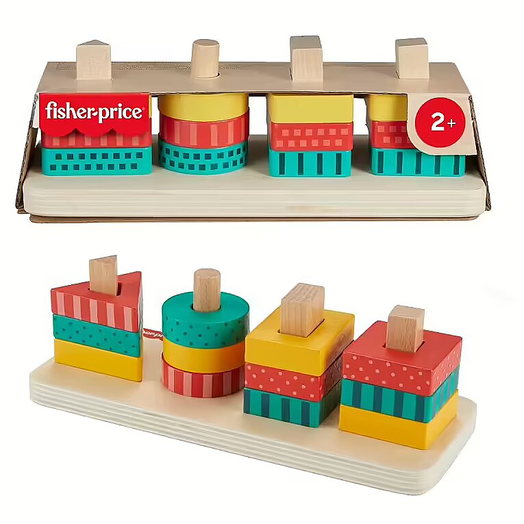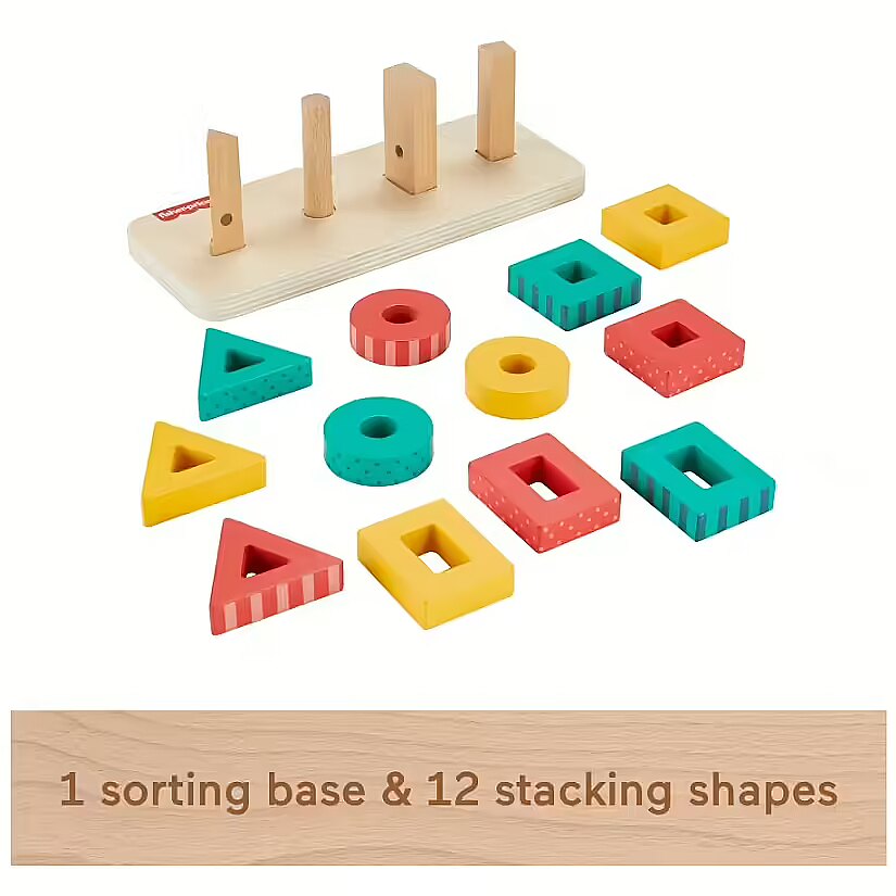 LongDesc - The Wooden Shape Stacker from Fisher-Price features colourful wooden triangles, circles, rectangles and squares for toddlers to sort and stack on to the base. Made with wood from Forest Stewardship Council-certified sources (FSC-N004566) and decorated with non-toxic, water-based paints, this stacking toy helps foster fine motor activities and introduces colours, shapes, counting and more. Colours and decorations may vary.