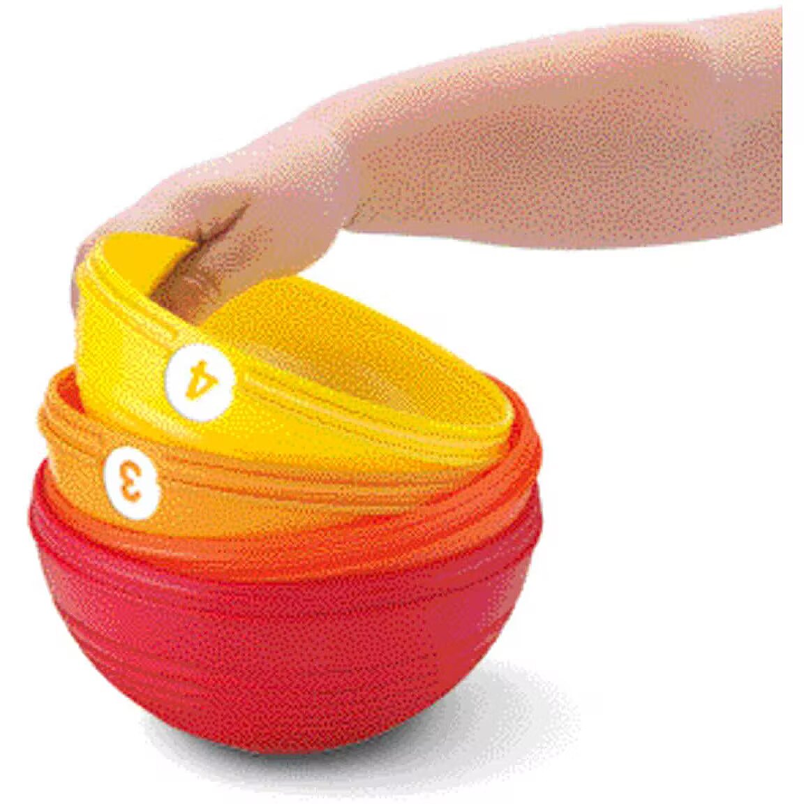 Te naczynka, które można turlać, łączyć oraz wkładać jedno w drugie oferują nieskończenie wiele możliwości odkrywania wielu przydatnych rzeczy. Zestaw zawiera 10 kolorowych naczynek z rowkami umożliwiającymi lepsze dopasowanie i łatwość wkładania. Różne kolory, rozmiary i cyferki pomagają rozwinąć wczesne umiejętności rozpoznawania. Śmiejąca się kula z dzwonkami pasuje do wnętrza każdego naczynka. Można ją też umieścić na szczycie całego stosu!