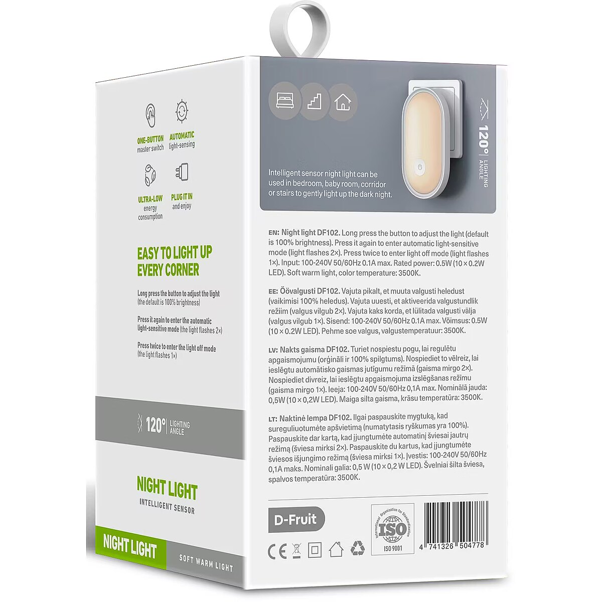 description_en - D-Fruit DF102 is a high-quality LED sensor lamp that is ideal for use as a night lamp in a bedroom, children's room or in a corridor. The light can be conveniently controlled with just one button. By holding down the button for a long time, you can change the brightness of the light (default 100% brightness). By pressing the button again, you can activate the light-sensitive mode, and then by pressing it twice again, the light turns off. High-quality LED sensor lamp Adjustable light brightness Automatic light detection Suitable as a night lamp Illumination angle: 120° Light temperature: 3500 K Input current: 100 - 240 V 50/60 Hz 0.1 A Power: 0.5 W (10 x 0.2 W LEDs)