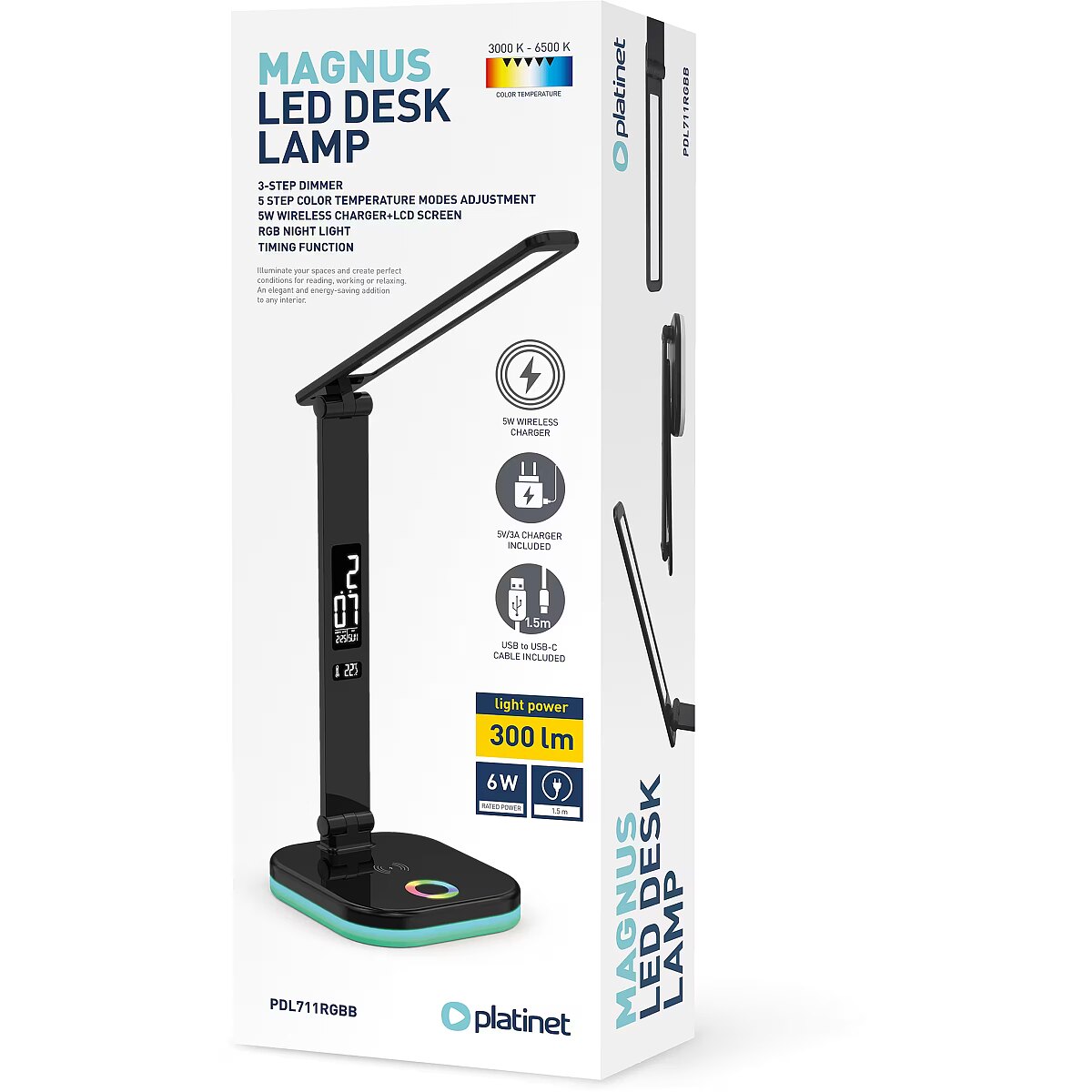description_en - Make your work area or lounge area brighter and smarter with this elegant and energy-efficient LED table lamp. The lamp is perfect for reading, working or relaxing, offering a variety of light modes and practical additional functions for every moment. The lamp's brightness can be adjusted in 3 steps and the color temperature can be set in 5 steps between 3000 and 6500 K. This way, you can adapt the light to the situation - warm light creates a cozy atmosphere, while a cooler tone supports concentration and work. In addition, the lamp has an RGB night light mode to create a mood, which is perfect for a bedroom or children's room. As a practical addition, the table lamp includes a 5 W wireless charger, with which you can conveniently charge your smartphone directly on the lamp base. The integrated LCD display shows the time, date and temperature in real time. The lamp also has an alarm clock function, which makes it a great choice as a bedside lamp. LED desk lamp Power: 6 W Luminous intensity: 300 lm Color temperature: 3000–6500 K (5 levels) Dimensions: 3 levels Wireless charging: 5 W RGB night light + timing function LCD display shows time, date and temperature Alarm clock function Base dimensions: 12.2 × 17.2 cm Height: 28 cm Lamp head length: 29 cm Includes 5 V/3 A power adapter and 1.5 m USB – USB-C cable