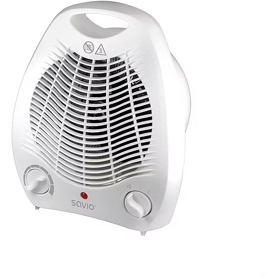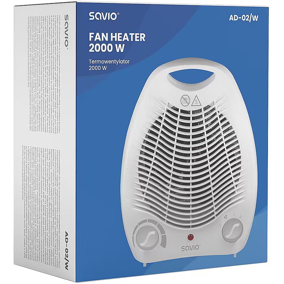 Description - Fan Heater 2000 W AD-02/W The Savio AD-02/W fan heater is a fast and convenient source of warmth wherever you need it most. Perfect for your home, office, garage or even travel. Compact, safe and easy to use. Operating modes: Cool, Warm, Hot Choose between three airflow levels: cool air for ventilation on hot days and two heating levels for chilly evenings and cold winter mornings. A device that keeps you comfortable all year round. Heating power: 1000 W / 2000 W Two power settings let you adjust heating to your space and needs. The lower power (1000 watts) is ideal for cost-efficient heating of smaller rooms. The higher power (2000 watts) ensures fast and effective heating of larger areas. Tip-over switch A built-in safety switch immediately cuts off power if the heater is accidentally tipped over. This provides essential protection, especially if you have children or pets. The overheating protection system automatically turns the device off if the internal temperature rises too high, so you can use it comfortably and worry-free. Built-in thermostat (temperature adjustment) The adjustable thermostat lets you set your preferred temperature, and the heater automatically maintains it. You save energy and avoid overheating the room.