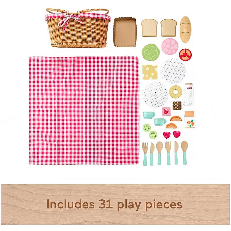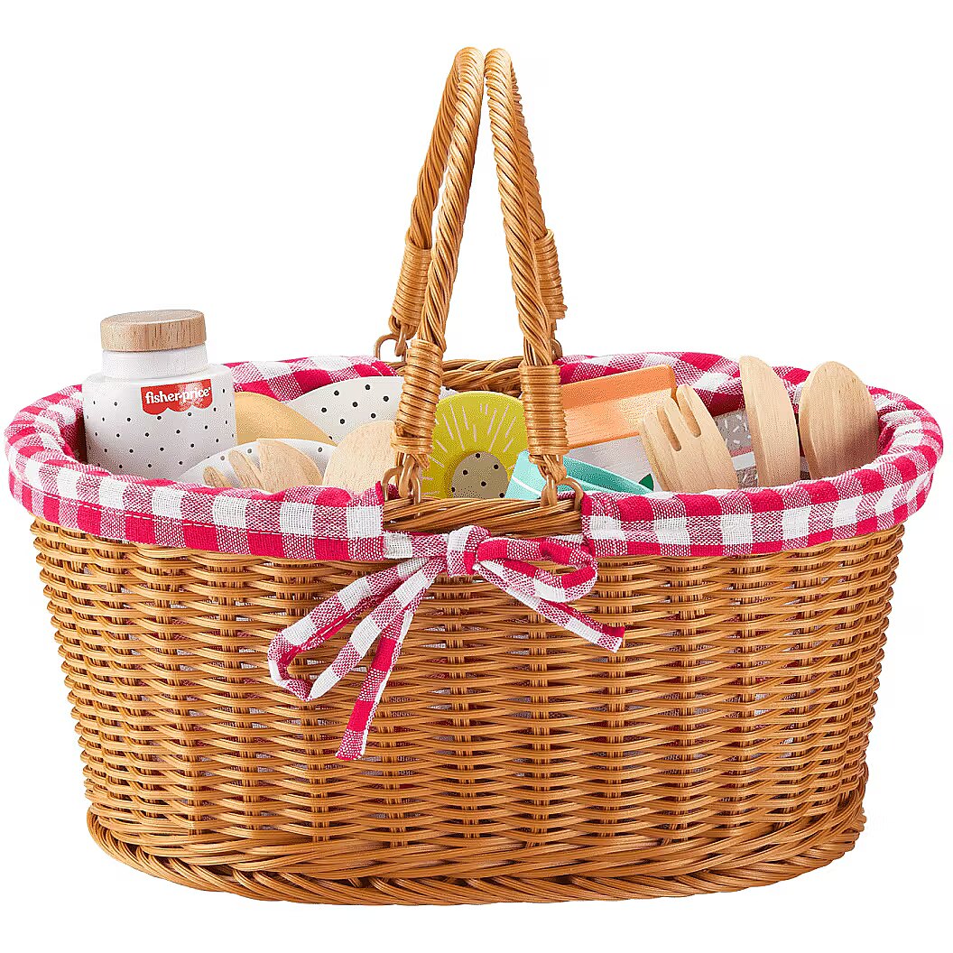 LongDesc - Preschool kids can pack up and head out on endless “outdoor” adventures with this wooden picnic basket and pretend food playset from Fisher-Price. This 31-piece set has everything kids need for a deliciously fun picnic, including plates, cups, cutlery, 17 play food pieces, a cozy gingham blanket and a basket to carry it all. Made with wood from Forest Stewardship Council-certified sources (FSC-N004566) and decorated with non-toxic, water-based paints, this wooden toy set offers fresh role-play fun for your preschooler. Colours and decorations may vary.