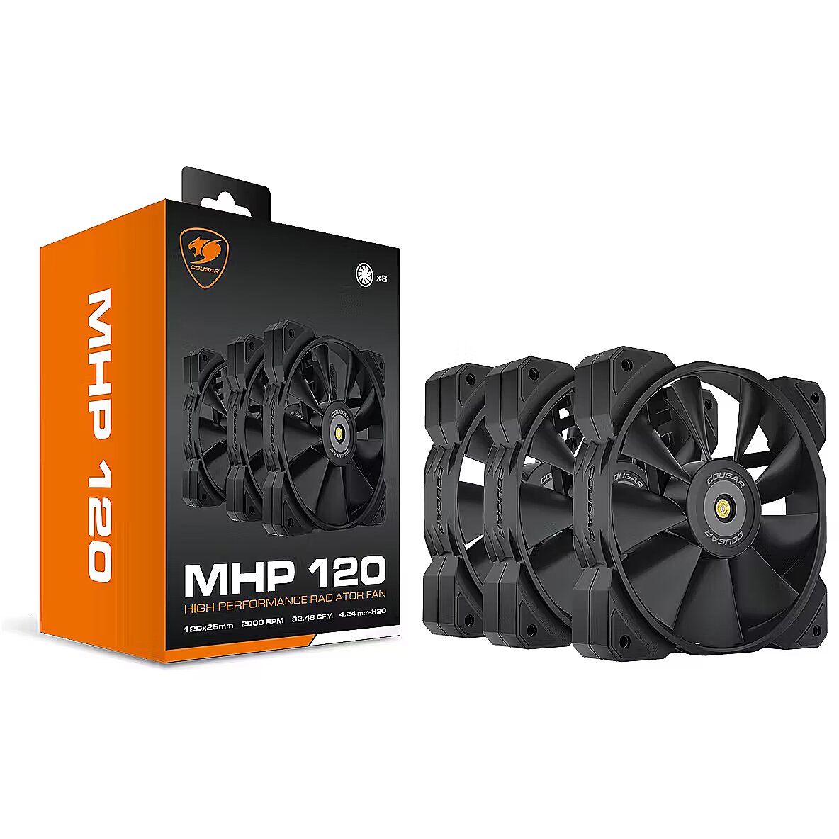 LongSummaryDescription - COUGAR MHP 120. Type: Fan, Product colour: Black, Fan connector: 4-pin. Width: 120 mm, Depth: 120 mm, Height: 25 mm. Quantity per pack: 3 pc(s), Package width: 190 mm, Package depth: 140 mm. Rated current: 0.23 A, Fan voltage: 12 V