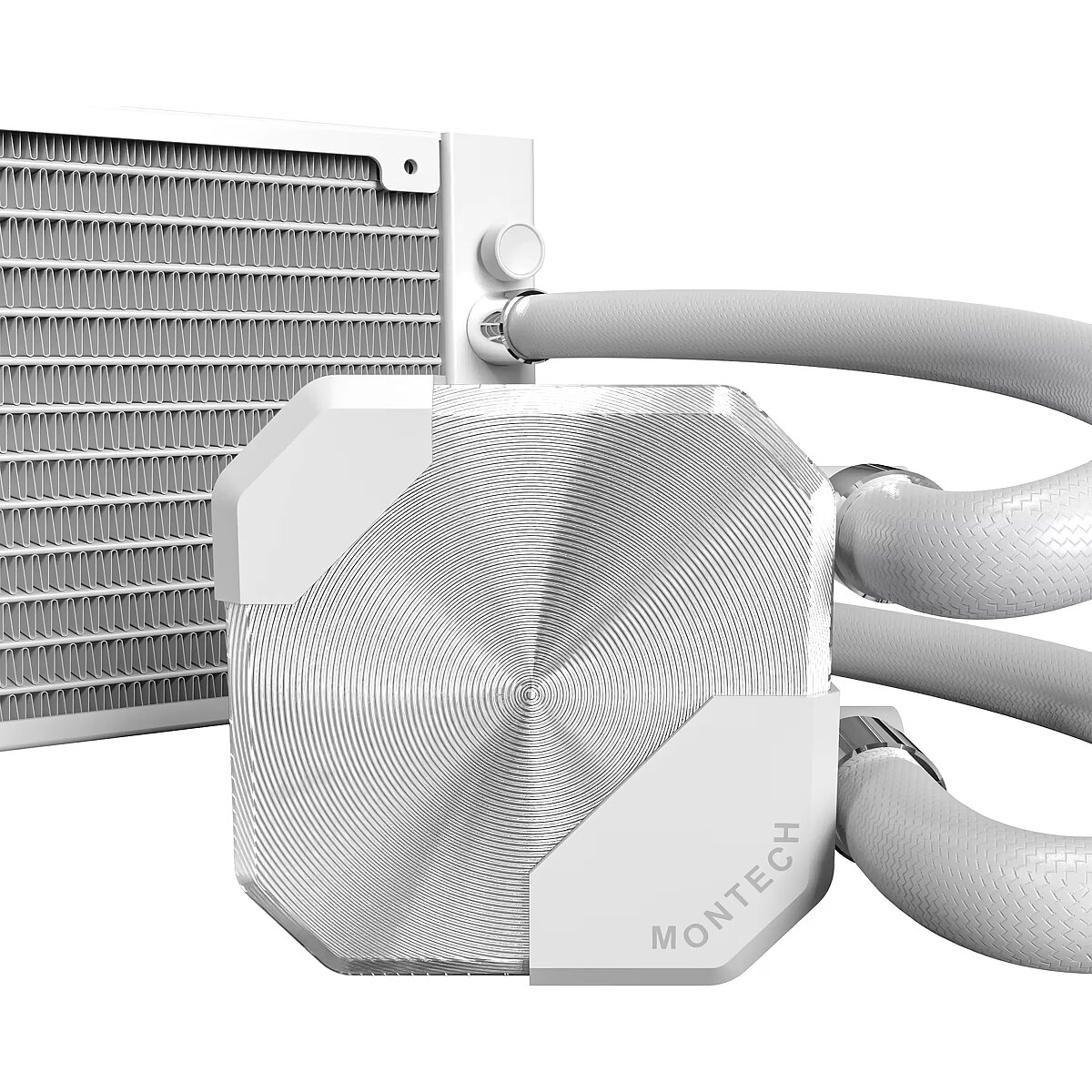 Summary - Montech HyperFlow Silent 240. Type: All-in-one liquid cooler, Fan diameter: 12 cm, Airflow: 129.5 m³/h, Maximum air pressure: 3.12 mmH2O, Bearing type: Fluid Dynamic Bearing (FDB). Product colour: White