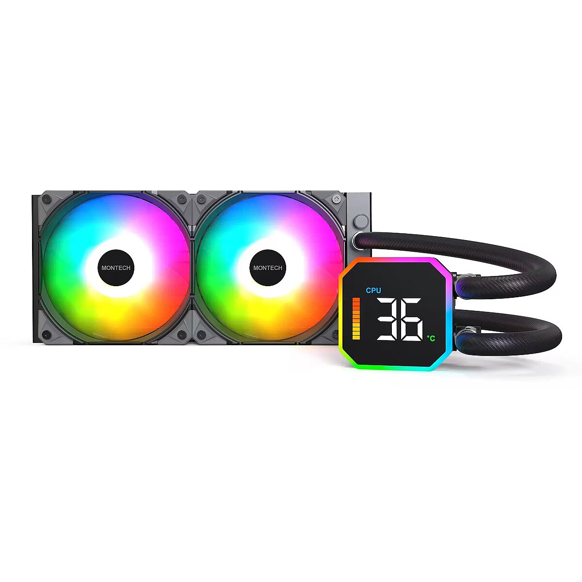 Summary - Montech HyperFlow Digital 240. Type: All-in-one liquid cooler, Fan diameter: 12 cm, Airflow: 129.5 m³/h, Maximum air pressure: 96.27 mmH2O, Bearing type: Fluid Dynamic Bearing (FDB). Product colour: Black